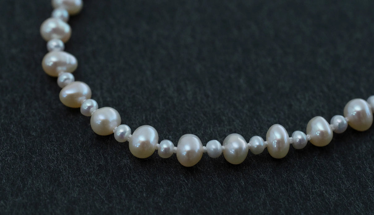 ※こちらはオールノットと呼ばれる、珠と珠の間に結び目を入れながらパール同士を繋いでゆく丁寧な糸通しの方法によって、ネックレスの動きが大変しなやかな仕上がりとなっています。
