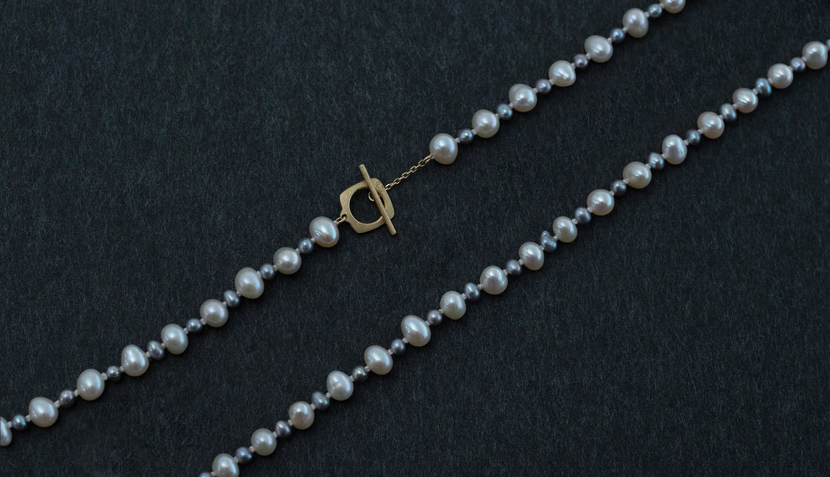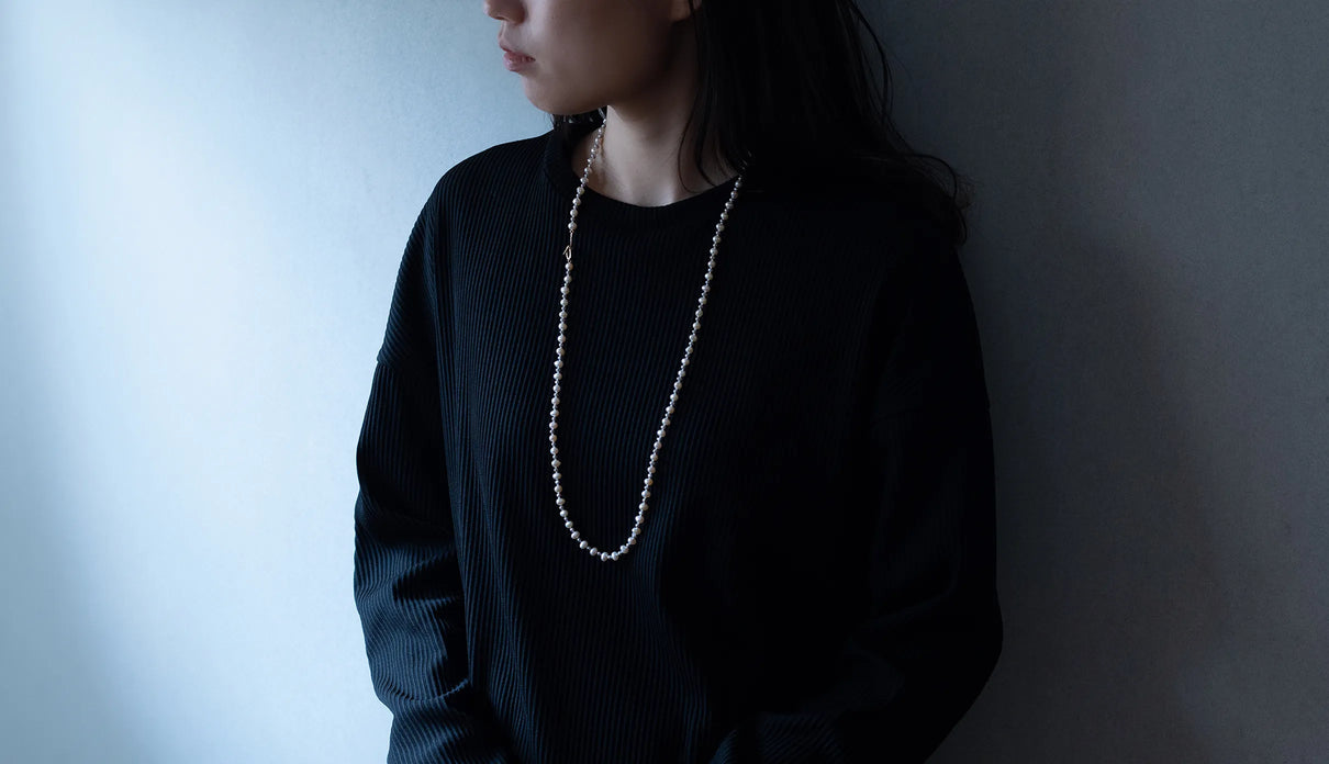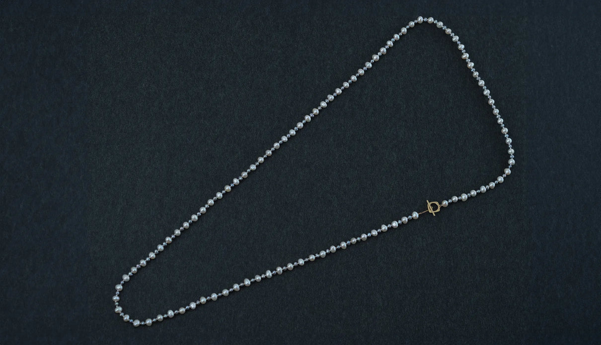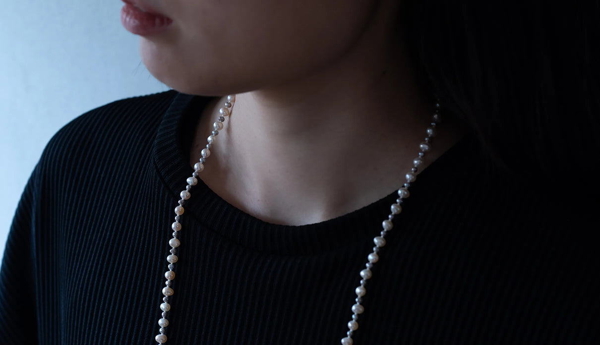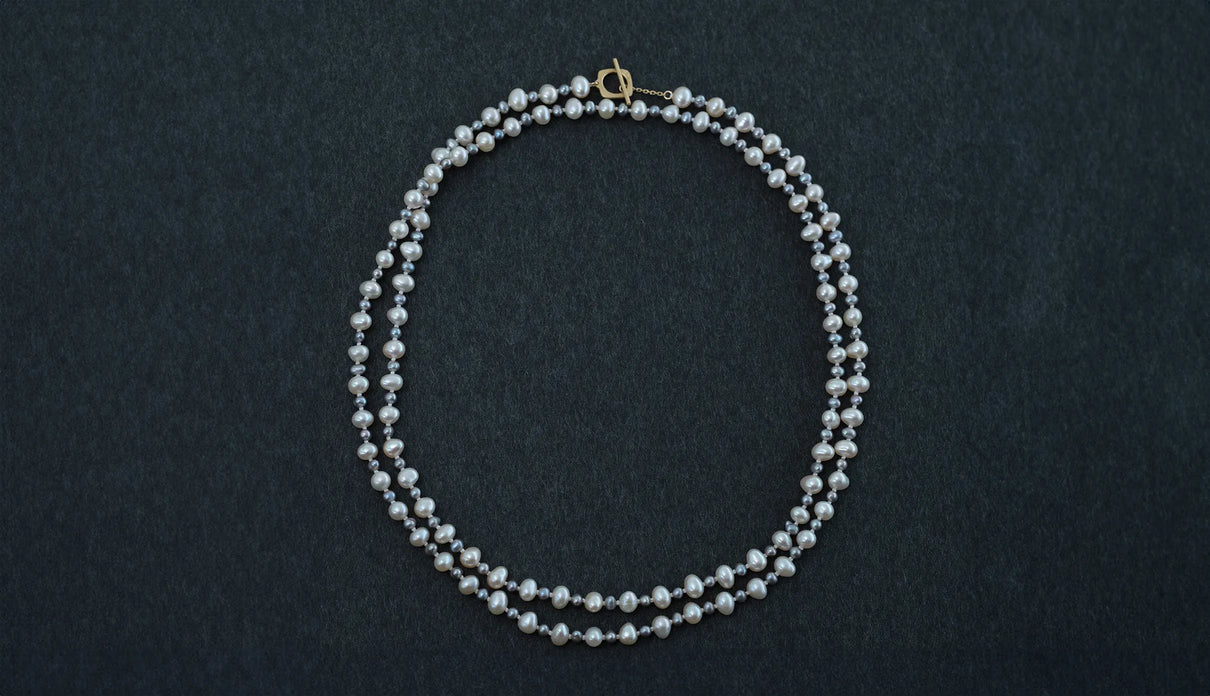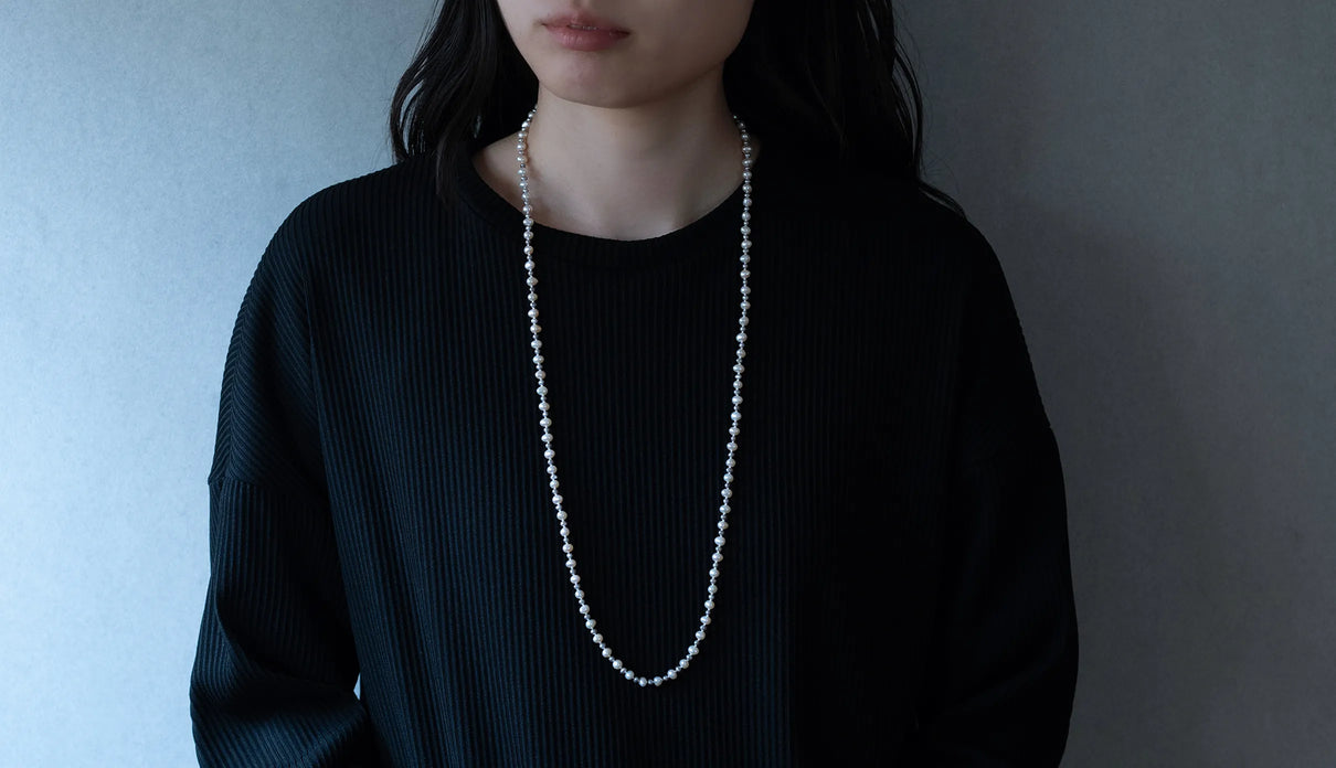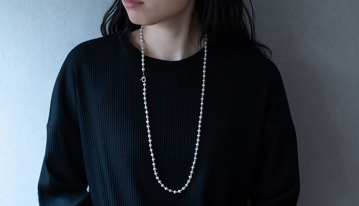 色味も大きさも異なるパールを交互に配したロングネックレス。美しく艶めく上質なホワイトパールの間に寄り添う小粒のグレーパールが繊細なリズムを描きます。オリジナルのマンテルパーツは従来のものよりも小ぶりなサイズかつK18イエローゴールドで仕立て、ネックレス全体のアクセントとなり、巻きつけるように身に着けることで、二重にしてもお愉しみいただけます。フォーマルシーンだけでなく、日常の装いも華やかに演出してくれるデザインです。