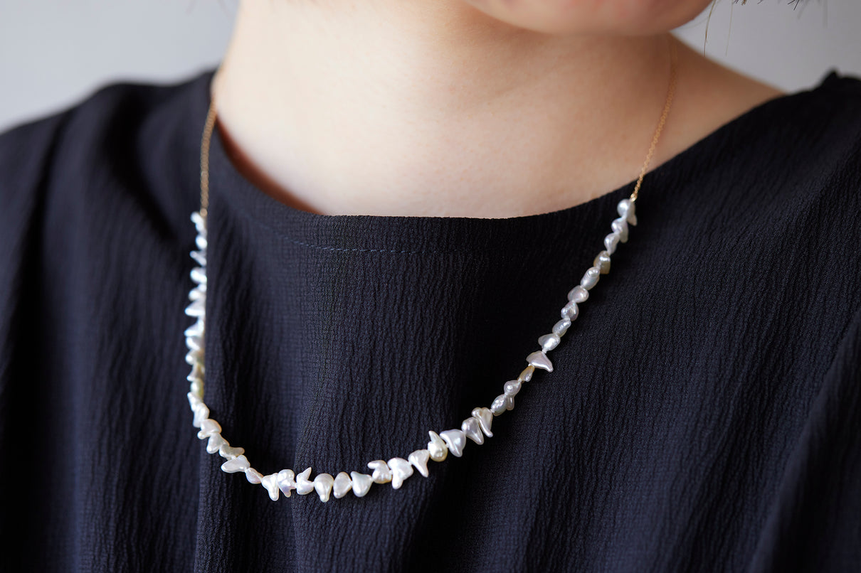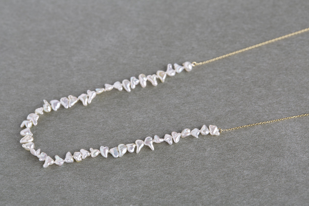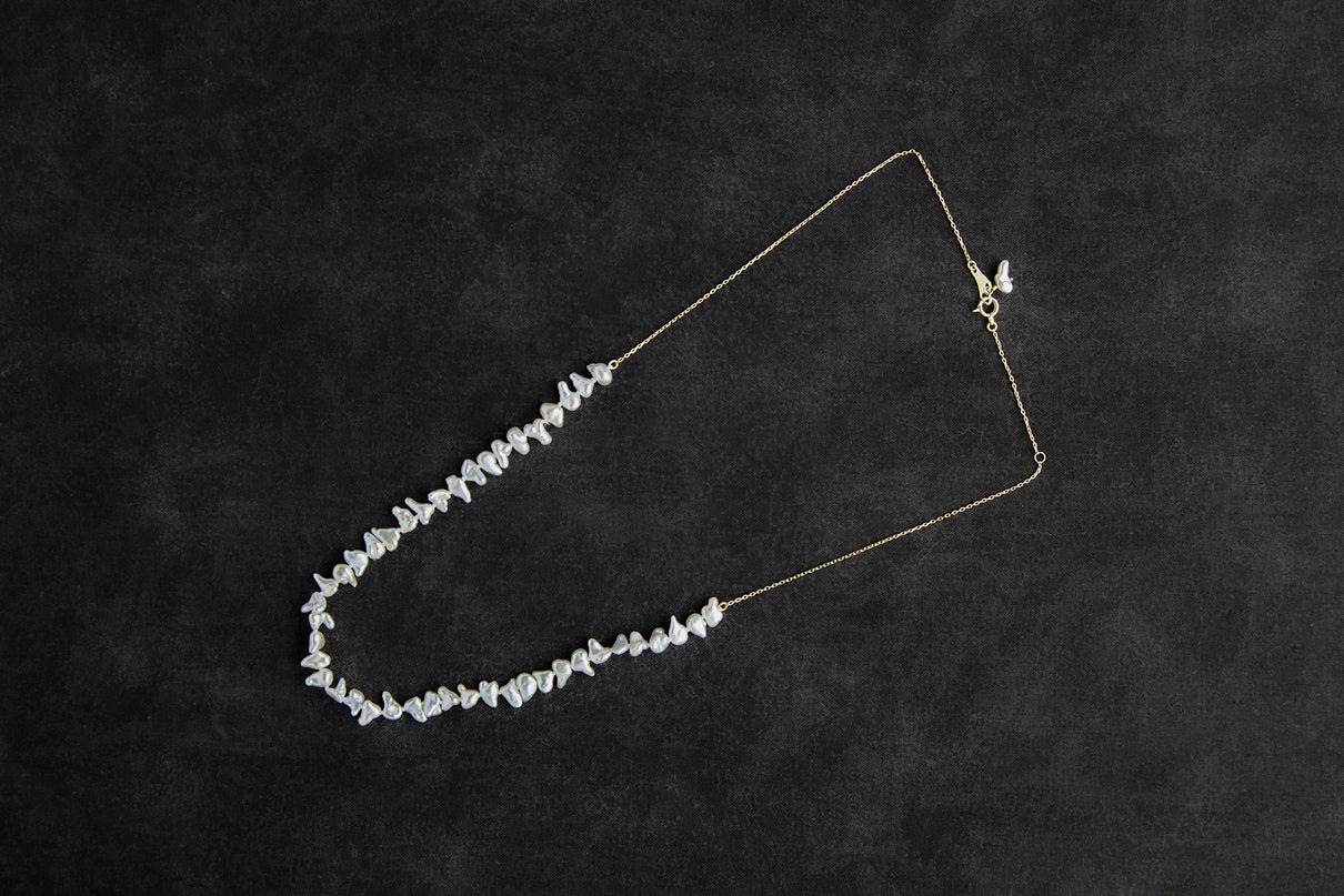 照りの美しいアコヤのケシパールと、華奢なゴールドチェーンで軽やかに仕立てたネックレス。アコヤパールならではの強い照りを放つホワイトカラーのケシパールは、一つひとつがツノのような有機的な形をしていて、シンプルながらもユニークで個性が光ります。プレート部分にぶら下がり揺れる、ひと粒のケシパールも後ろ姿のアクセントに。少し長めの45cmでの仕立ての為、色々な装いに合わせて頂けます。