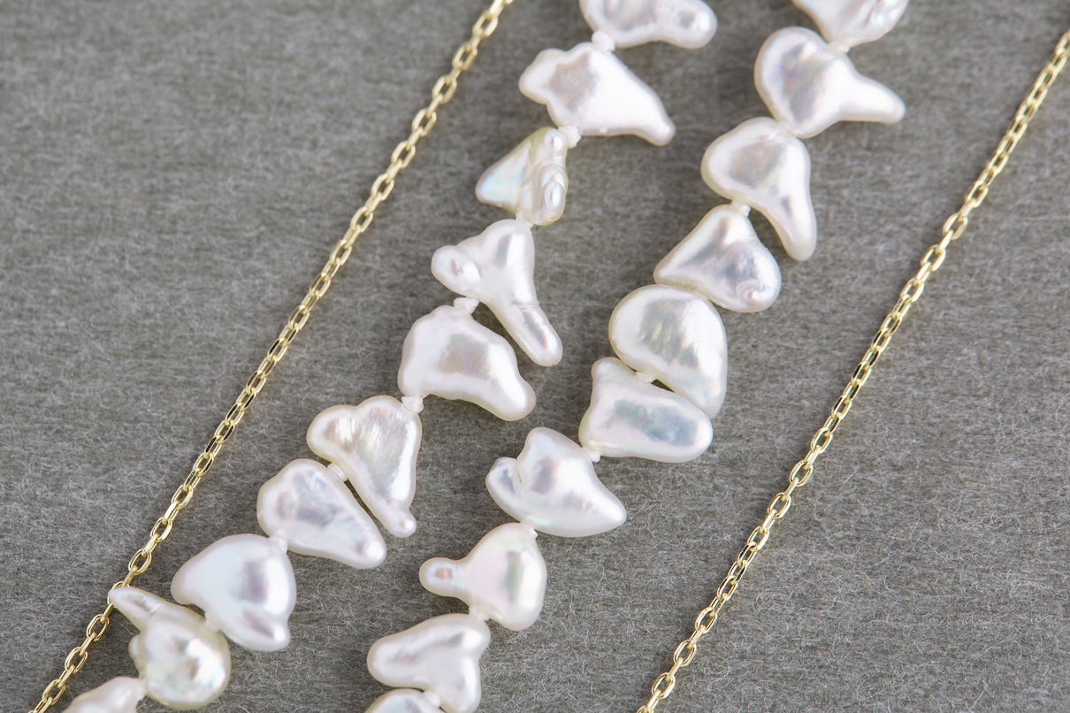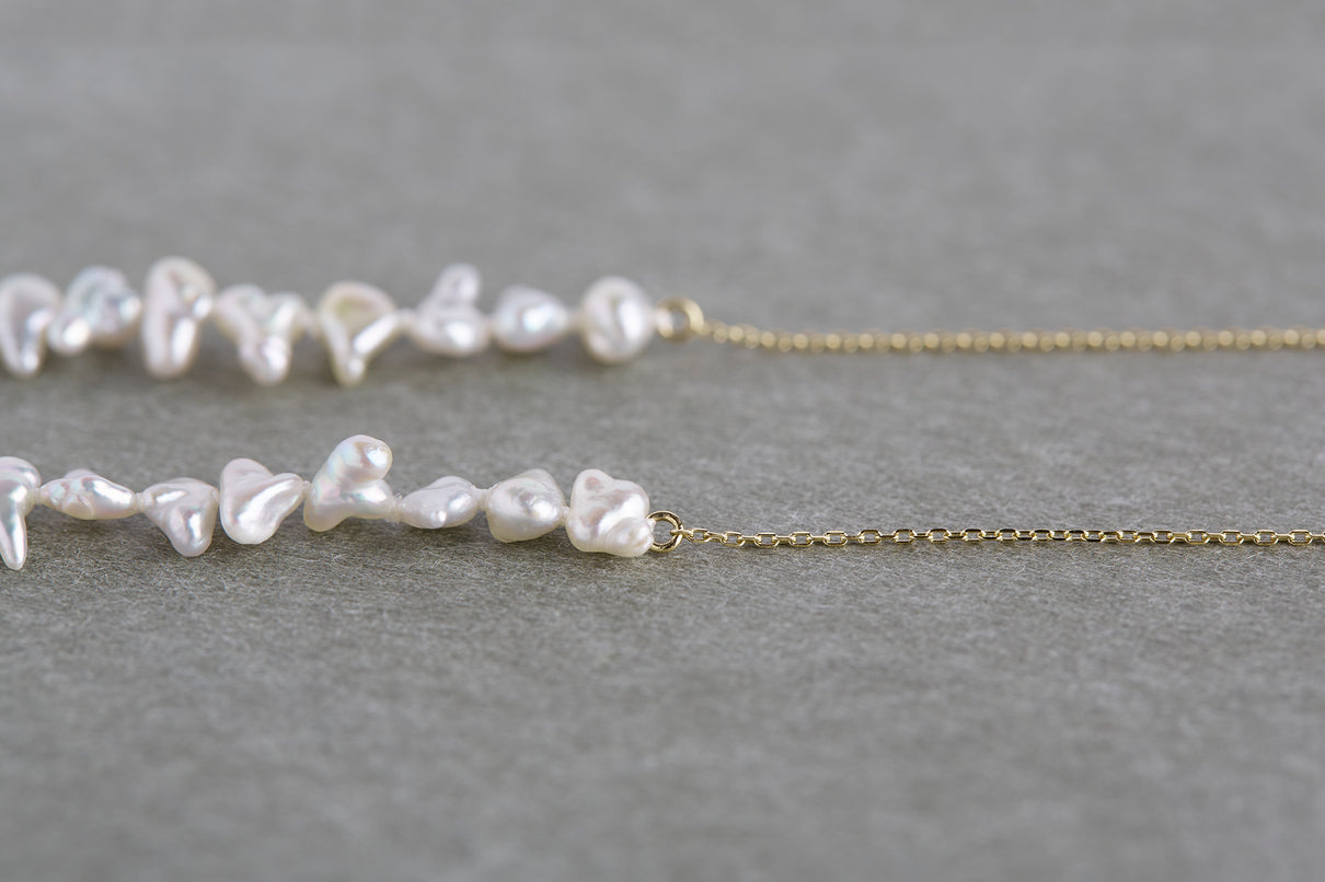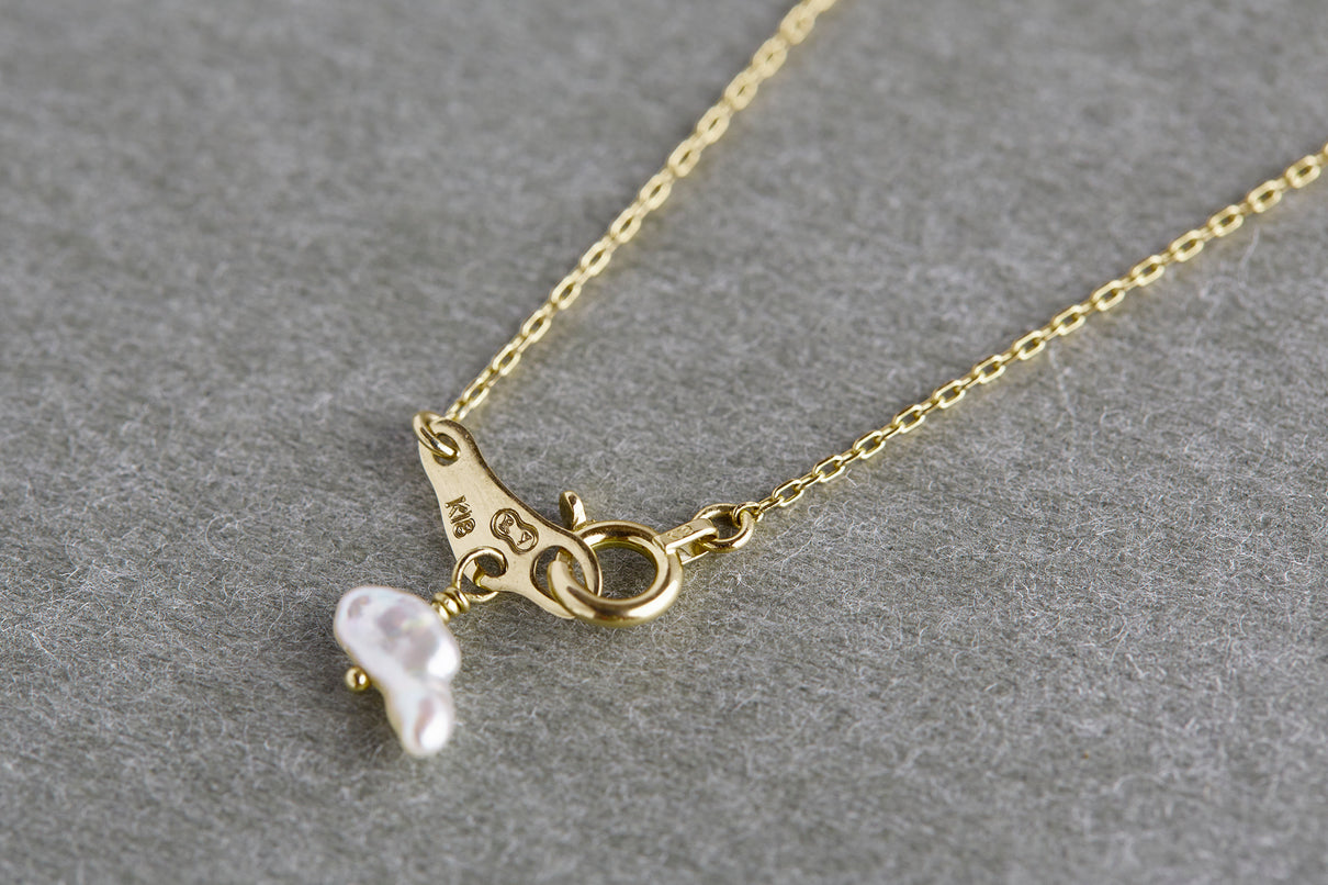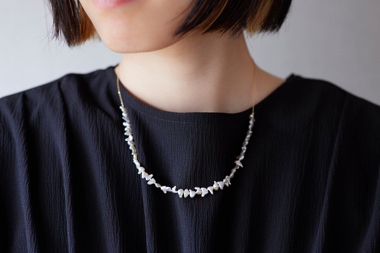 照りの美しいアコヤのケシパールと、華奢なゴールドチェーンで軽やかに仕立てたネックレス。アコヤパールならではの強い照りを放つホワイトカラーのケシパールは、一つひとつがツノのような有機的な形をしていて、シンプルながらもユニークで個性が光ります。プレート部分にぶら下がり揺れる、ひと粒のケシパールも後ろ姿のアクセントに。少し長めの45cmでの仕立ての為、色々な装いに合わせて頂けます。