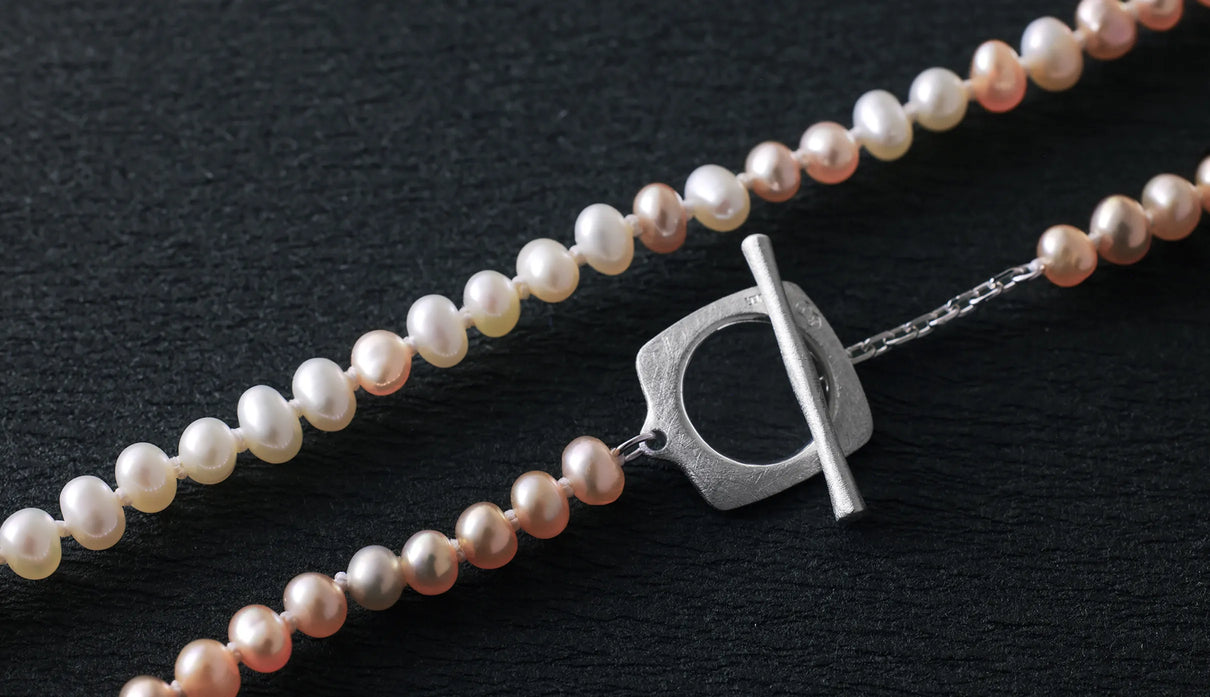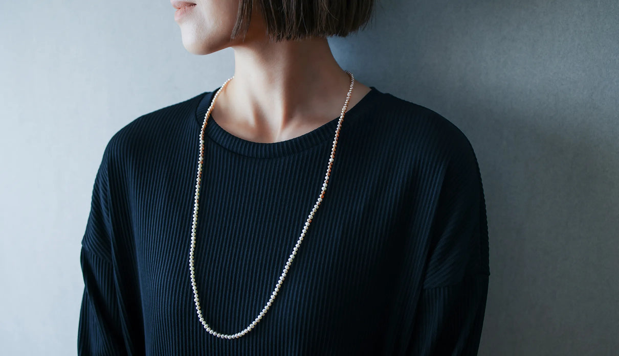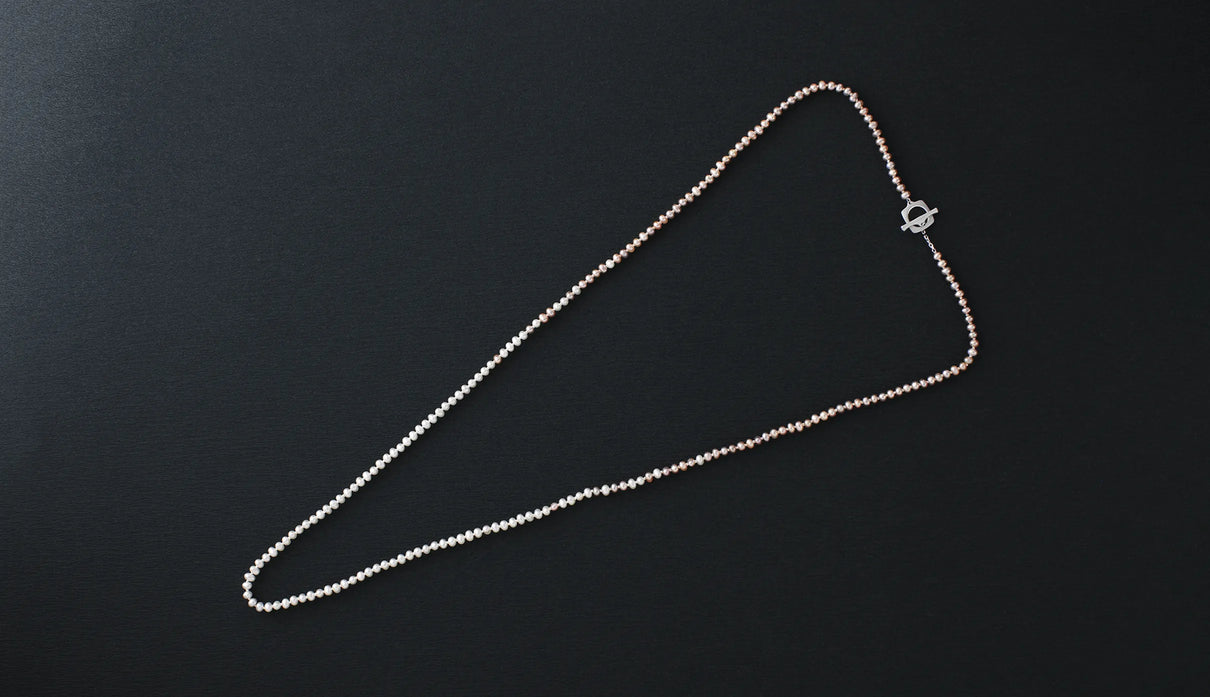 小粒のホワイトパールとピンクパールを連ねた、80cmのロングネックレス。色の境目を曖昧にすることで、グラデーションのようにそっと移ろう色合いをつくり出しています。淡い白とやさしいピンクが混じり合いながら、肌の上にやわらかな光を落とす佇まい。