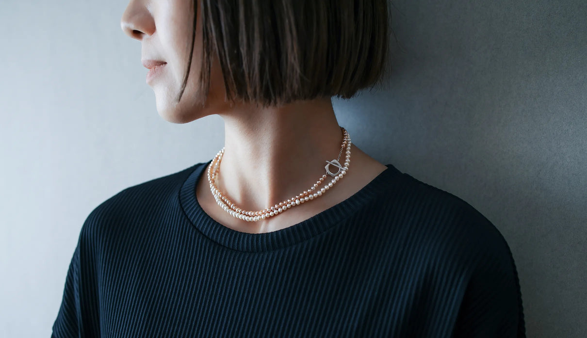 そのまま一連で自然な余白を残して身に着けても、二重にしてさりげなく表情を添えても、装いに繊細なニュアンスをもたらします。留め具には、Ryuiオリジナルのシルバーマンテルを使用。前に見せればさりげないアクセントに、後ろに回せば静かな佇まいにと、気分に合わせて表情を変えられます。上質さの中に、やわらかい遊び心をそっと宿すパールネックレスです。