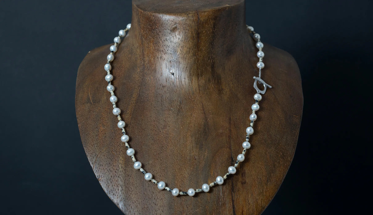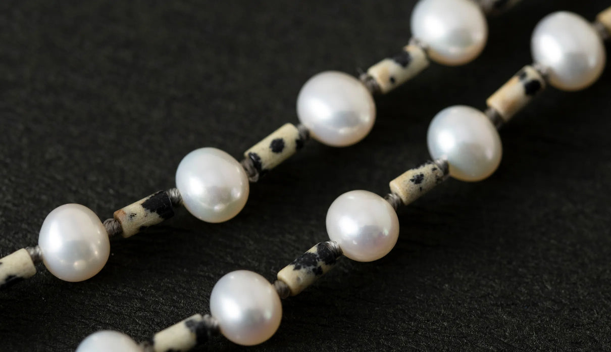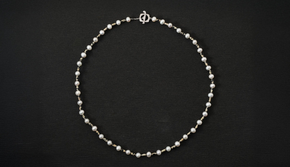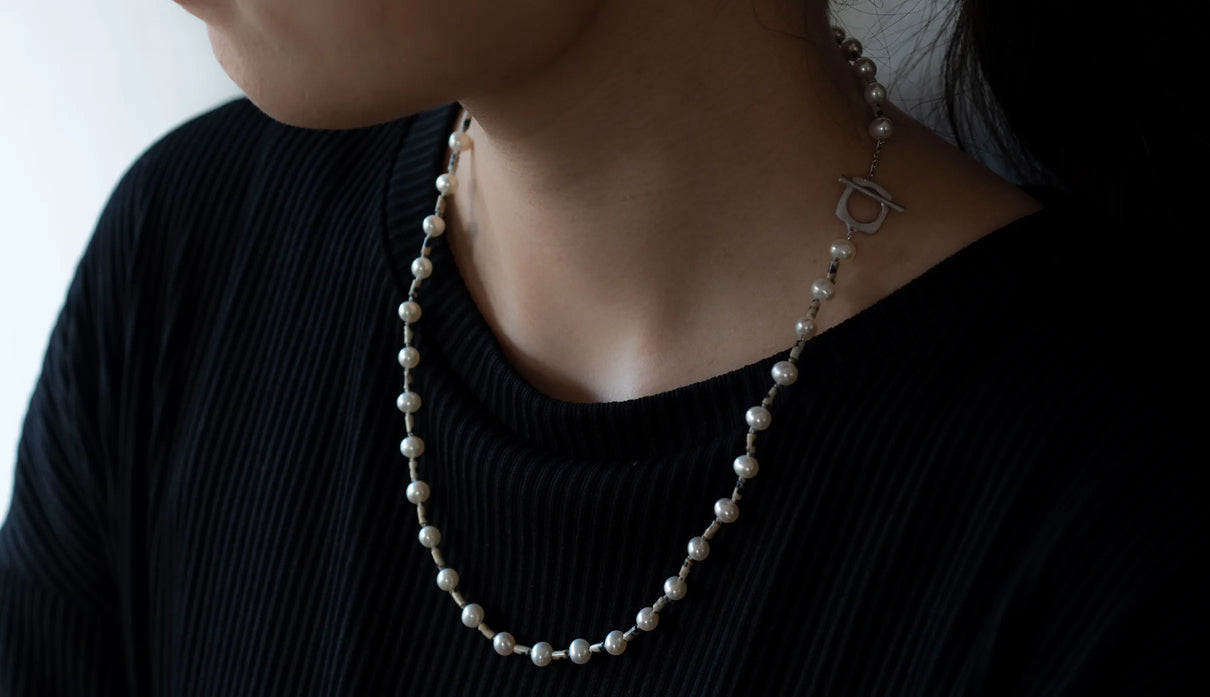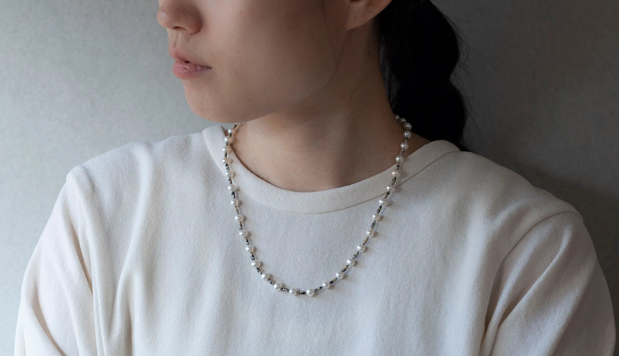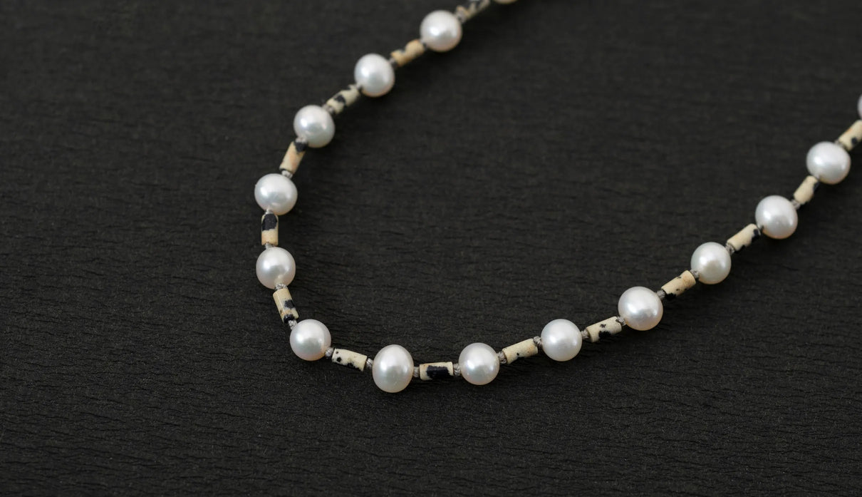 ホワイトパールとダルメシアンジャスパーを交互に連ねた、50cmのネックレス。セミラウンドの美しい艶を持つパールに、表情豊かなジャスパーを合わせることで、上品さの中にさりげない遊び心が生まれています。糸は、印象をひと匙引き締めるグレーを選びました。規則的なリズムの中に自然の揺らぎが重なり、装いに軽やかさを添える佇まいです。留め具には、Ryuiオリジナルのシルバーマンテルを使用。前に見せてアクセントとしても、後ろに回して静かな印象としても、お好みに合わせてお楽しみいただけます。