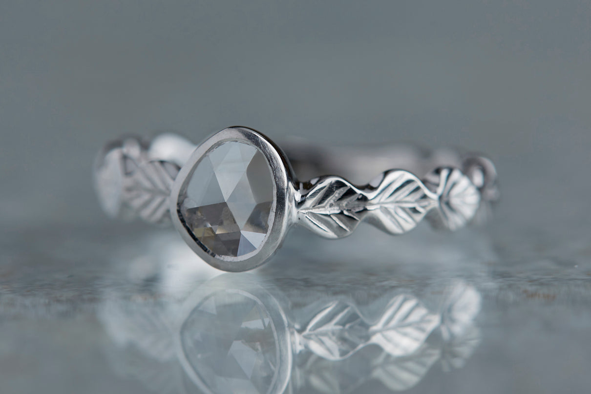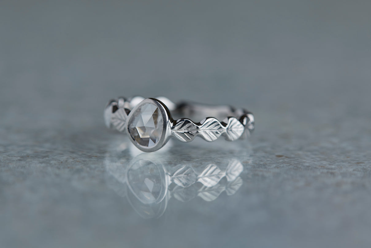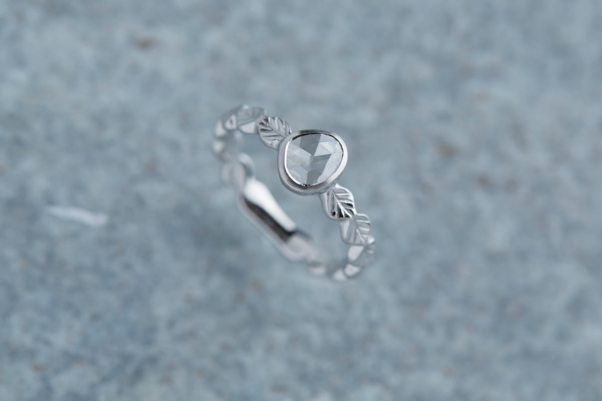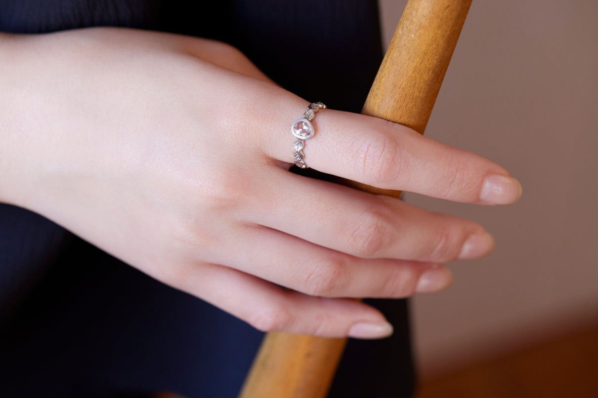 いくつも連なる葉っぱをモチーフに、1枚1枚わずかに異なる表情に遊び心を込めたLeafシリーズ。原石のフォルムを生かしてカットされた左右非対称のユニークなダイヤモンドのローズカットの美しいルースを、ベゼルセッティング(覆輪留め)で仕立てた1点物のリングです。大ぶりで華やかな煌めきを放つダイヤモンドリングは、日常的に身に着けていただくのはもちろん、特別な贈りものにも最適です。