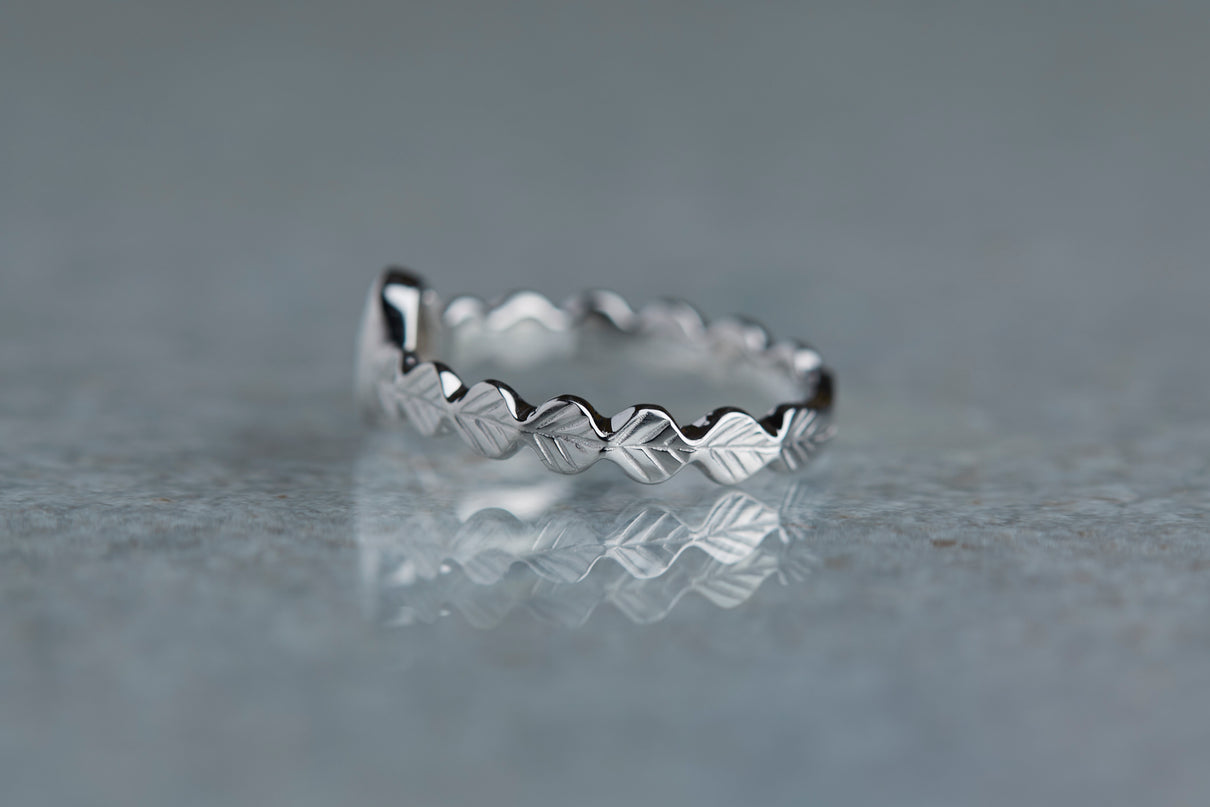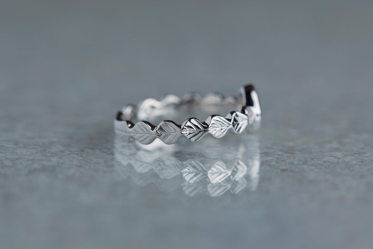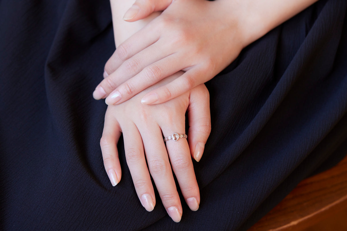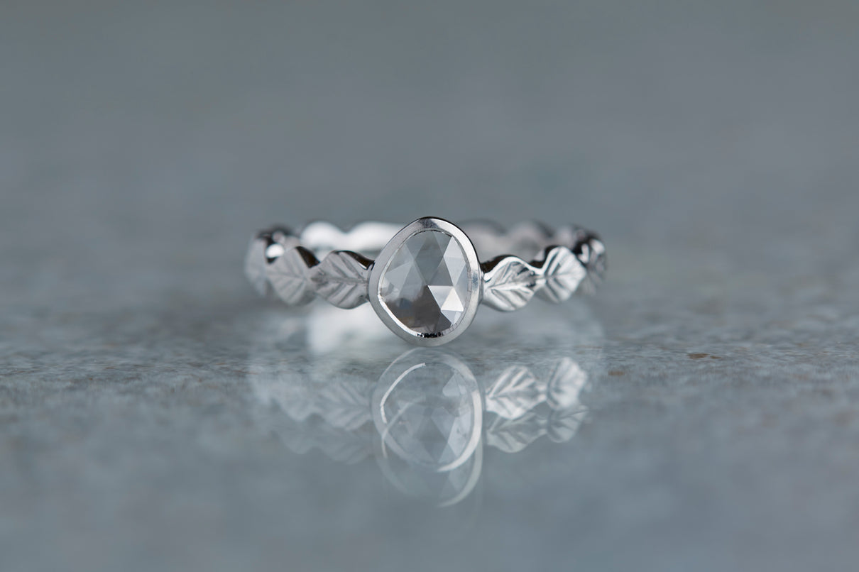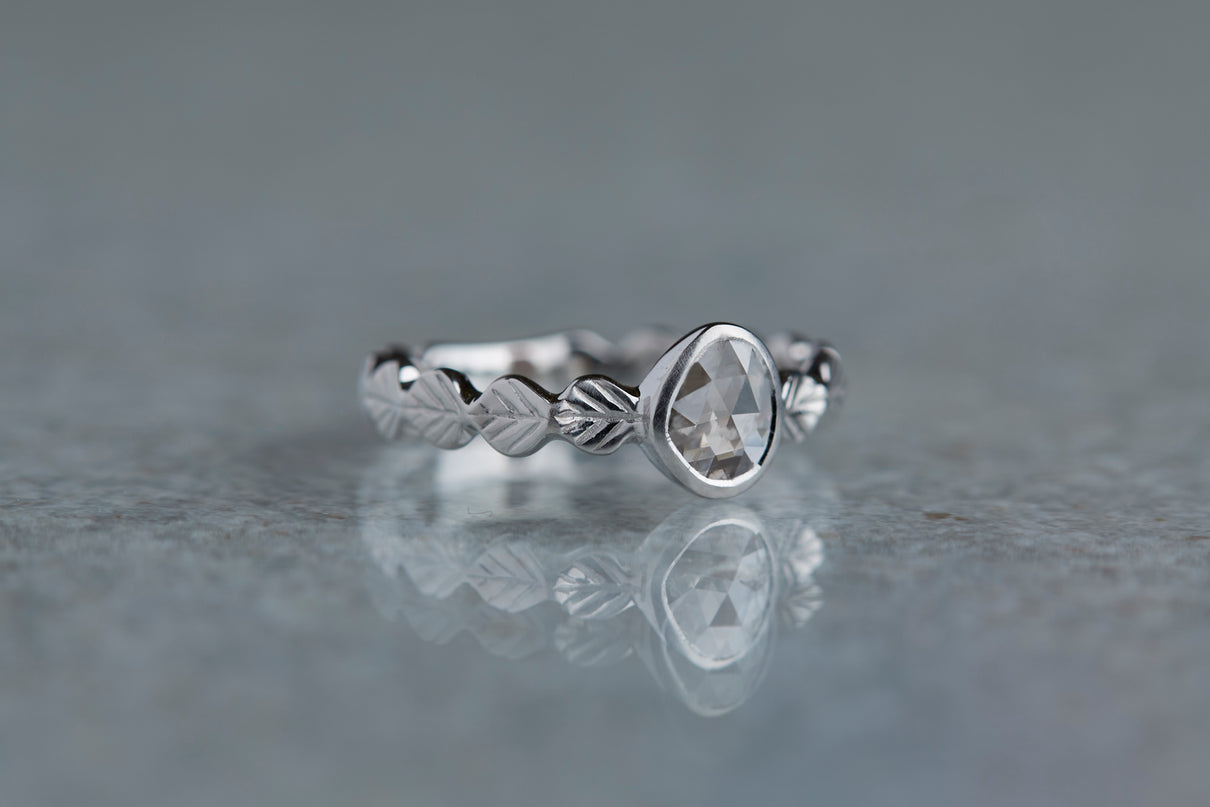 いくつも連なる葉っぱをモチーフに、1枚1枚わずかに異なる表情に遊び心を込めたLeafシリーズ。原石のフォルムを生かしてカットされた左右非対称のユニークなダイヤモンドのローズカットの美しいルースを、ベゼルセッティング(覆輪留め)で仕立てた1点物のリングです。大ぶりで華やかな煌めきを放つダイヤモンドリングは、日常的に身に着けていただくのはもちろん、特別な贈りものにも最適です。