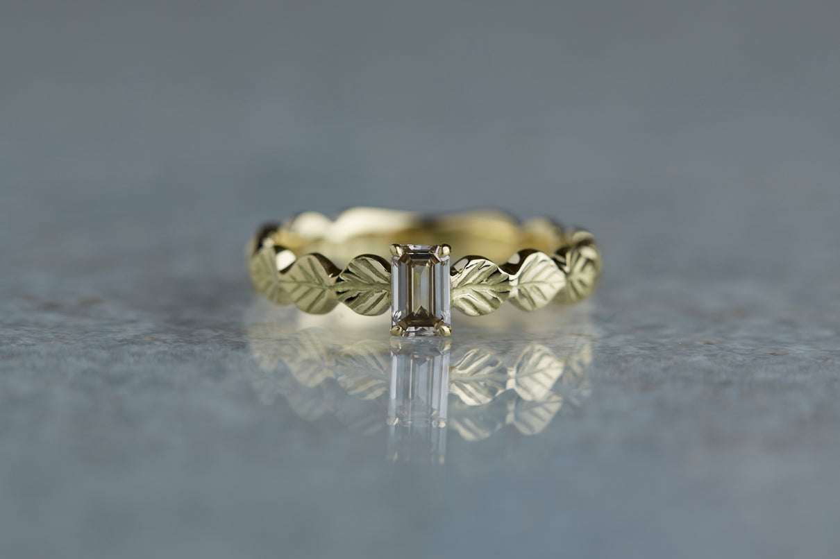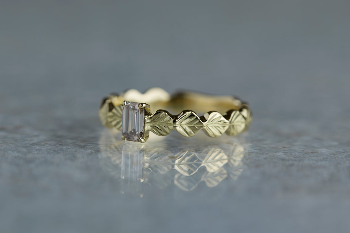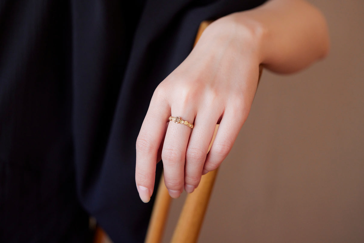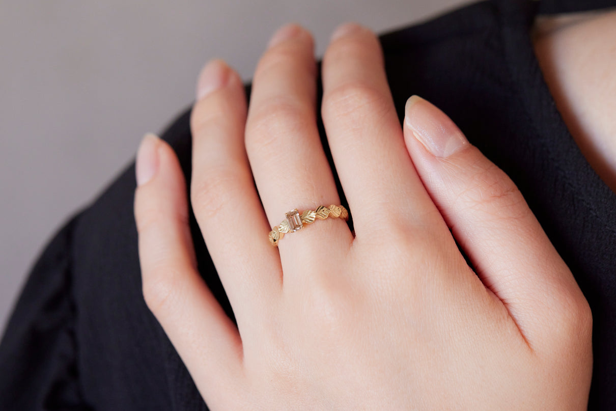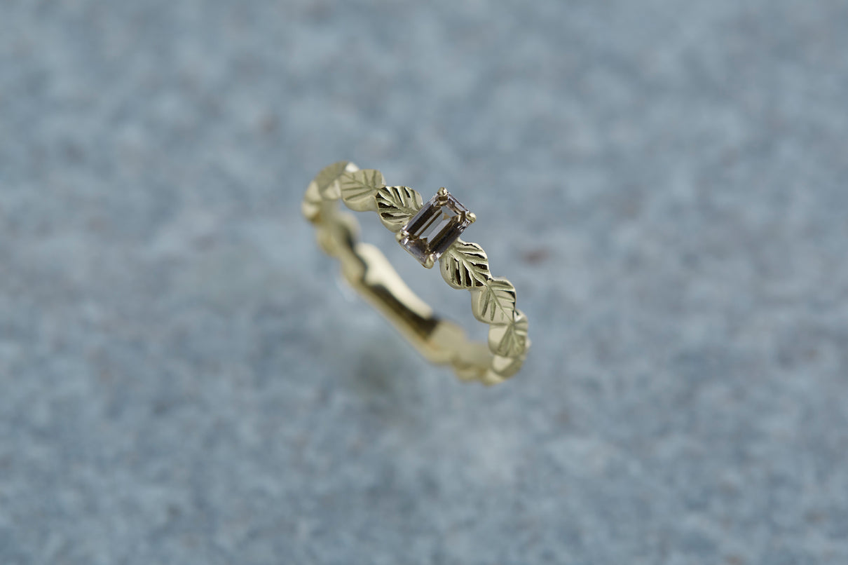 いくつも連なる葉っぱをモチーフに、1枚1枚わずかに異なる表情に遊び心を込めたLeafシリーズ。シャープに輝くシックなフォルムのバゲットカットのダイヤモンドを、有機的なLeafモチーフの中央に爪留めでセッティングしました。限りなくクリアに近い透き通った輝きの奥に、微かにブラウンの色味を滲ませたシックなカラーのダイヤモンド。日常的に身に着けていただくのはもちろん、特別な贈りものにも最適な1点物のリングです。
