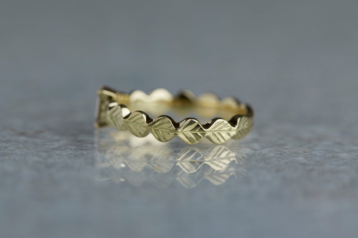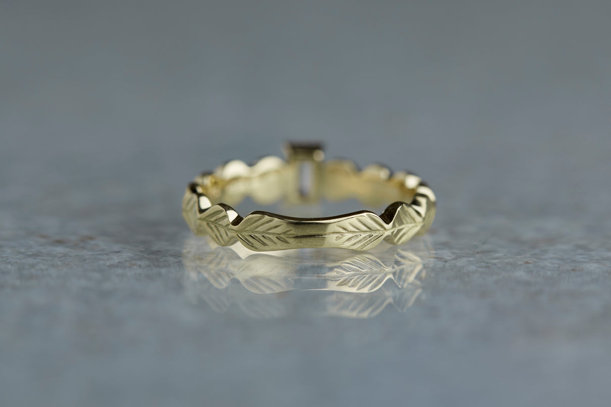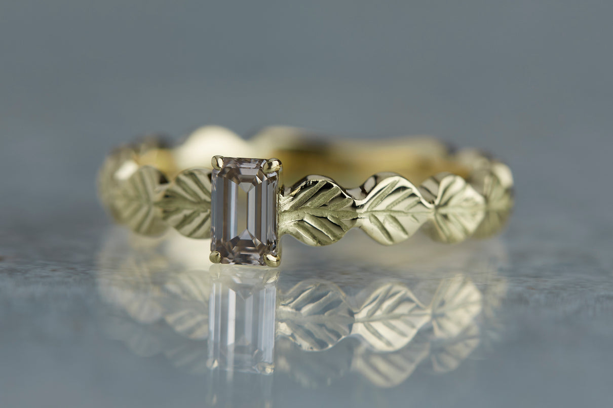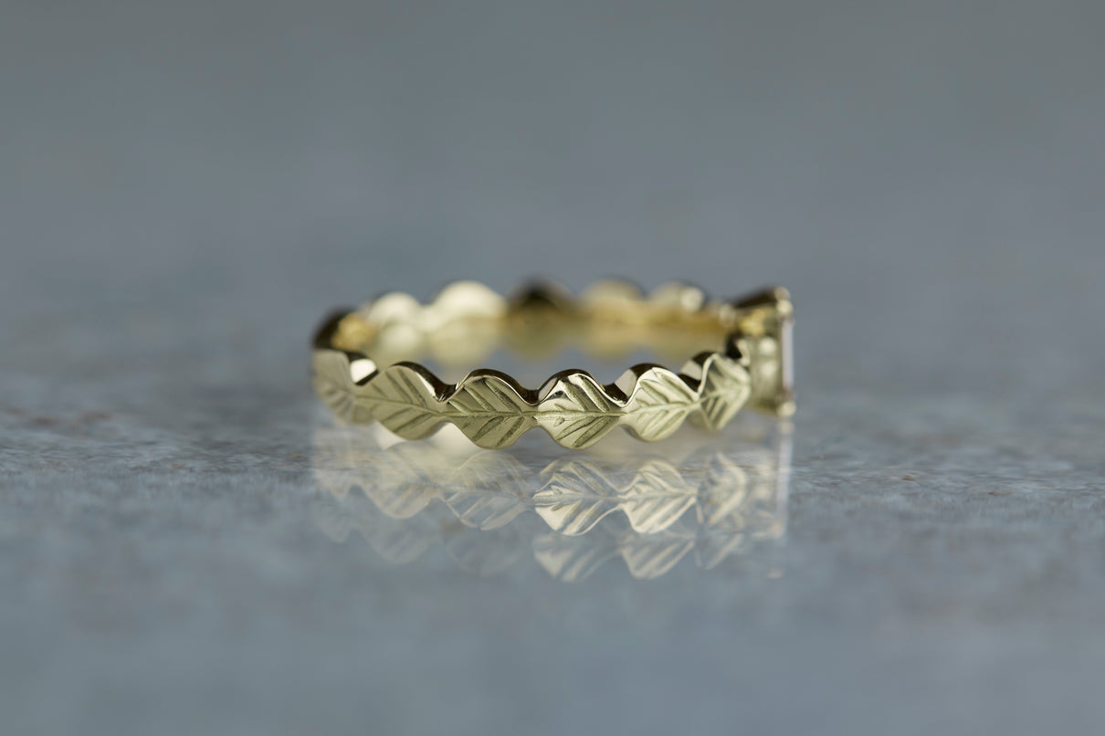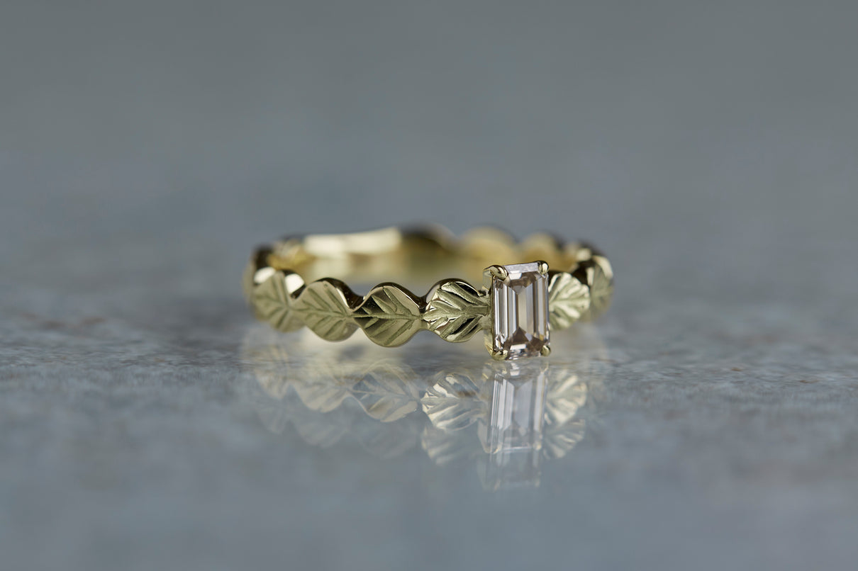 いくつも連なる葉っぱをモチーフに、1枚1枚わずかに異なる表情に遊び心を込めたLeafシリーズ。シャープに輝くシックなフォルムのバゲットカットのダイヤモンドを、有機的なLeafモチーフの中央に爪留めでセッティングしました。限りなくクリアに近い透き通った輝きの奥に、微かにブラウンの色味を滲ませたシックなカラーのダイヤモンド。日常的に身に着けていただくのはもちろん、特別な贈りものにも最適な1点物のリングです。