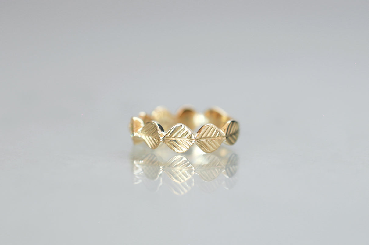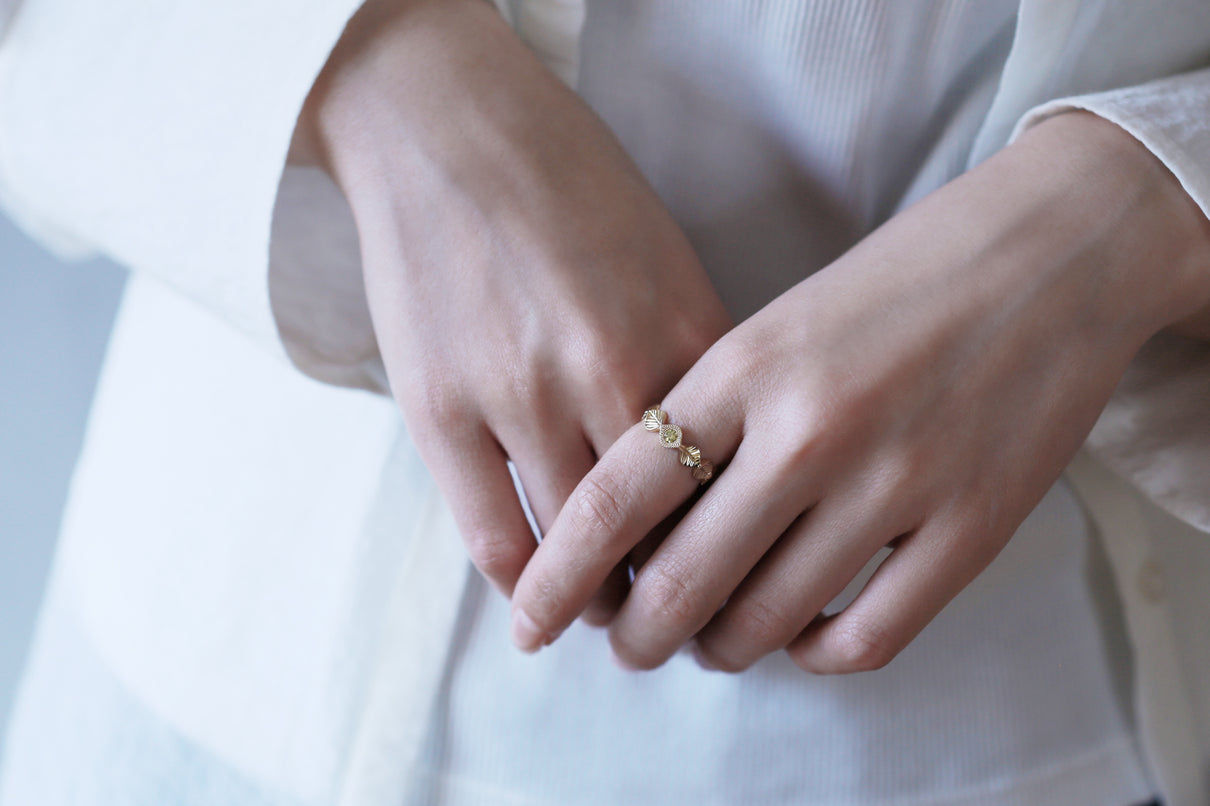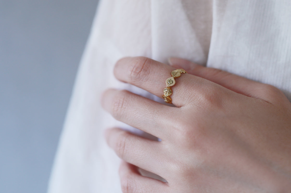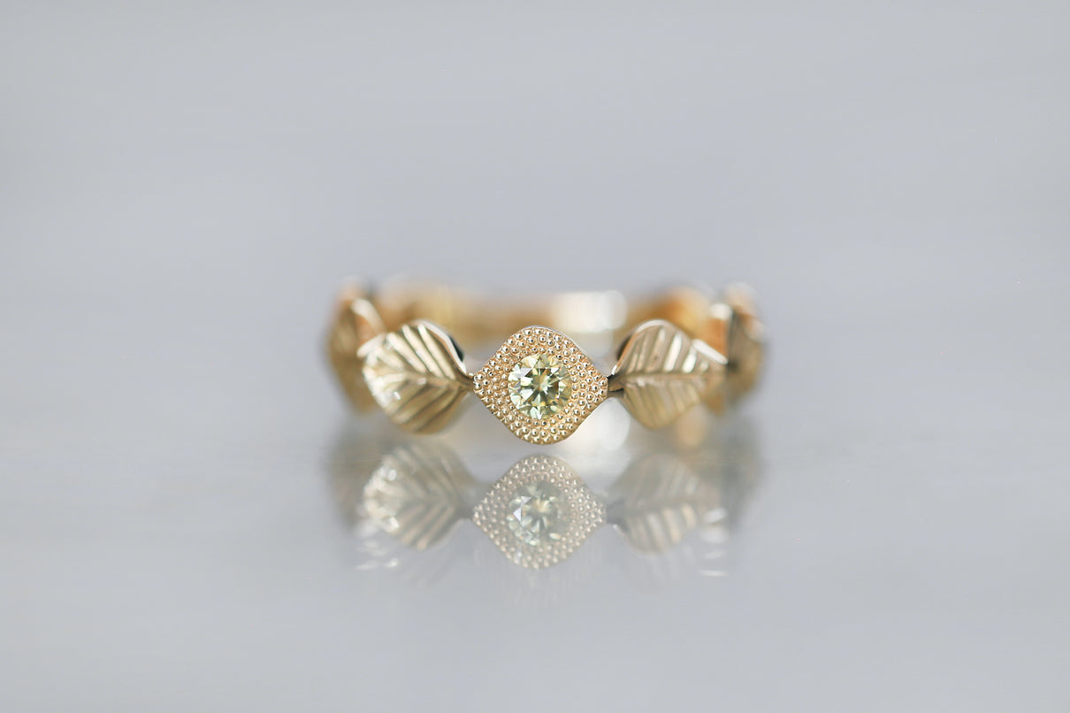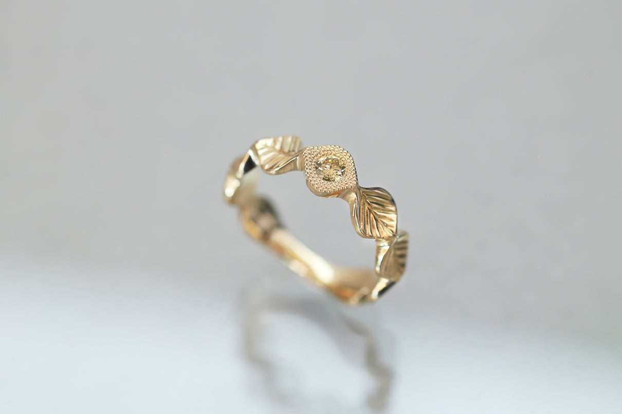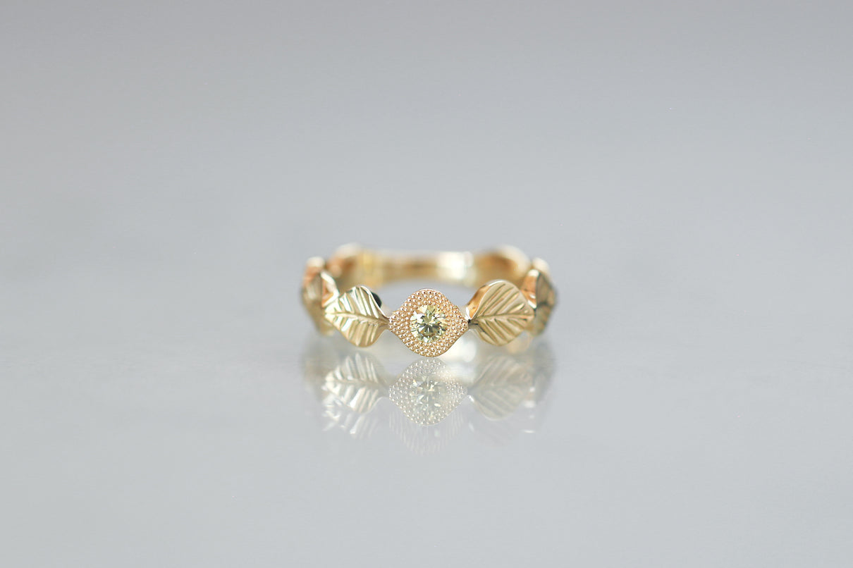 いくつも連なる葉っぱをモチーフに、1枚1枚わずかに異なる表情に遊び心を込めたLeafシリーズ。ほのかな黄色を含んだ新緑を思わせるようなオリーブグリーンのダイヤモンドを、細かな手仕事のミル打ちで贅沢に縁取った、1点物のリングです。ダイヤモンドの台座もさりげなく葉っぱをイメージさせるシェイプに仕立て、全体に滑らかなリズムを与えています。イエローゴールドでリング全体の色合いをまとめ、指元に柔らかな印象を纏わせるリング。装いの主役として日常的に身に着けていただくのはもちろん、特別な贈りものにも最適なアイテムです。