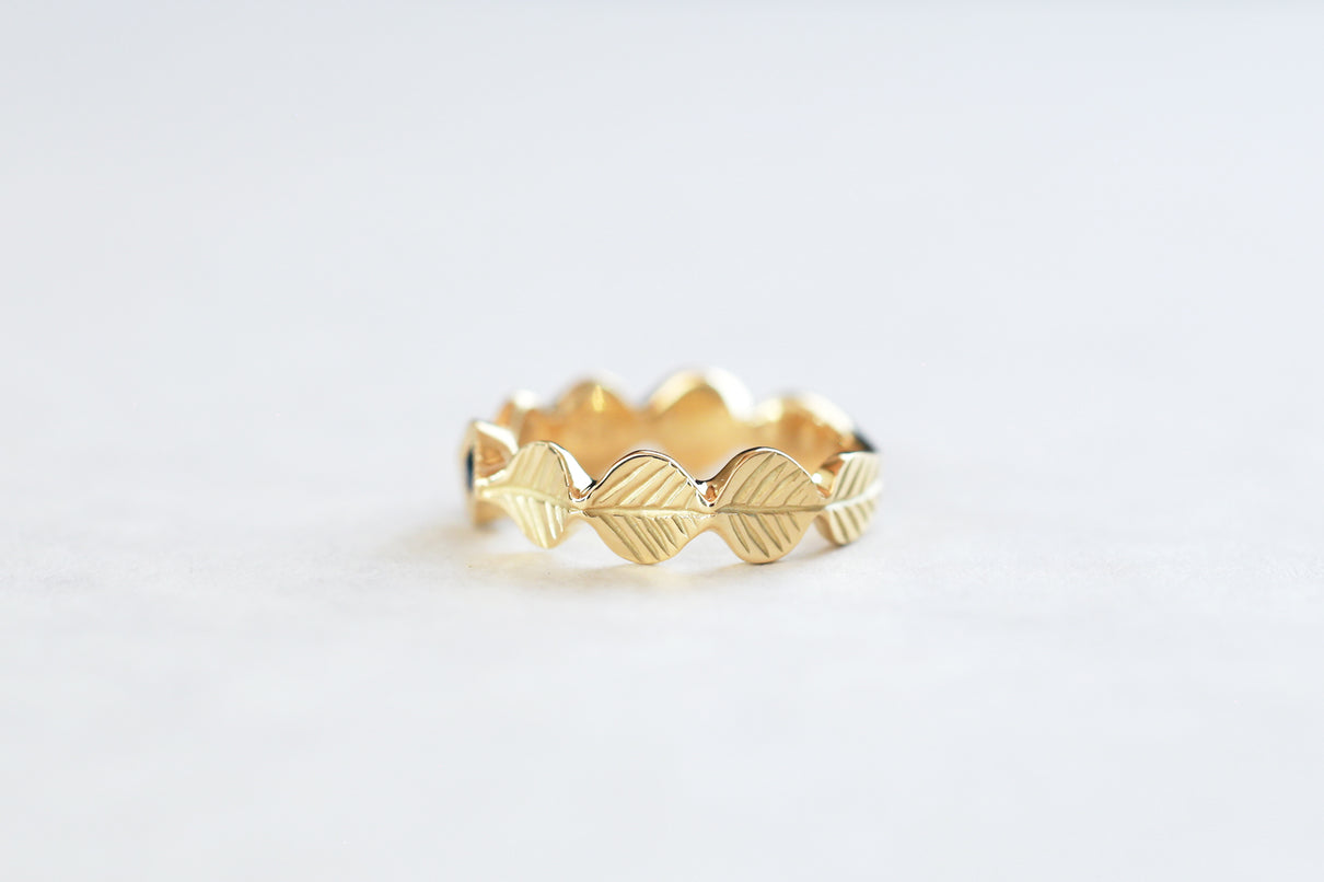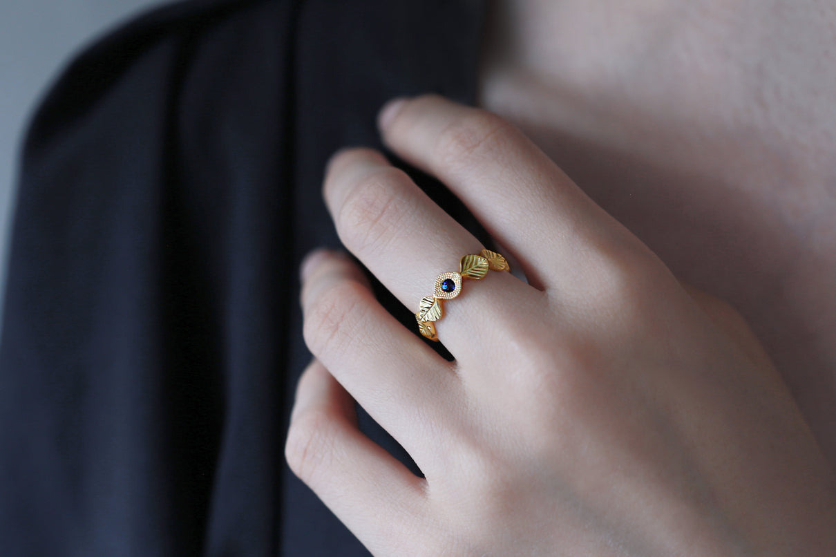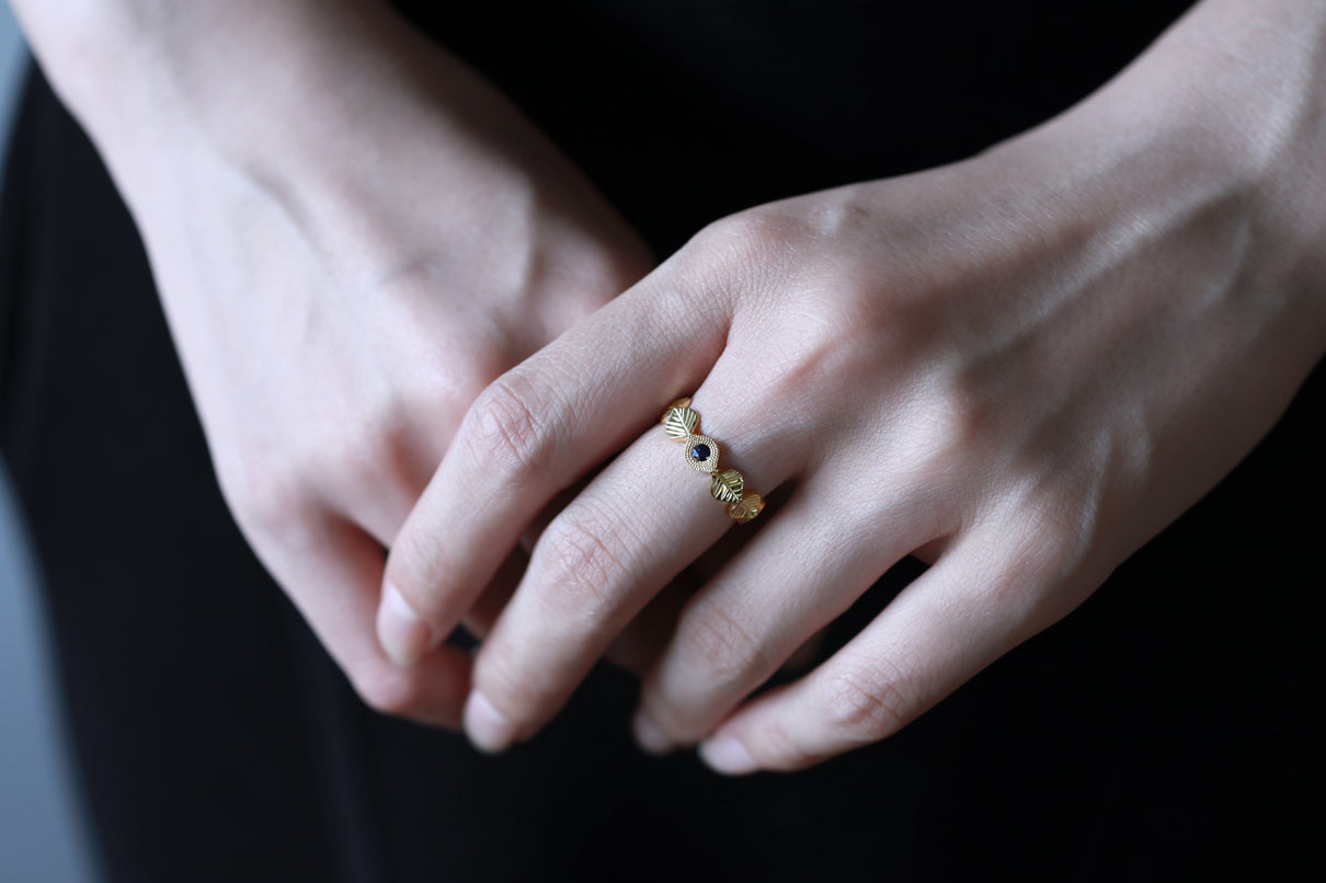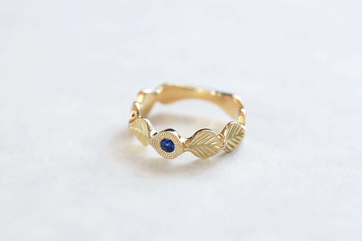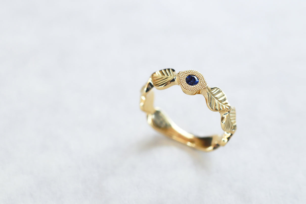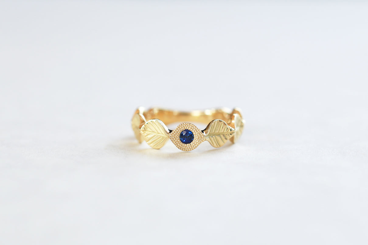 いくつも連なる葉っぱをモチーフに、1枚1枚わずかに異なる表情に遊び心を込めたLeafシリーズのリング。サファイアならではの深みのあるブルーが美しく、細かなミル打ちが華やかに引き立てます。日常使いもしやすいデザインで1本で装いの主役となり、9月の誕生石としても親しまれているサファイアは、9月生まれの方の特別なお守りとして贈りものにも最適なアイテムです。