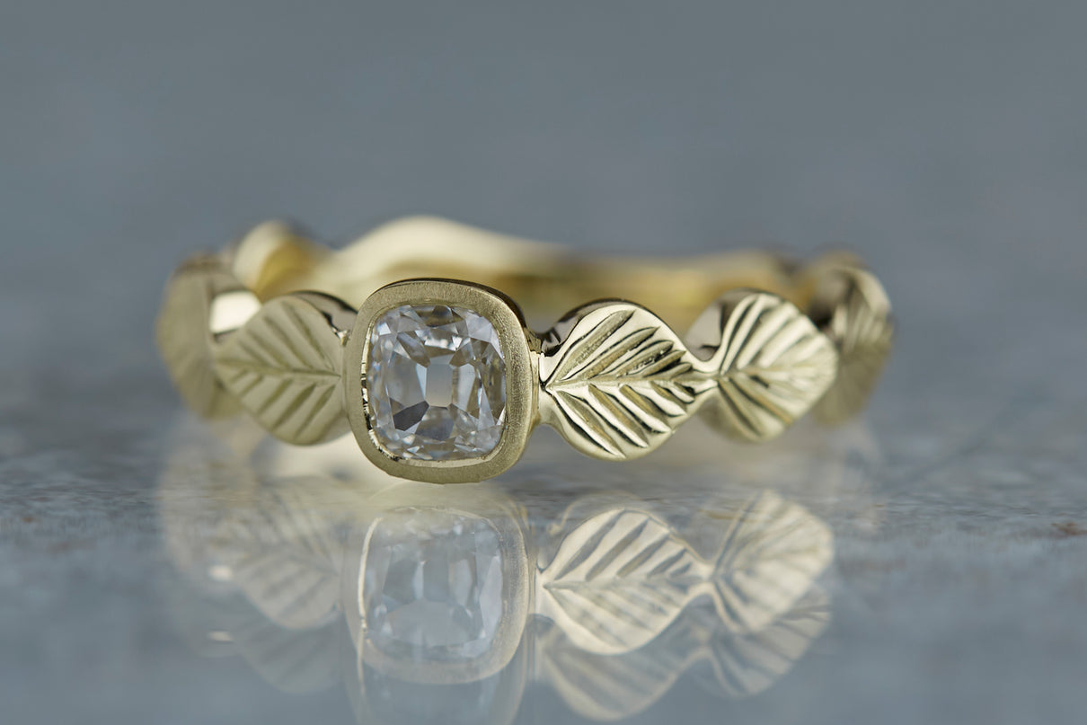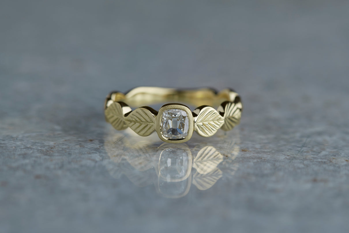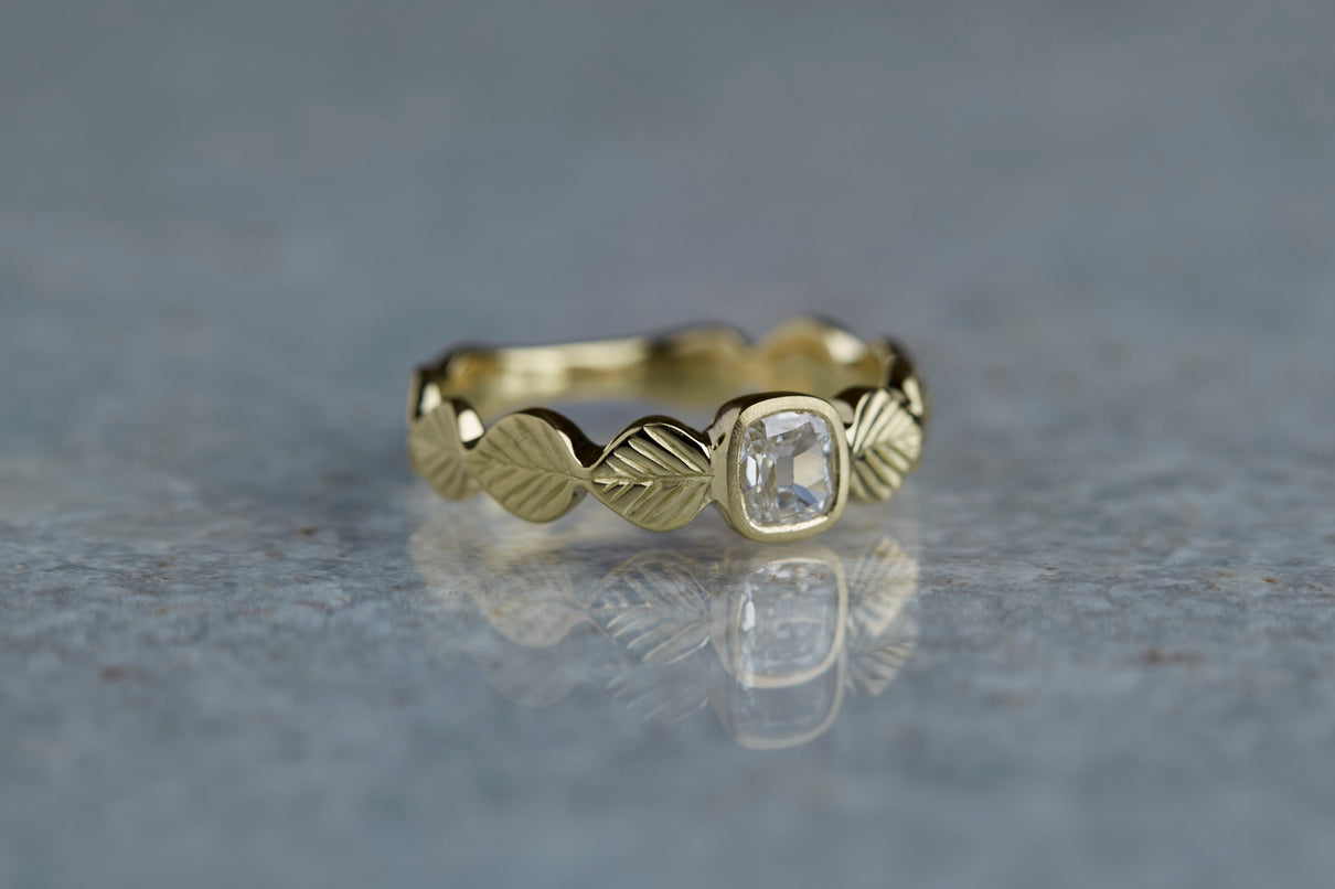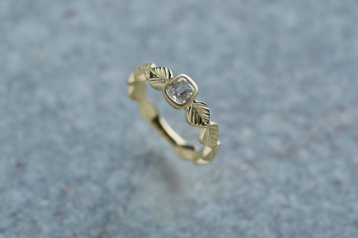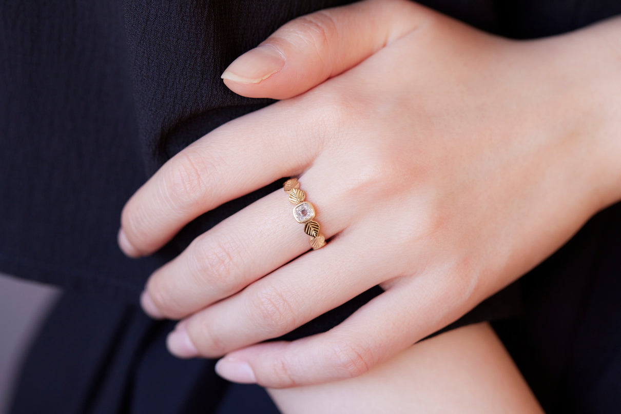 いくつも連なる葉っぱをモチーフに、1枚1枚わずかに異なる表情に遊び心を込めたLeafシリーズ。ダイヤモンドのカット方法の中でも希少価値の高いオールドカットのルースを、ベゼルセッティング(覆輪留め)で仕立てた1点物のリングです。蛍光灯のなかった時代、蝋燭の炎のもとで最も美しく輝くようにと手作業にてカットされたオールドカットのダイヤモンドは、奥に歴史的背景を確かに感じ、そのアシンメトリーでボリューミーなカッティングから、現代のブリリアントカットのダイヤモンドとは対照的な、柔らかで温かみのある輝きを放ちます。尚、こちらのダイヤモンドは限りなくクリアに近い、シャンパンカラーと呼ばれるベリーライトイエロー。透明度が高く照りも美しいダイヤモンドです。装いの主役として日常的に身に着けていただくのはもちろん、特別な贈りものにも最適なアイテムです。