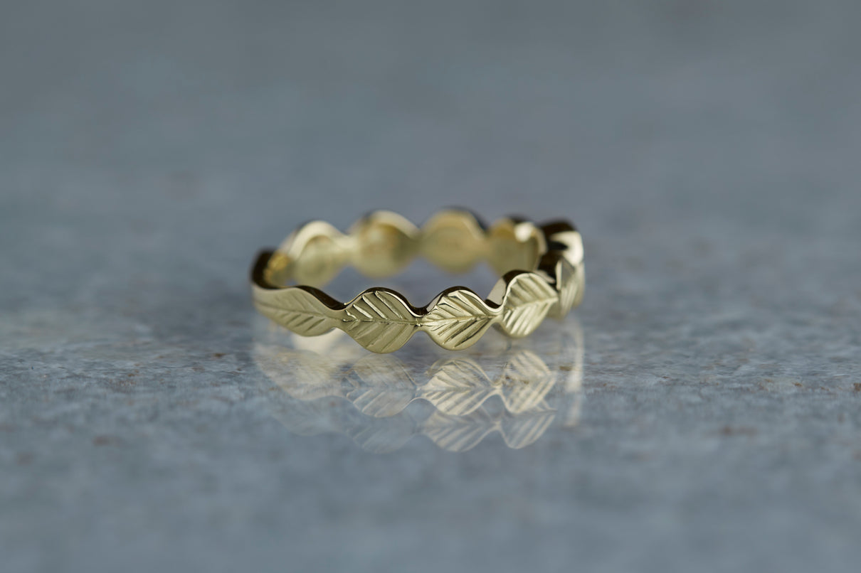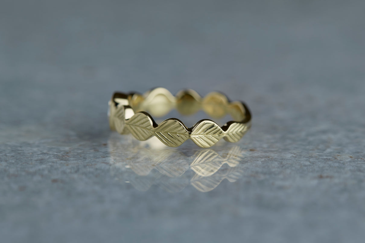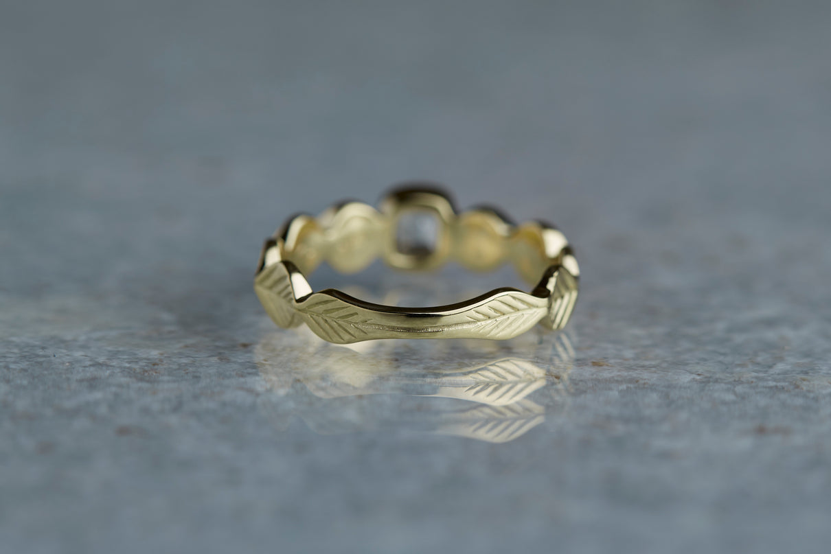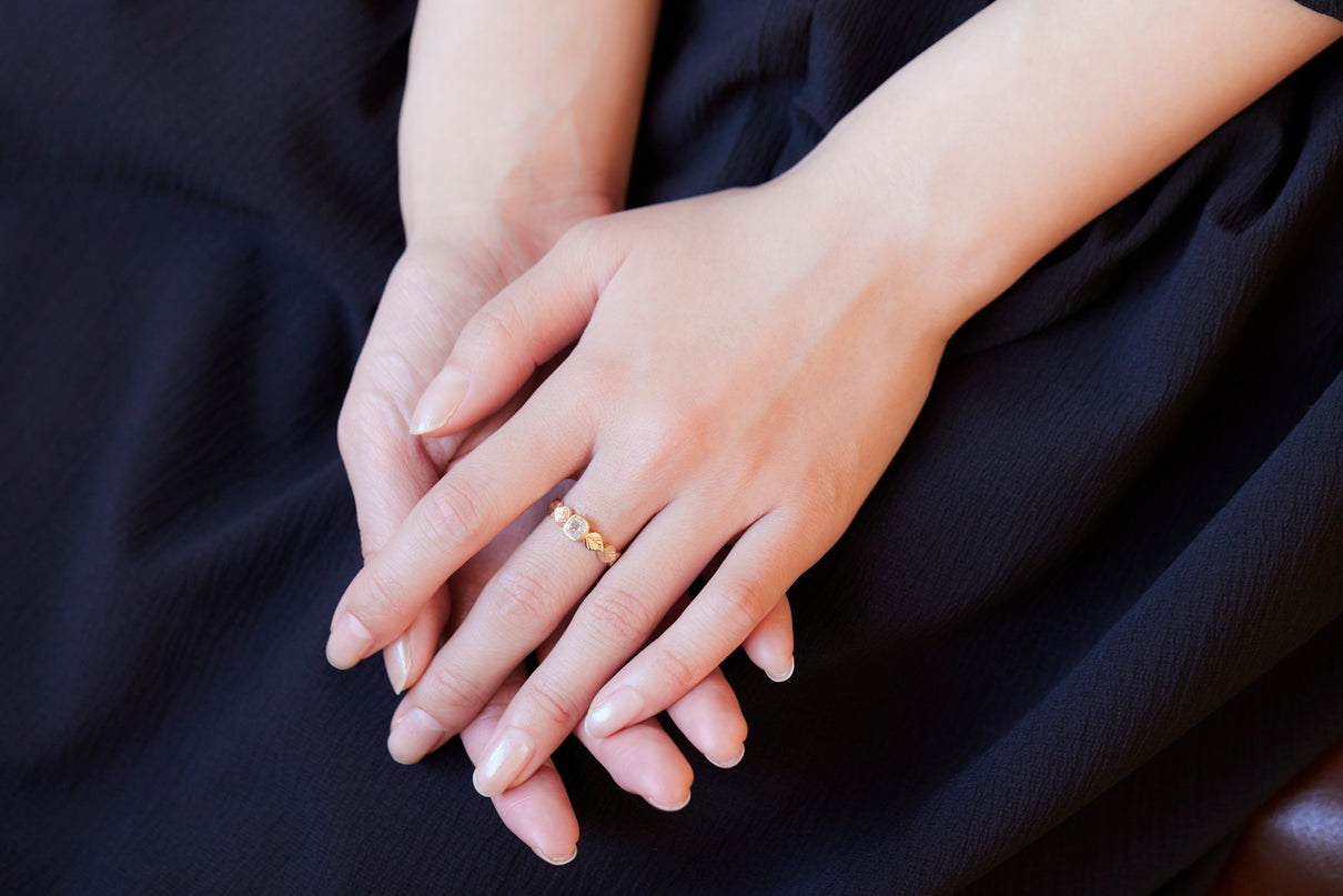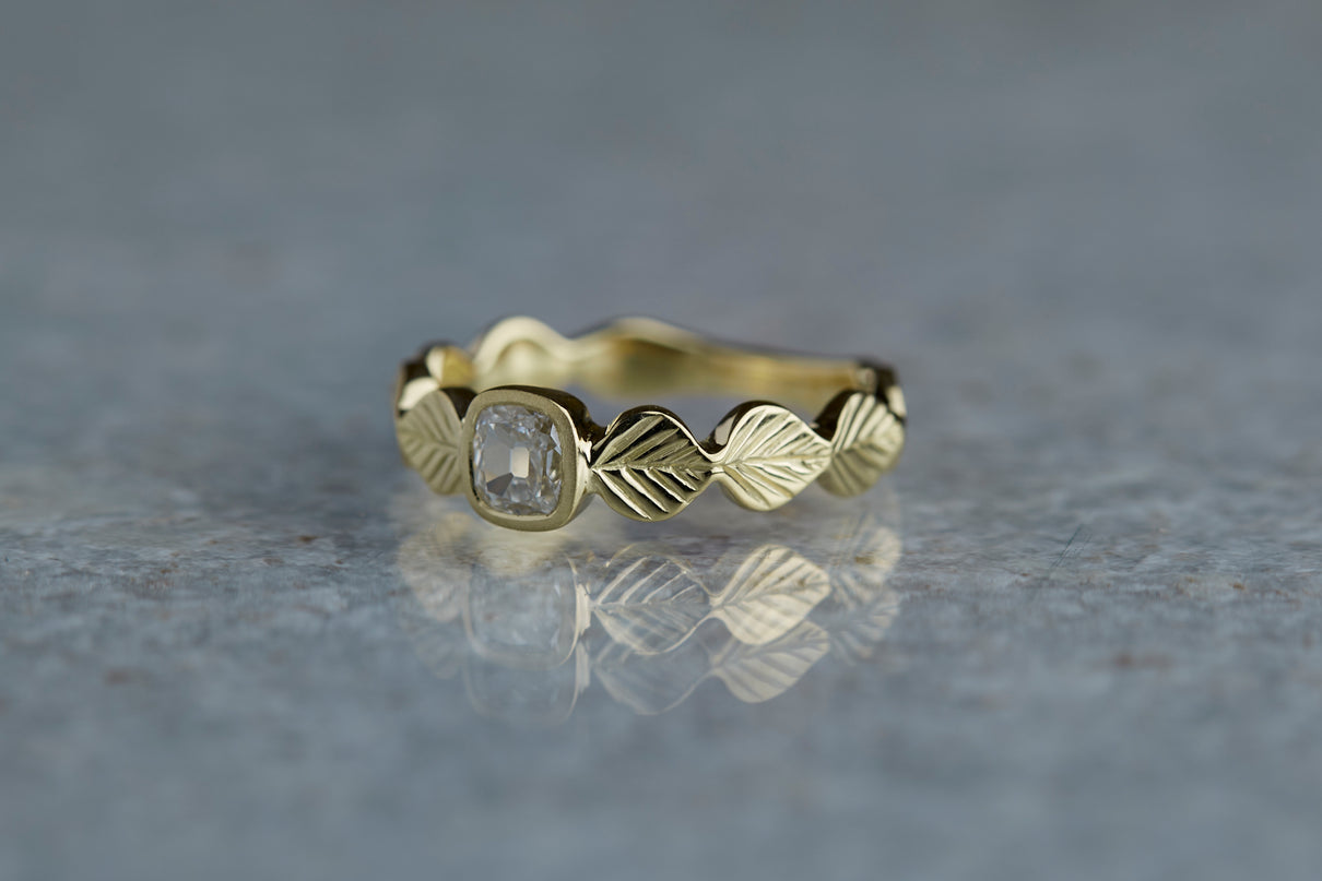 いくつも連なる葉っぱをモチーフに、1枚1枚わずかに異なる表情に遊び心を込めたLeafシリーズ。ダイヤモンドのカット方法の中でも希少価値の高いオールドカットのルースを、ベゼルセッティング(覆輪留め)で仕立てた1点物のリングです。蛍光灯のなかった時代、蝋燭の炎のもとで最も美しく輝くようにと手作業にてカットされたオールドカットのダイヤモンドは、奥に歴史的背景を確かに感じ、そのアシンメトリーでボリューミーなカッティングから、現代のブリリアントカットのダイヤモンドとは対照的な、柔らかで温かみのある輝きを放ちます。尚、こちらのダイヤモンドは限りなくクリアに近い、シャンパンカラーと呼ばれるベリーライトイエロー。透明度が高く照りも美しいダイヤモンドです。装いの主役として日常的に身に着けていただくのはもちろん、特別な贈りものにも最適なアイテムです。