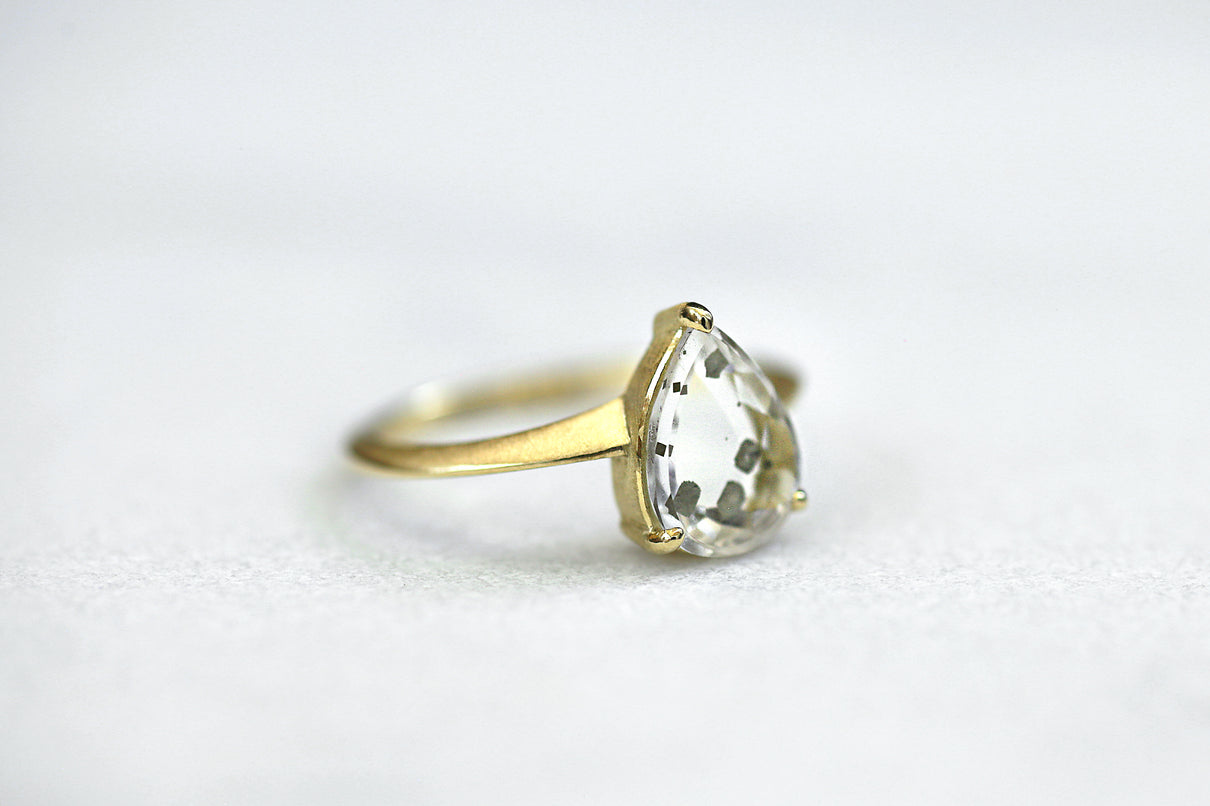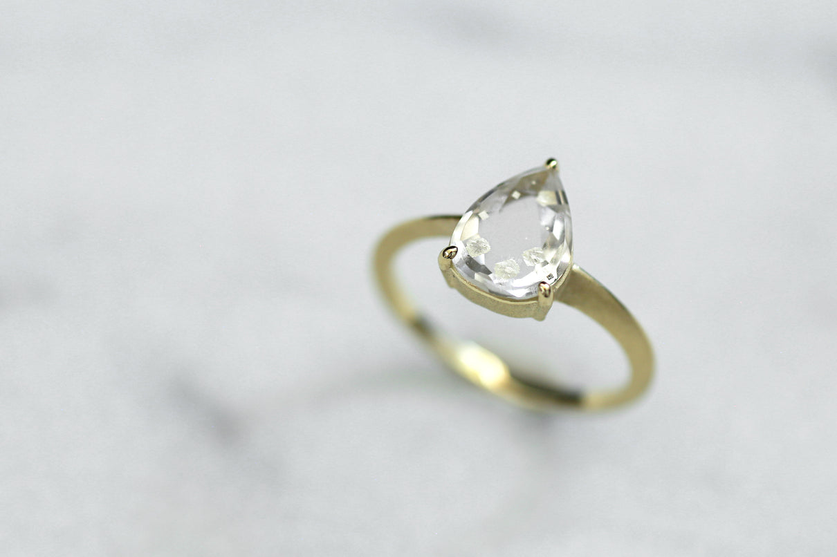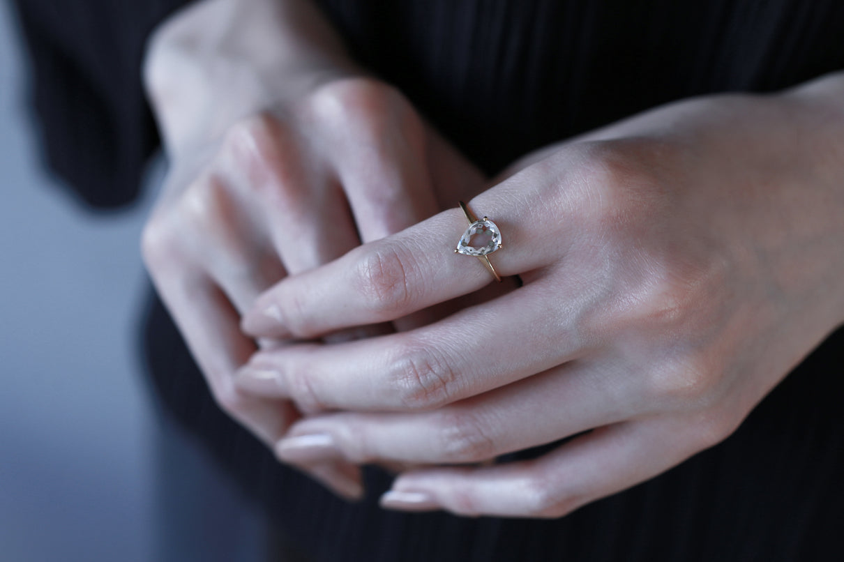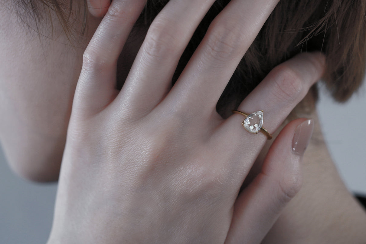 金属箔を彷彿とさせる上品で奥ゆかしい煌めきが美しい、マーカサイトインクォーツで仕立てた1点もののリング。マーカサイトは、硫黄と鉄鉱が結びつくことで生まれた結晶です。それが透明なクォーツが育つ過程で閉じ込められ、幾重もの偶然が重なり合って出来た鉱石がマーカサイトインクォーツです。透明度の高いドロップ型のクォーツの中に幾何形状のマーカサイトが入った、幻想的な表情が天然石ならではの美しい1ピースとなっています。プレーンなマットテクスチャーを施した石座部分は、正面からは石の魅力を際立たせ、石を留める爪部分のみ艶めくように仕上げることで、リング全体の印象を凛と引き締めます。日々の装いに取り入れやすいサイズ感で、スタイリッシュな華やぎを添えてくれるアイテムです。
