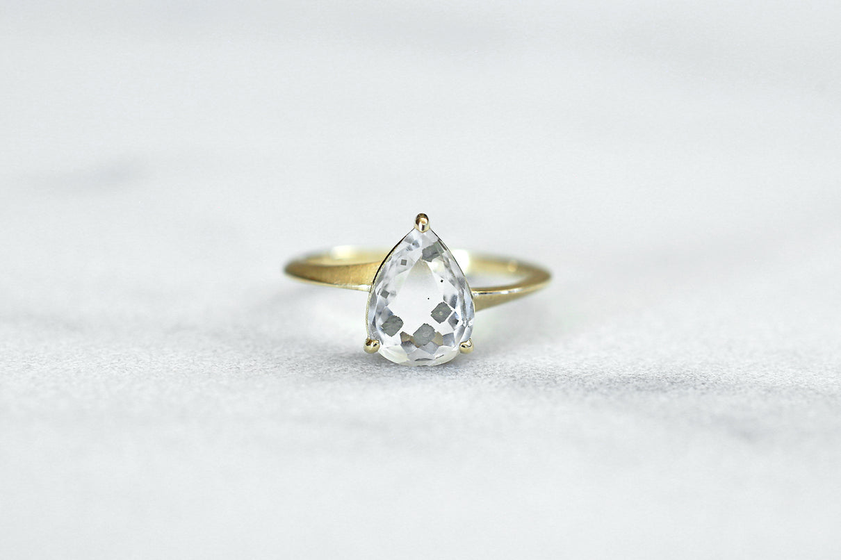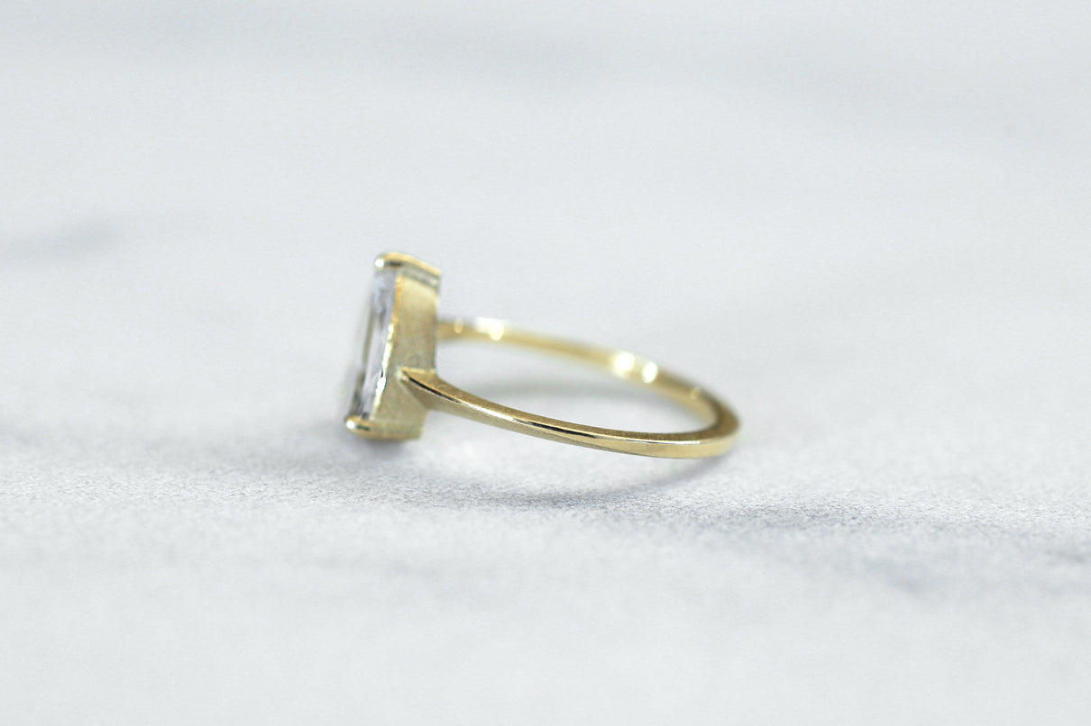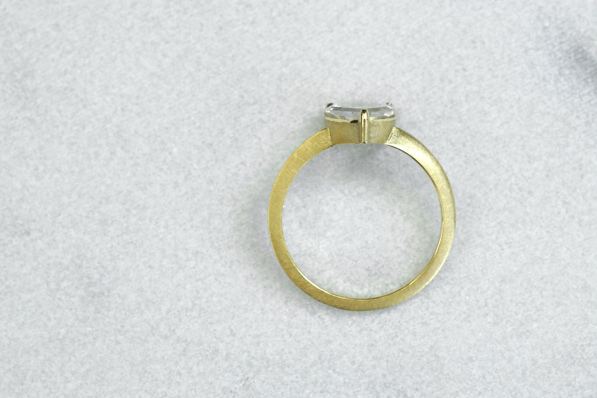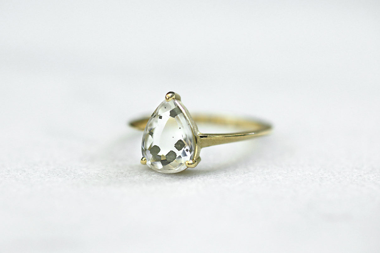 金属箔を彷彿とさせる上品で奥ゆかしい煌めきが美しい、マーカサイトインクォーツで仕立てた1点もののリング。マーカサイトは、硫黄と鉄鉱が結びつくことで生まれた結晶です。それが透明なクォーツが育つ過程で閉じ込められ、幾重もの偶然が重なり合って出来た鉱石がマーカサイトインクォーツです。透明度の高いドロップ型のクォーツの中に幾何形状のマーカサイトが入った、幻想的な表情が天然石ならではの美しい1ピースとなっています。プレーンなマットテクスチャーを施した石座部分は、正面からは石の魅力を際立たせ、石を留める爪部分のみ艶めくように仕上げることで、リング全体の印象を凛と引き締めます。日々の装いに取り入れやすいサイズ感で、スタイリッシュな華やぎを添えてくれるアイテムです。