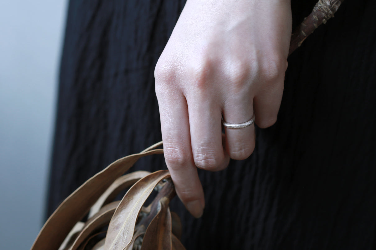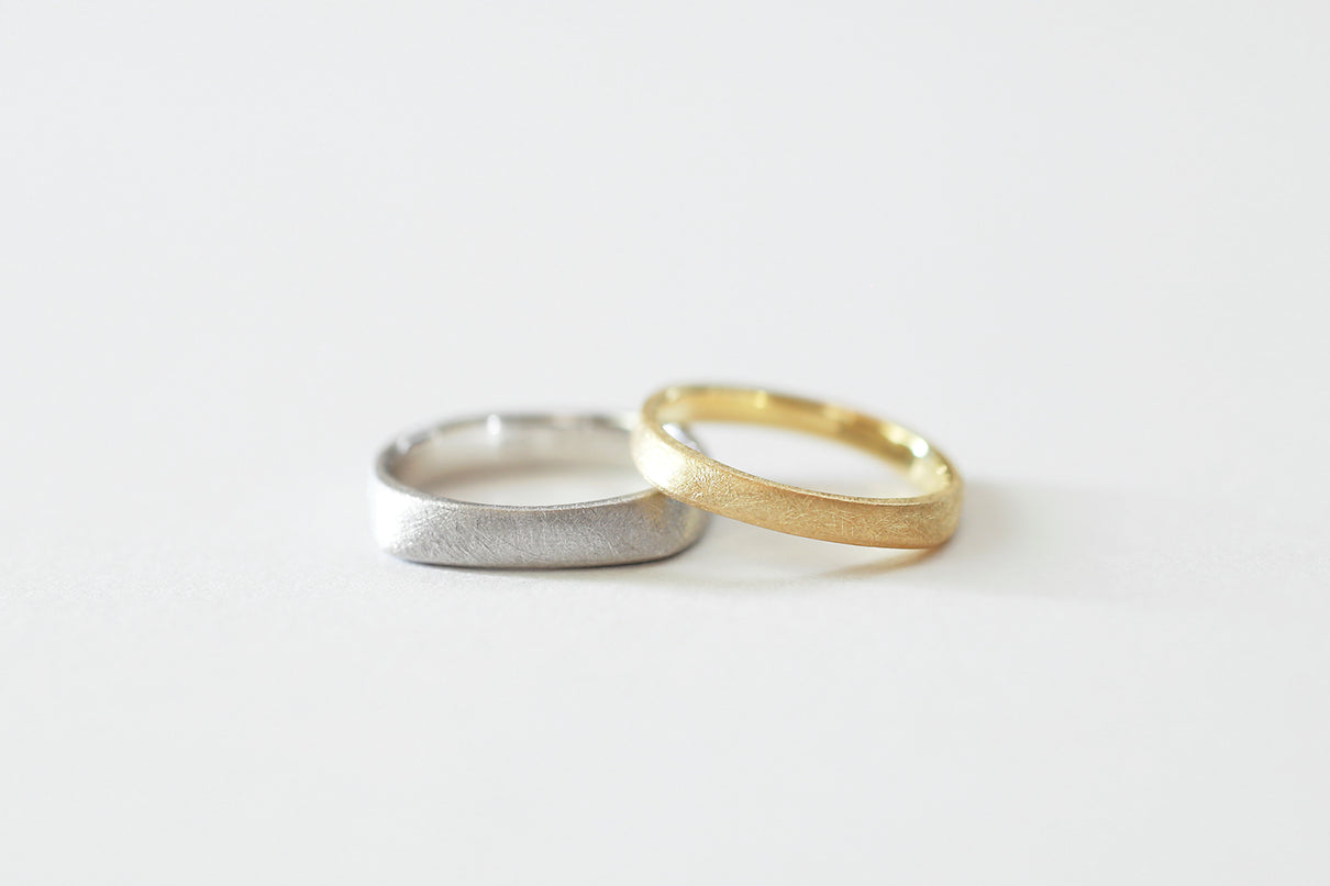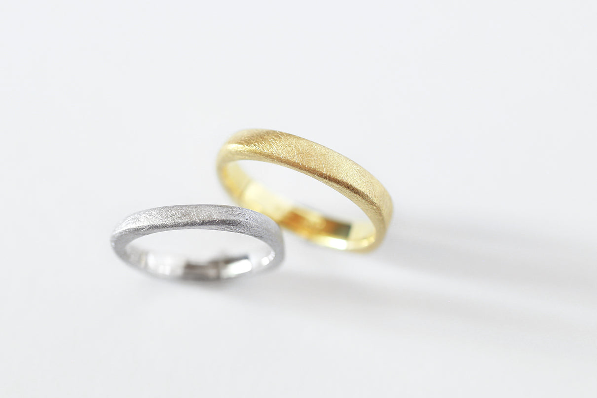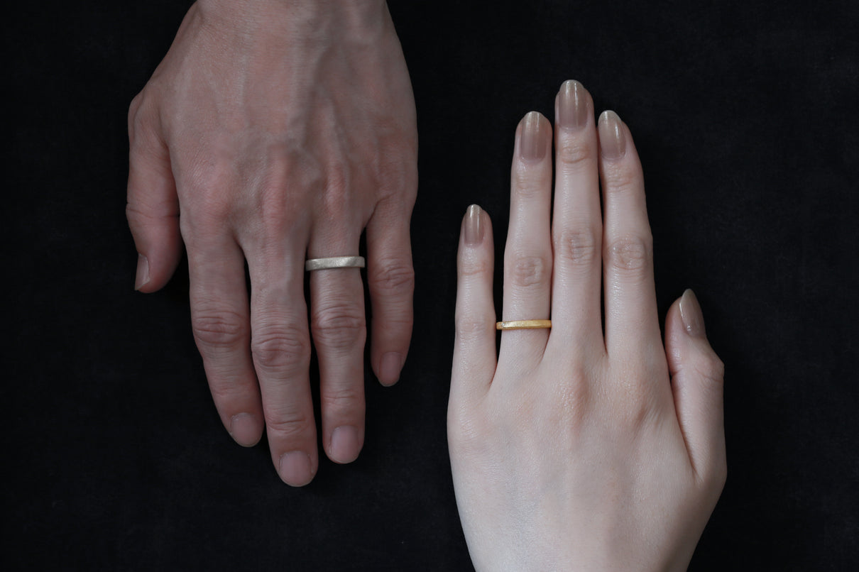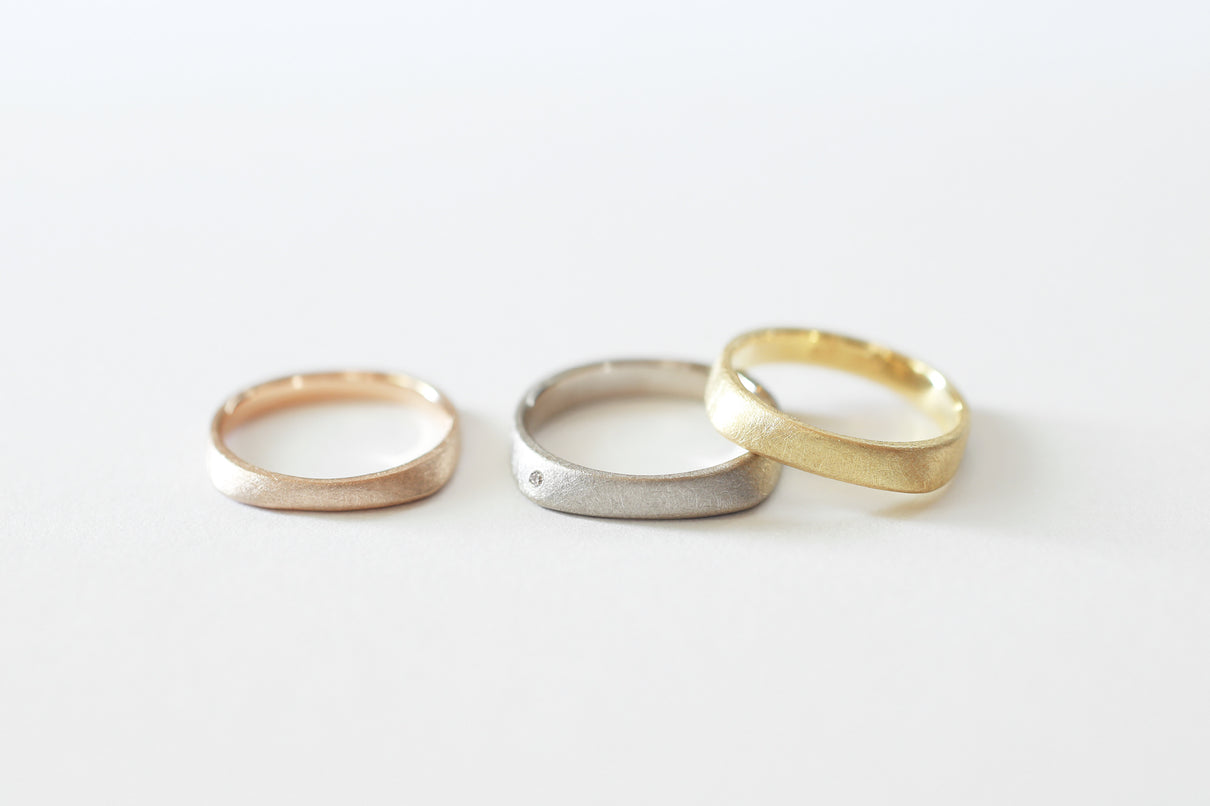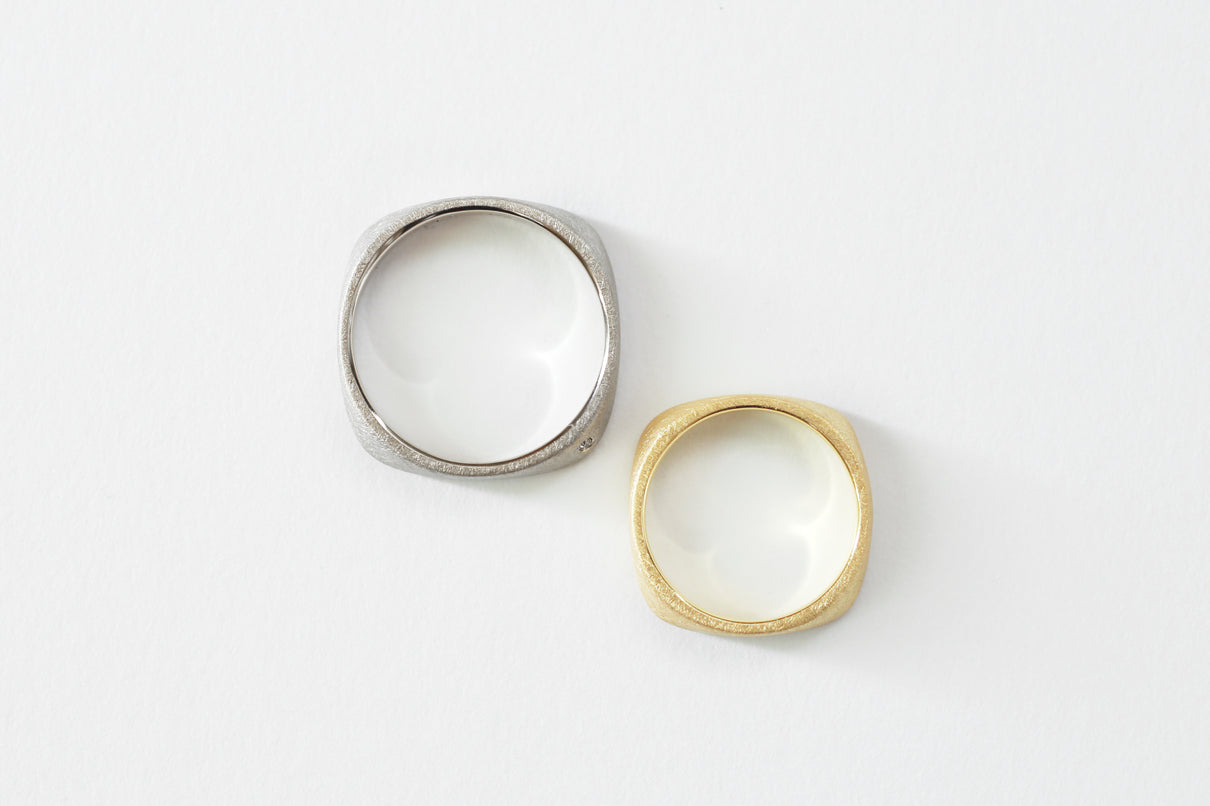 四角と丸が溶け合うように滑らかに一体化する、シンプルながらも静かな個性を放つマリッジリング ( 結婚指輪 ) 。指元で穏やかなスクエアフォルムが淡く輝きを放ちます。柔らかな指当たりにもこだわり、身に着けた時の存在感だけでなく、置いた時の佇まいも趣きがあるデザインです。