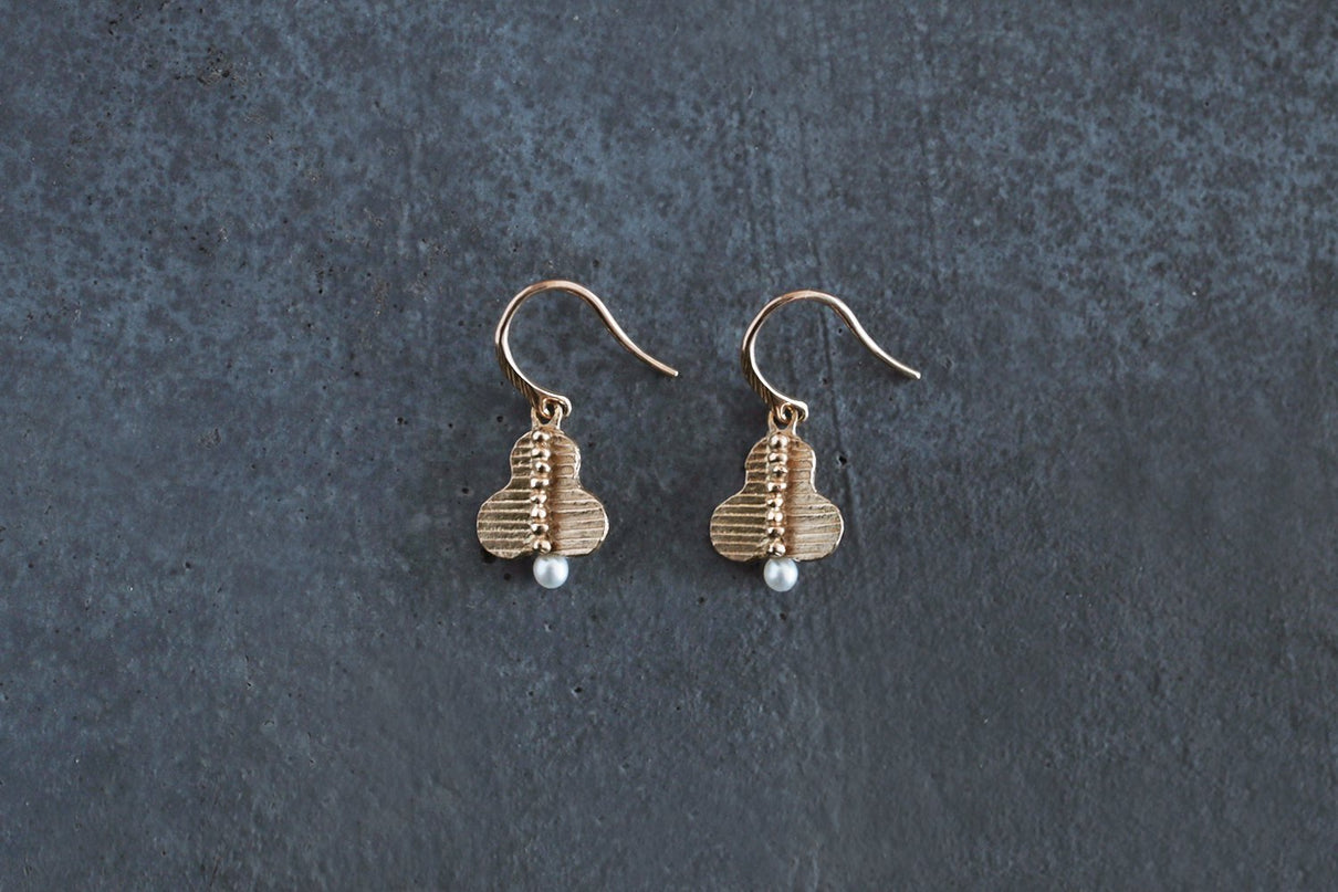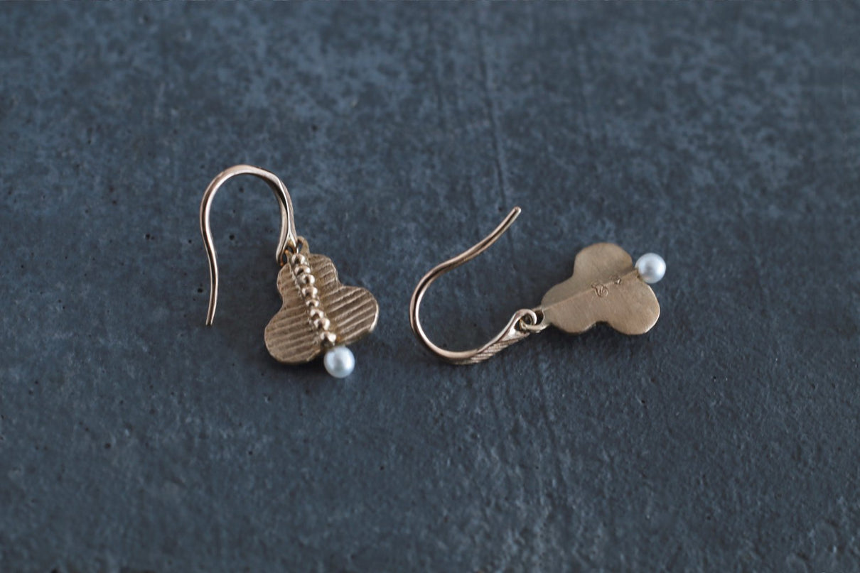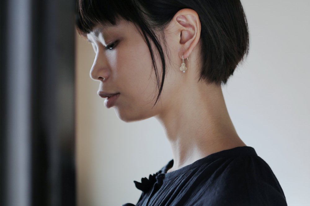 多種多様で想像を超えるような不思議な姿をした珪藻をモチーフにしたピアス。3つの円が重なり繋がったような洗練されたフォルムの先に小さなパールの粒が光ります。スモーキーなマットテクスチャーでよく見ると紙を重ねたような段々の層になっており、少し起き上がるように左右に反った表情や筋彫りの入った個性あるフックまで細部にこだわりを感じられる趣深いアイテム。小ぶりながら耳元で揺れさりげなく華やぎます。