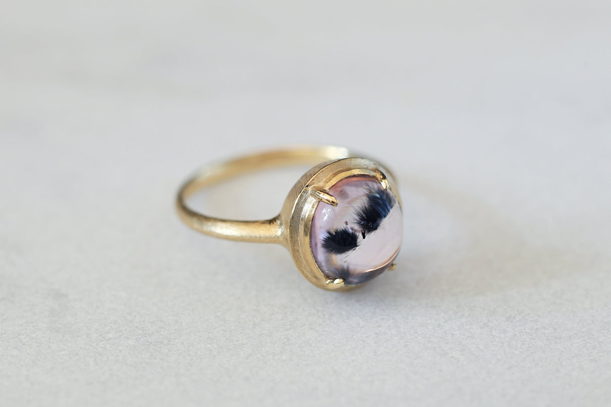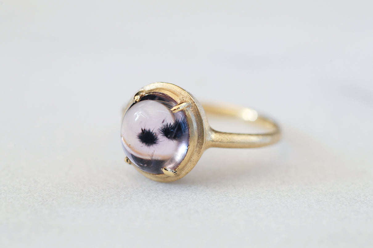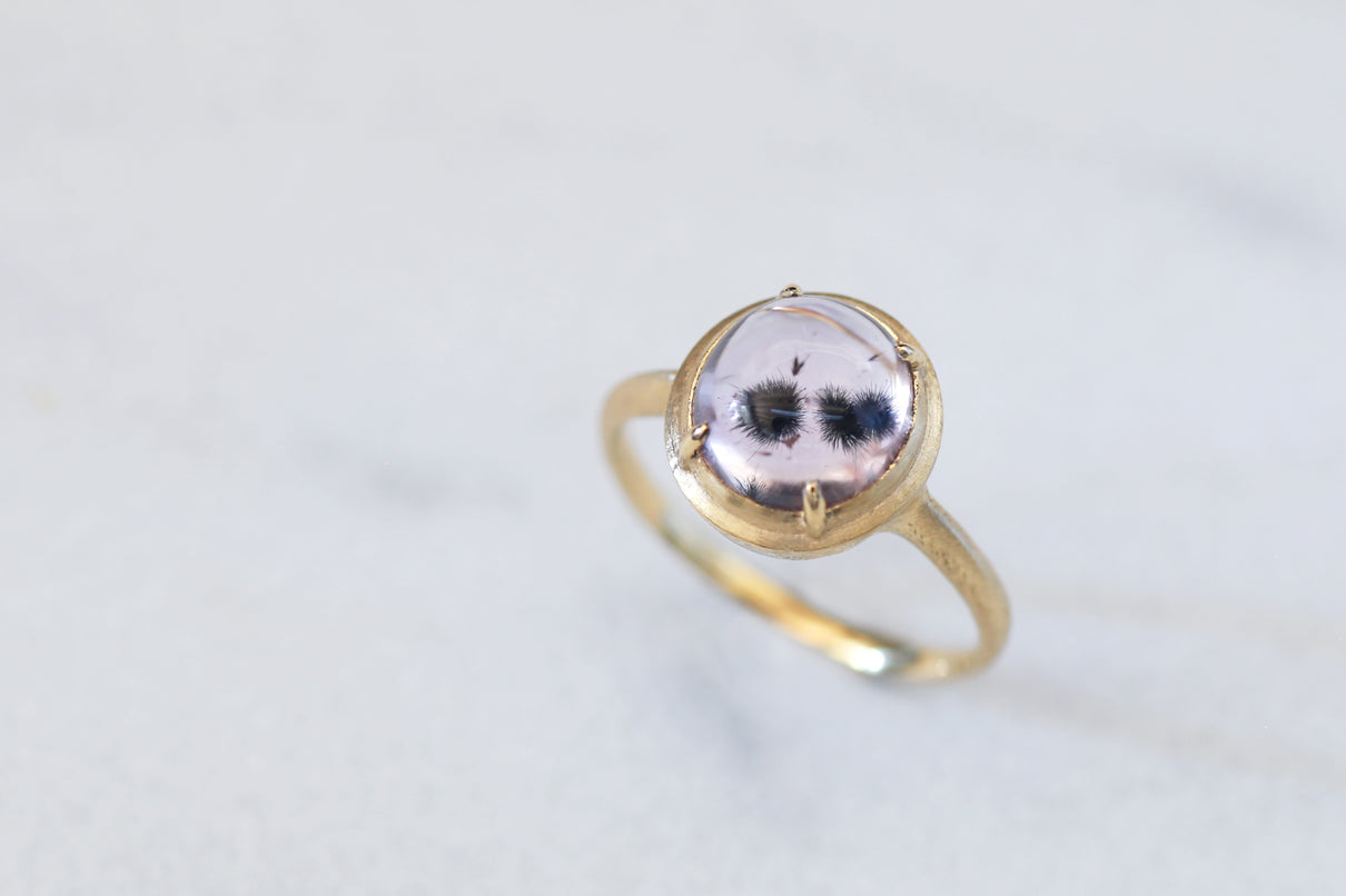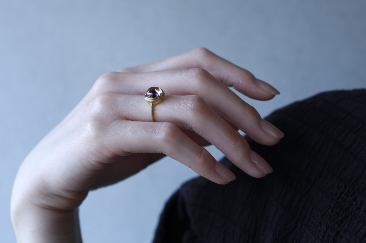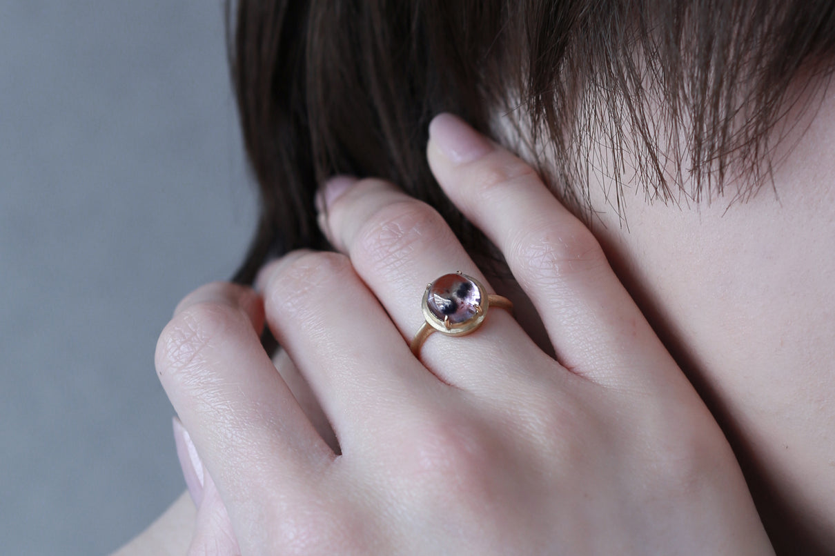 マンガンを多く含む鉱物の一つであるロマネシュ鉱を内包した "ロマネサイトインアメジスト"で仕立てた1点もののリング。2月の誕生石としても有名な石なアメジストですが、中でも内包物がユニークな表情の高品質で希少性の高いピースを厳選しました。こちらは水晶とロマネシュ鉱が共存することが珍しいうえ、アメジストの透明度も高く、冷たく澄んだ水にひっそり暮らす小さな生き物のように、落ち着きと愛らしさを秘めた希少価値の高いロマネサイトインアメジストです。その艶やかで丸みのあるカボションカットを活かしつつ、愛らしい印象になりすぎない様、覆輪留めと爪留めを併せて、シャープに縁取りをした作りの中に繊細さも感じられるリングに仕立てました。K18ゴールドのリング部分には内包物の印象に合わせたランダムかつ直線的なマットテクスチャーを施し、石周りの緻密な細部のみ艶仕上げで洗練させました。ロマネサイトインアメジストのみずみずしく潤みを帯びた美しい表情と、ベーシックながらしっかり存在感放つ佇まいが唯一無二のリング。2月生まれの方の特別なお守りとして贈りものにも最適なアイテムです。