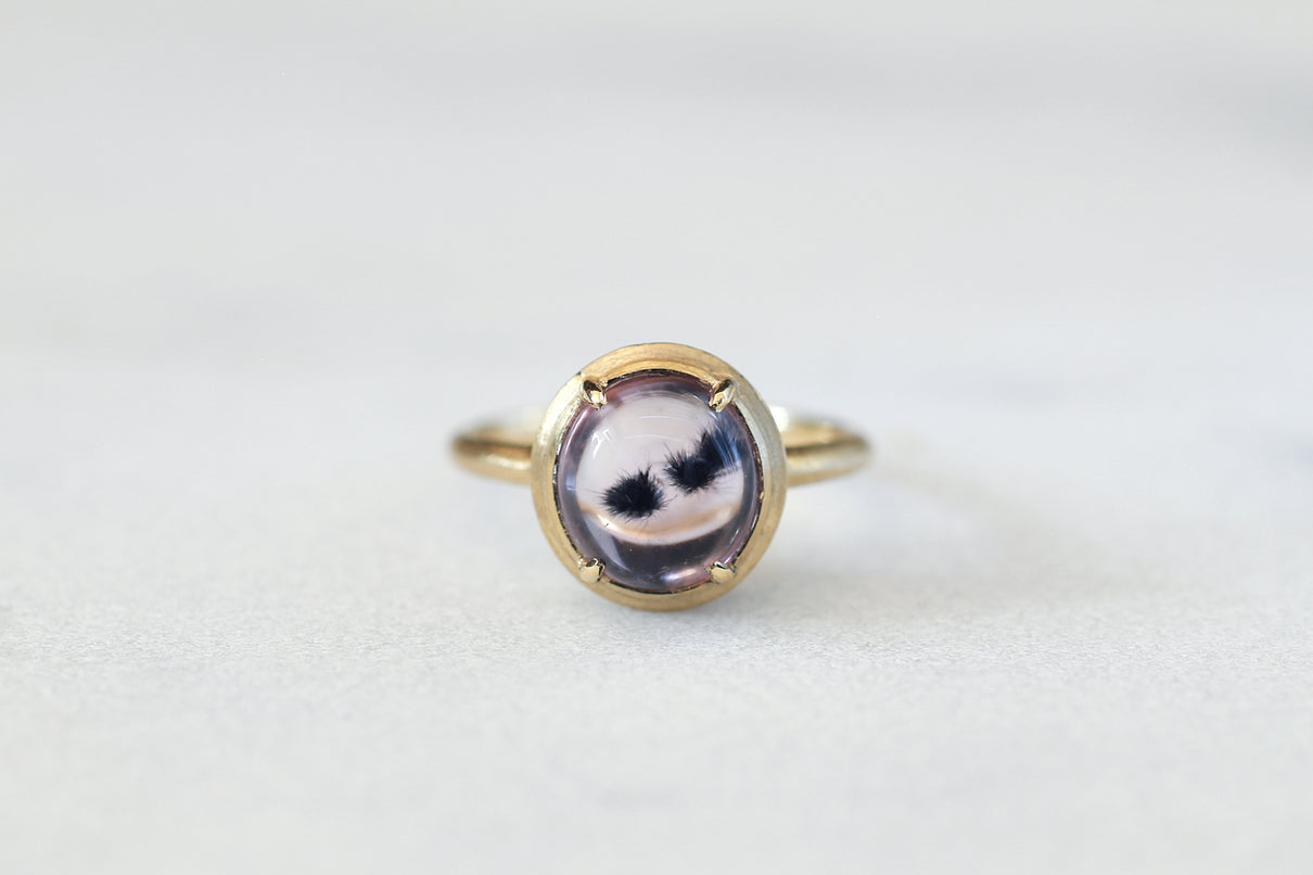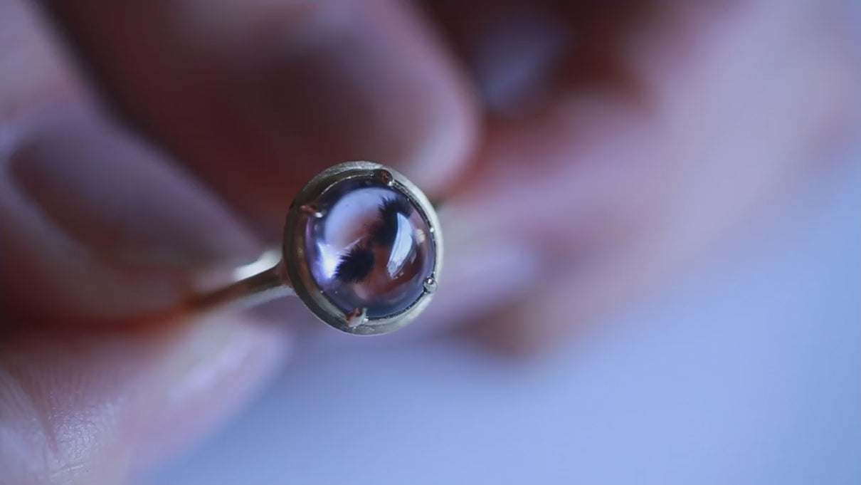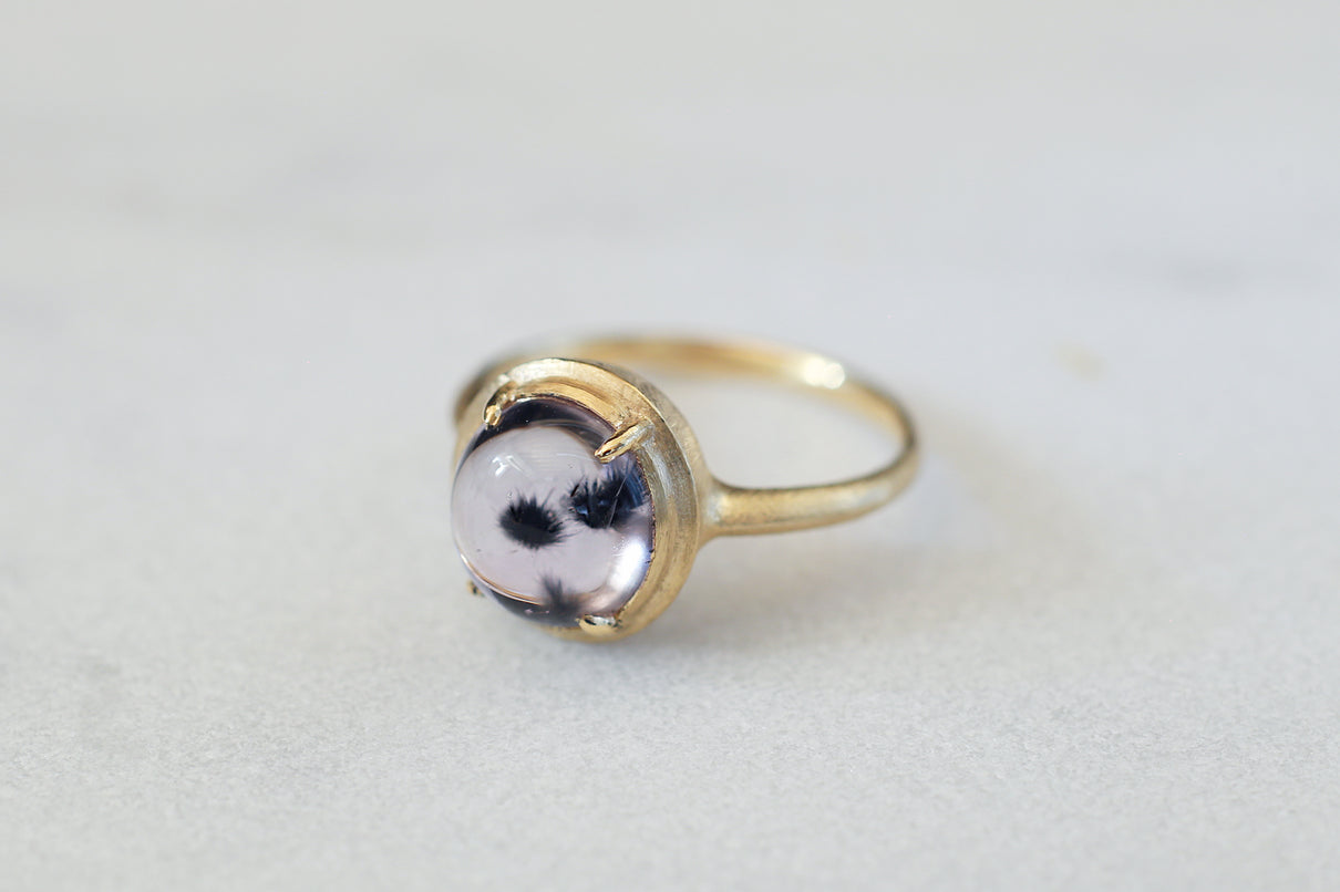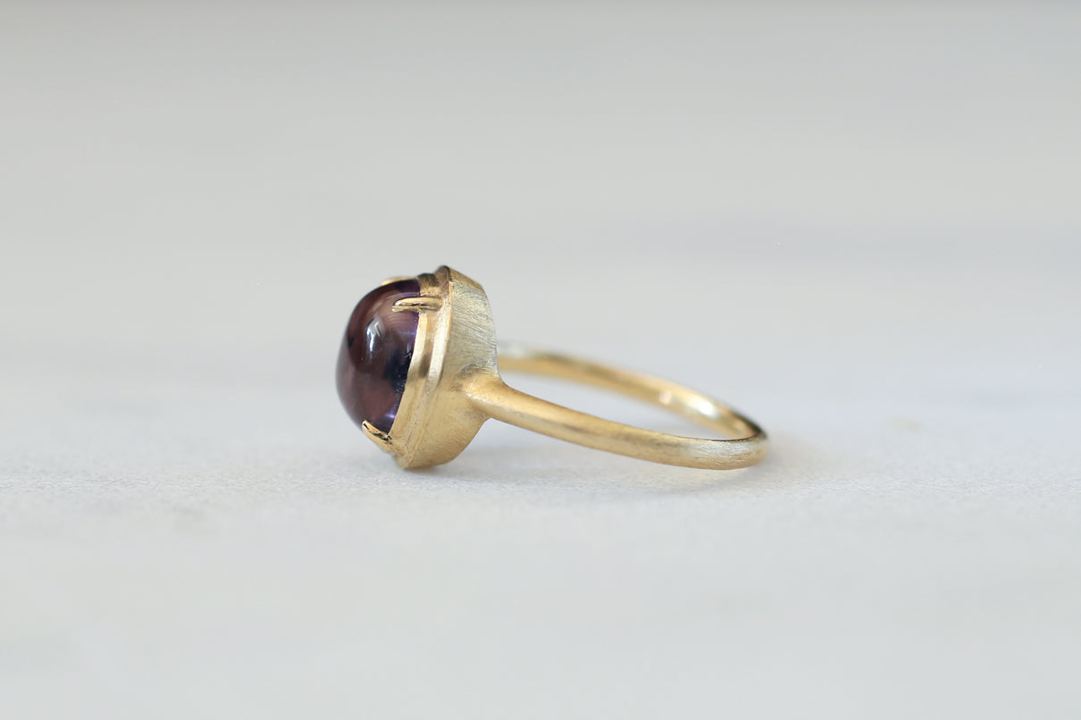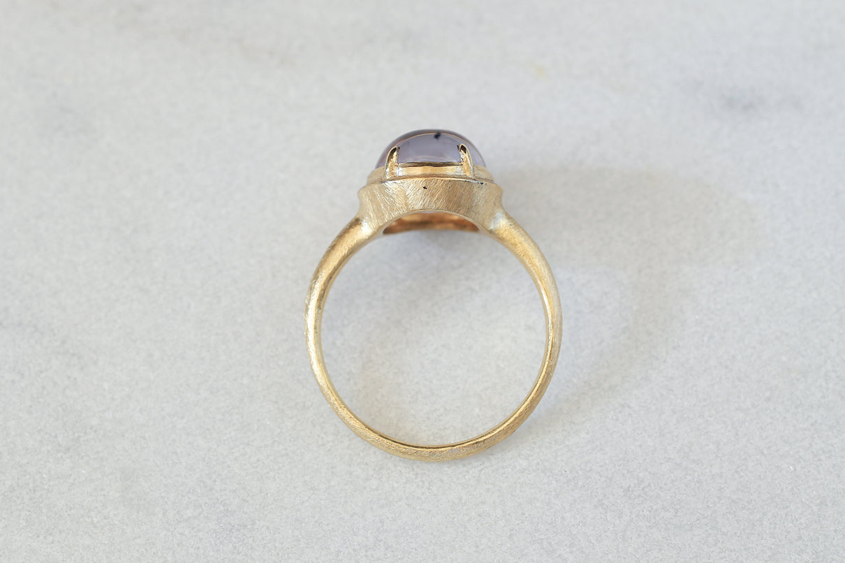 マンガンを多く含む鉱物の一つであるロマネシュ鉱を内包した "ロマネサイトインアメジスト"で仕立てた1点もののリング。2月の誕生石としても有名な石なアメジストですが、中でも内包物がユニークな表情の高品質で希少性の高いピースを厳選しました。こちらは水晶とロマネシュ鉱が共存することが珍しいうえ、アメジストの透明度も高く、冷たく澄んだ水にひっそり暮らす小さな生き物のように、落ち着きと愛らしさを秘めた希少価値の高いロマネサイトインアメジストです。その艶やかで丸みのあるカボションカットを活かしつつ、愛らしい印象になりすぎない様、覆輪留めと爪留めを併せて、シャープに縁取りをした作りの中に繊細さも感じられるリングに仕立てました。K18ゴールドのリング部分には内包物の印象に合わせたランダムかつ直線的なマットテクスチャーを施し、石周りの緻密な細部のみ艶仕上げで洗練させました。ロマネサイトインアメジストのみずみずしく潤みを帯びた美しい表情と、ベーシックながらしっかり存在感放つ佇まいが唯一無二のリング。2月生まれの方の特別なお守りとして贈りものにも最適なアイテムです。