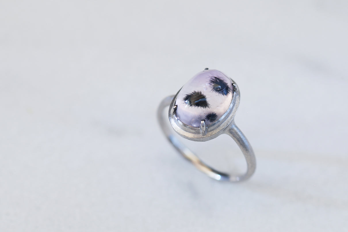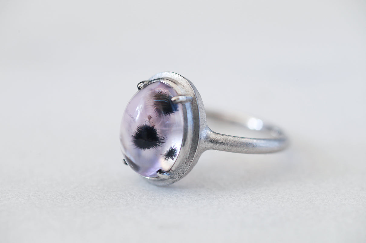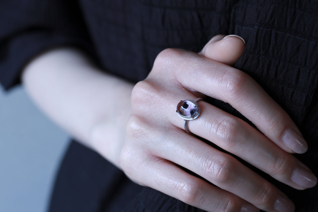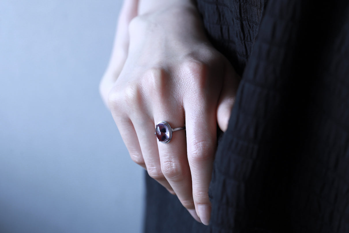 マンガンを多く含む鉱物の一つであるロマネシュ鉱を内包した "ロマネサイトインアメジスト"で仕立てた1点もののリング。2月の誕生石としても有名な石なアメジストですが、中でも内包物がユニークな表情の高品質で希少性の高いピースを厳選しました。こちらは水晶とロマネシュ鉱が共存することが珍しいうえ、アメジストの透明度も高く、冷たく澄んだ水にひっそり暮らす小さな生き物のように、落ち着きと愛らしさを秘めた希少価値の高いロマネサイトインアメジストです。その艶やかで丸みのあるカボションカットを活かしつつ、愛らしい印象になりすぎない様、覆輪留めと爪留めを併せて、シャープに縁取りをした作りの中に繊細さも感じられるリングに仕立てました。プラチナのリング部分には内包物の印象に合わせたランダムかつ直線的なマットテクスチャーを施し、石周りの緻密な細部のみ艶仕上げで洗練させました。ロマネサイトインアメジストのみずみずしく潤みを帯びた美しい表情と、ベーシックながらしっかり存在感放つ佇まいが唯一無二のリング。2月の誕生石としても親しまれているアメジストは、2月生まれの方の特別なお守りとして贈りものにも最適なアイテムです。