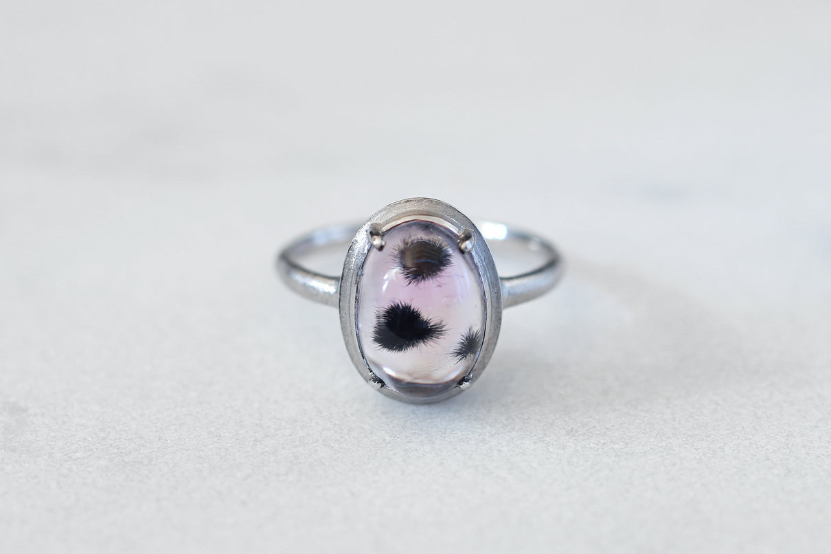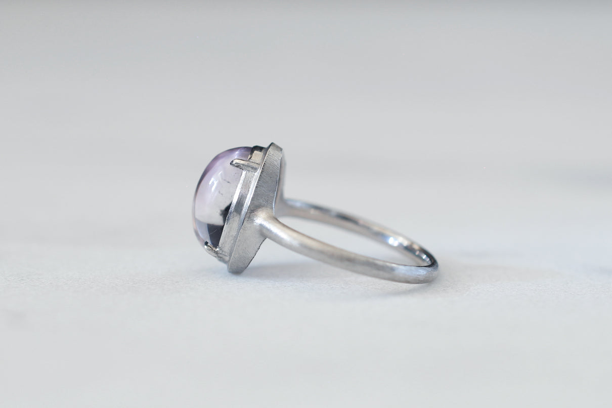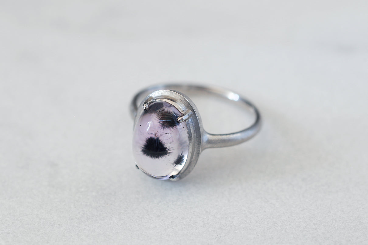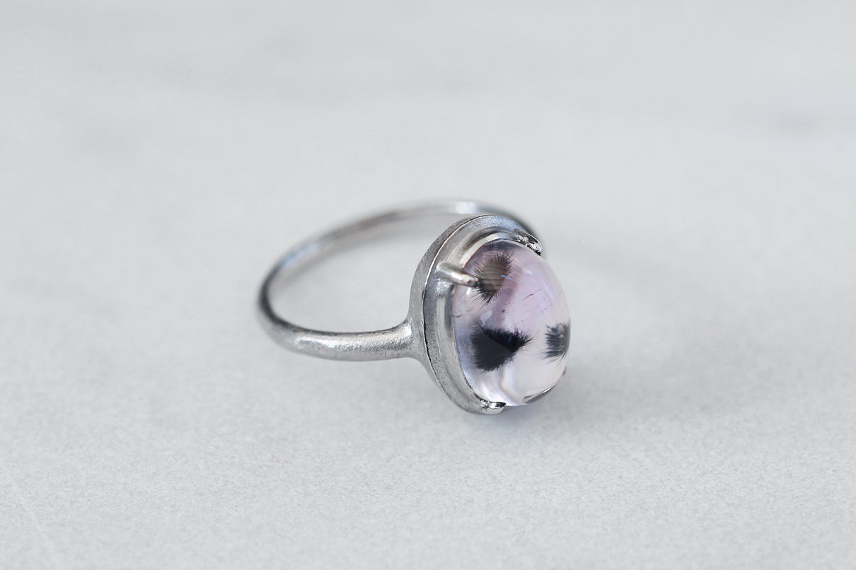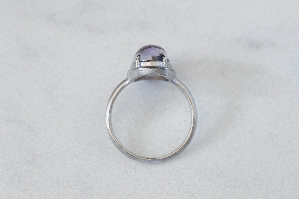 マンガンを多く含む鉱物の一つであるロマネシュ鉱を内包した "ロマネサイトインアメジスト"で仕立てた1点もののリング。2月の誕生石としても有名な石なアメジストですが、中でも内包物がユニークな表情の高品質で希少性の高いピースを厳選しました。こちらは水晶とロマネシュ鉱が共存することが珍しいうえ、アメジストの透明度も高く、冷たく澄んだ水にひっそり暮らす小さな生き物のように、落ち着きと愛らしさを秘めた希少価値の高いロマネサイトインアメジストです。その艶やかで丸みのあるカボションカットを活かしつつ、愛らしい印象になりすぎない様、覆輪留めと爪留めを併せて、シャープに縁取りをした作りの中に繊細さも感じられるリングに仕立てました。プラチナのリング部分には内包物の印象に合わせたランダムかつ直線的なマットテクスチャーを施し、石周りの緻密な細部のみ艶仕上げで洗練させました。ロマネサイトインアメジストのみずみずしく潤みを帯びた美しい表情と、ベーシックながらしっかり存在感放つ佇まいが唯一無二のリング。2月の誕生石としても親しまれているアメジストは、2月生まれの方の特別なお守りとして贈りものにも最適なアイテムです。