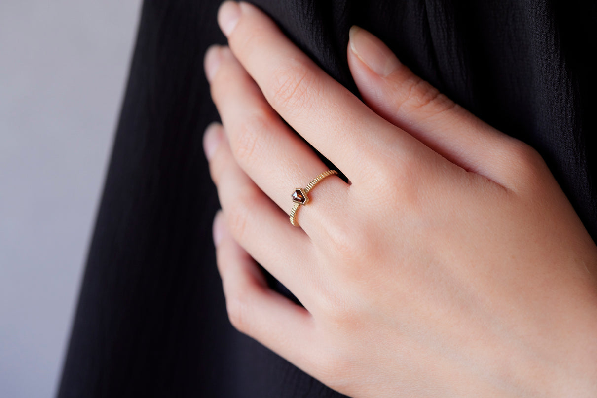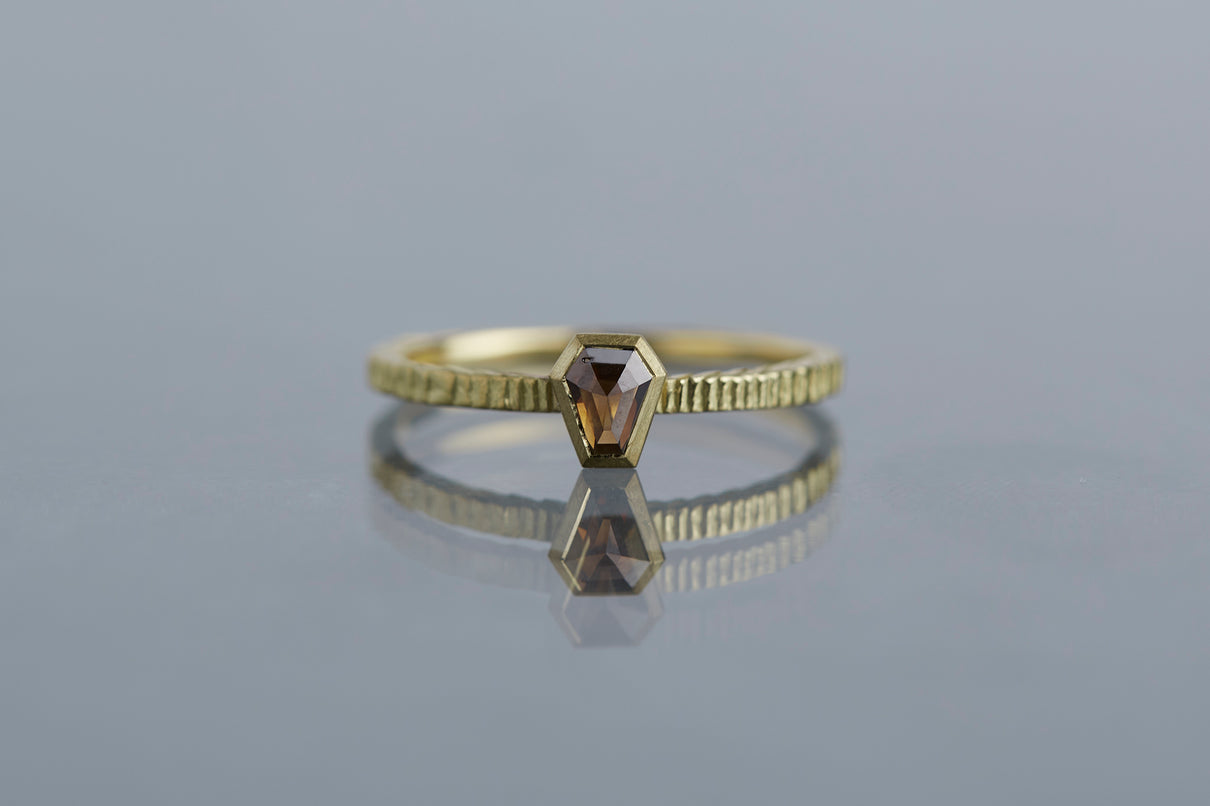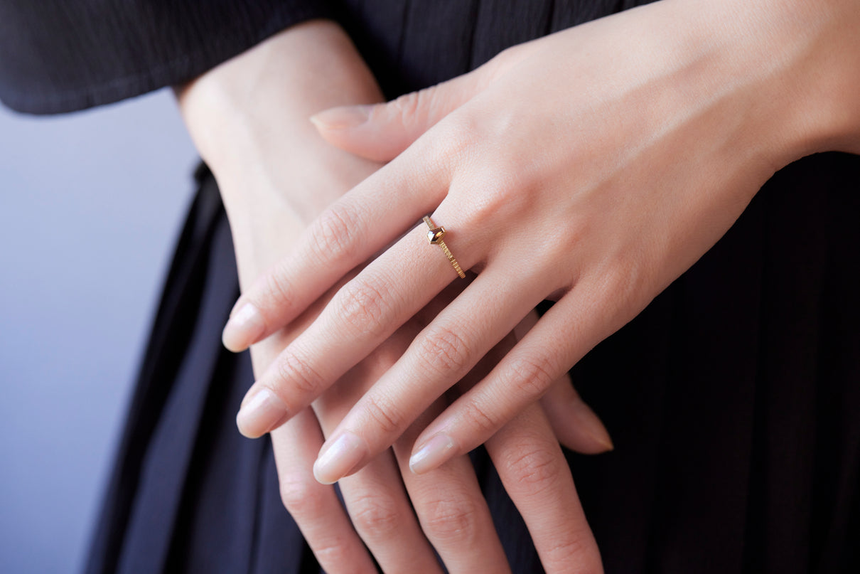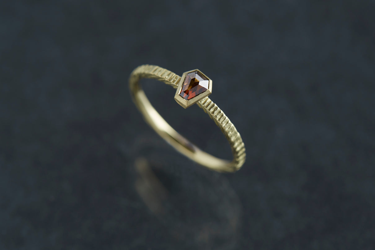 "立ち止まり、目を向ければ 大切なことは 変わらずいつもそこに在る ー" 2023 collection 「Unknown knowns」シリーズのリングをベースに、さりげなく個性を放ち、気品漂うシールドのようなクラシカルなカットのダイヤモンドを留めた1点物のリング。こっくりとした深みのあるオレンジブラウンのカラーのダイヤモンドが、指元を印象的に飾ります。細身のアームは軽やかな付け心地で、普段使いのリングとしてもおすすめです。
