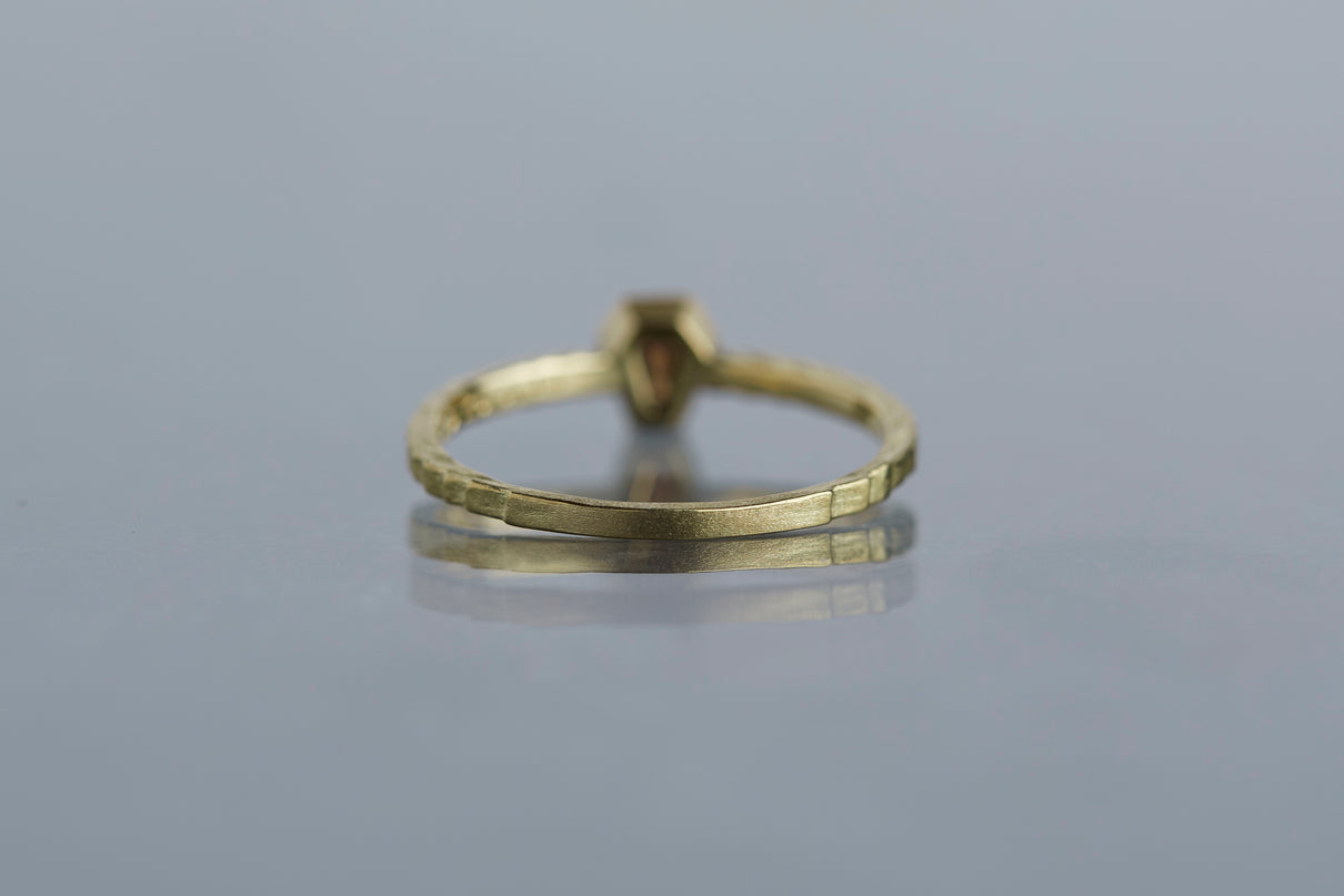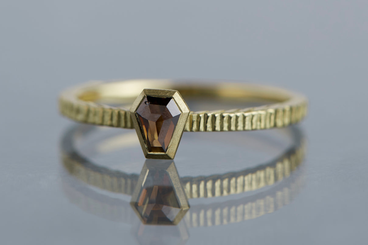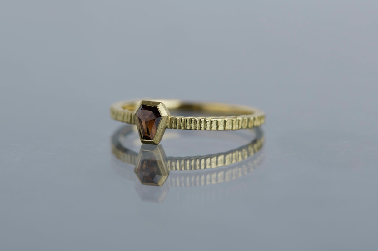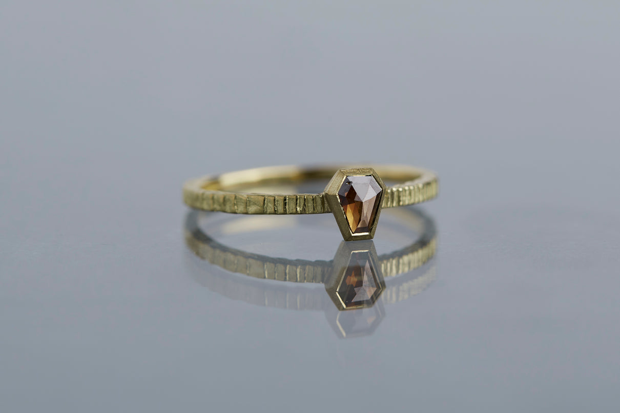 "立ち止まり、目を向ければ 大切なことは 変わらずいつもそこに在る ー" 2023 collection 「Unknown knowns」シリーズのリングをベースに、さりげなく個性を放ち、気品漂うシールドのようなクラシカルなカットのダイヤモンドを留めた1点物のリング。こっくりとした深みのあるオレンジブラウンのカラーのダイヤモンドが、指元を印象的に飾ります。細身のアームは軽やかな付け心地で、普段使いのリングとしてもおすすめです。