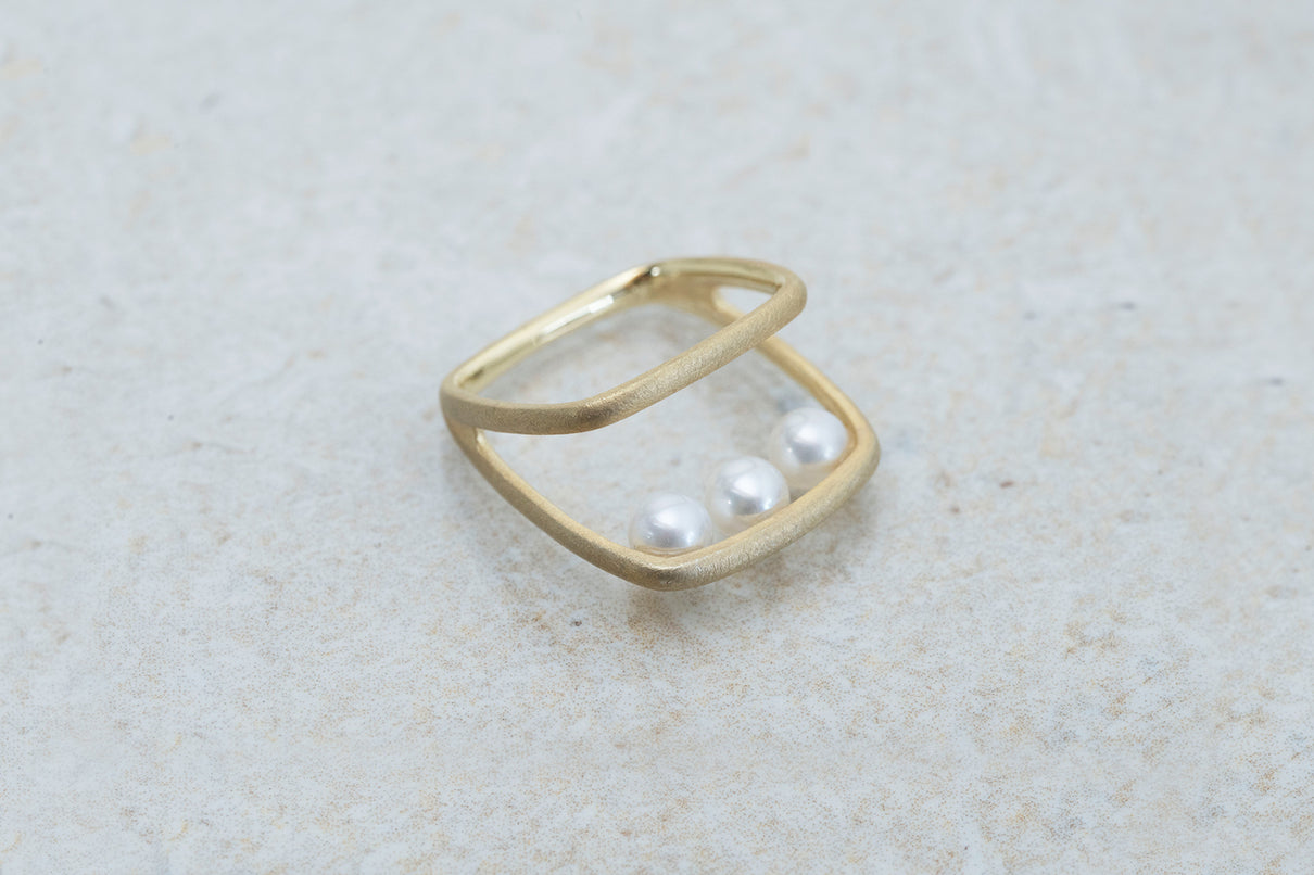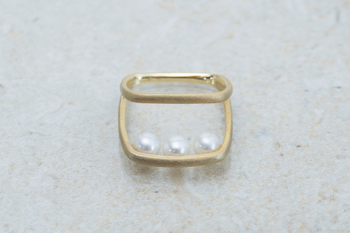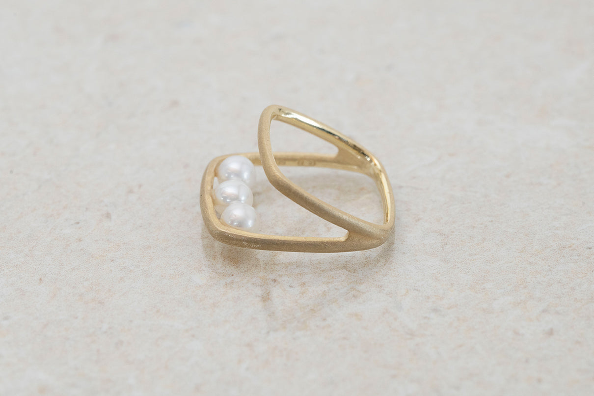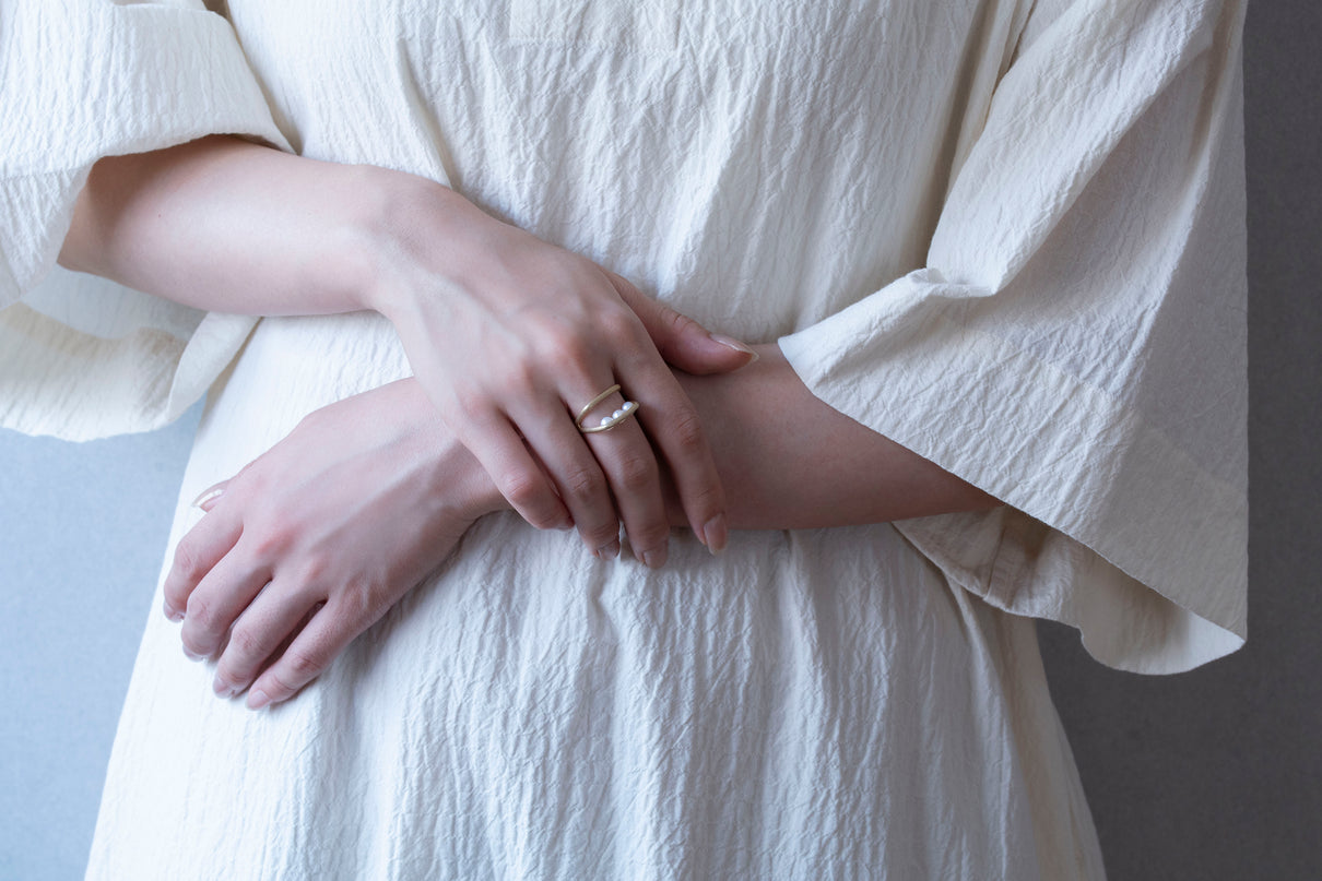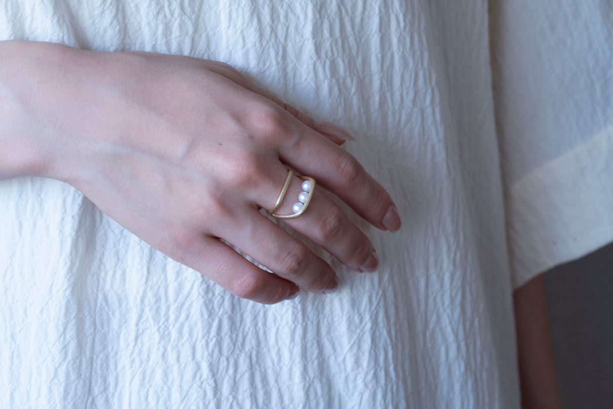 Syami ringのフォルムを生かし、軽やかなダブルアームにデザインしたリング。身につけると2本のリングを纏っているような空間が生まれる、建築的な構造が魅力です。片側のアームに高さを持たせ、内側に三粒の艶やかなパールをあしらうことで、シンプルながらユニークな存在感が生まれました。表面はマットテクスチャーを施した柔らかな仕上げ。四角いフォルムのリングは回りにくく、また光沢仕上げをした内側は指に沿うよう緩やかなカーブを描いており、そのなめらかなフィット感は身に付けるのが楽しみになる程。気兼ねなくデイリーに楽しむリングとしてもお勧めです。本商品は約12号 , 約15号の2サイズ展開です。(四角いリングのためサイズ直し不可となります。)