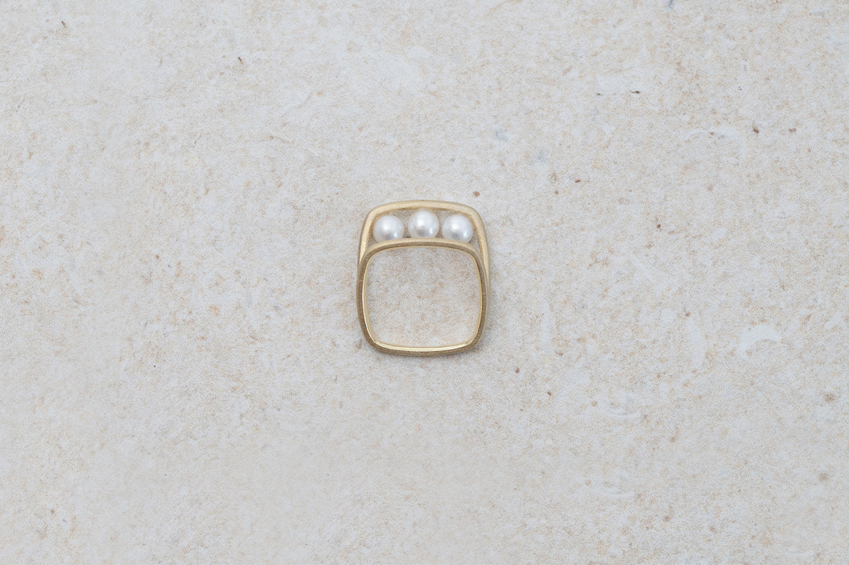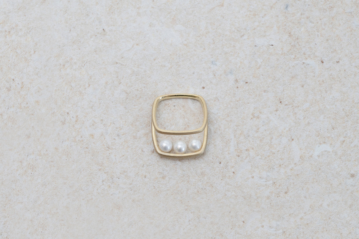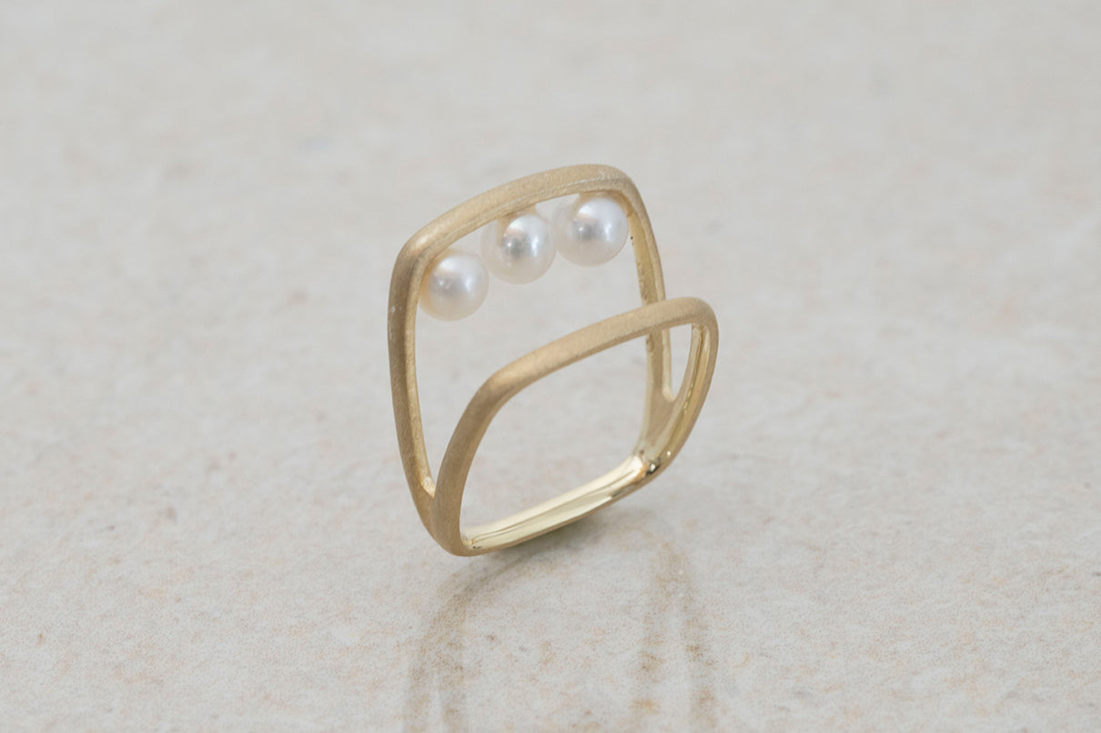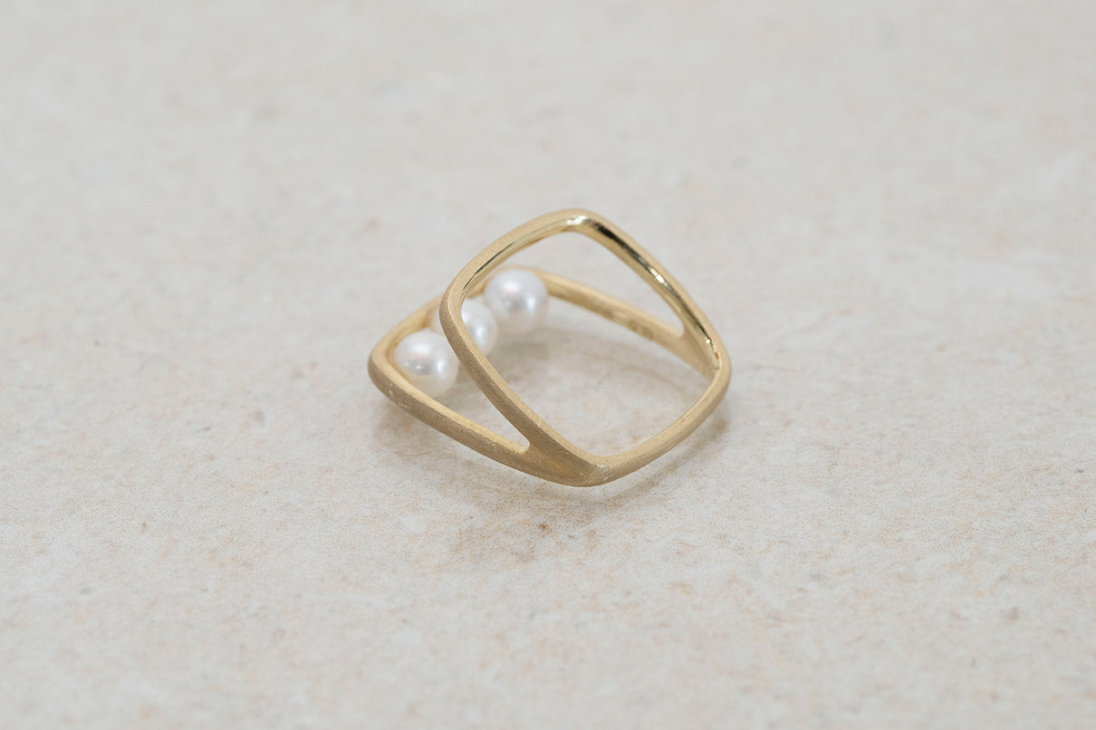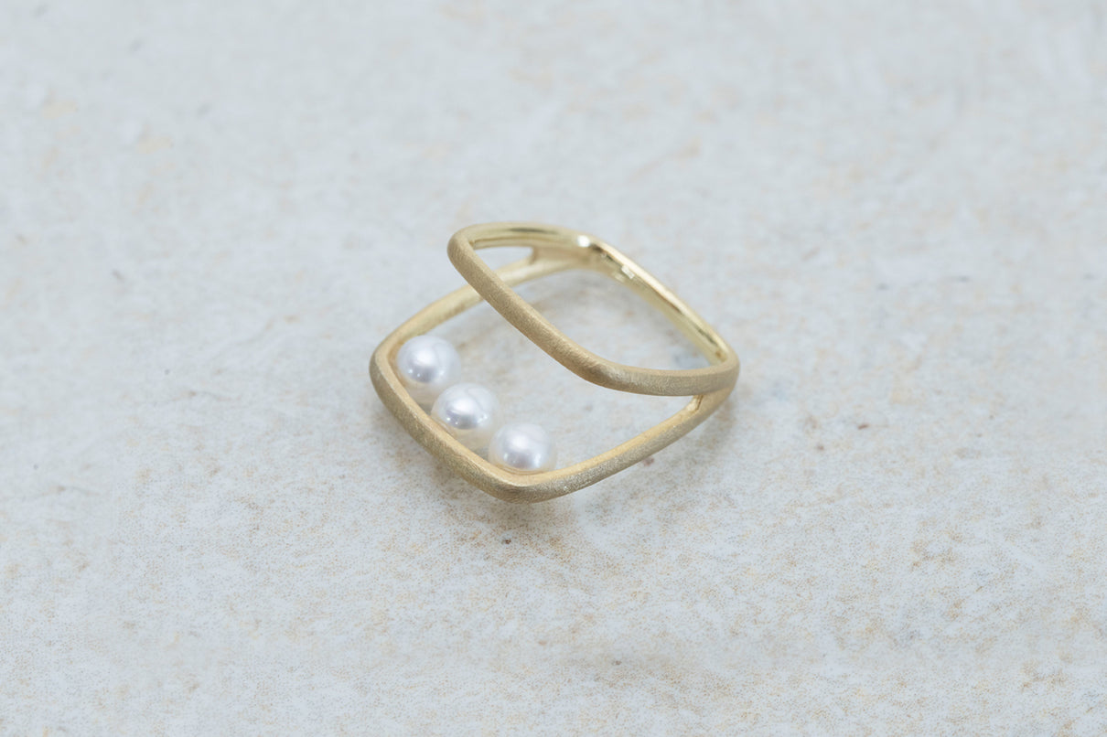 Syami ringのフォルムを生かし、軽やかなダブルアームにデザインしたリング。身につけると2本のリングを纏っているような空間が生まれる、建築的な構造が魅力です。片側のアームに高さを持たせ、内側に三粒の艶やかなパールをあしらうことで、シンプルながらユニークな存在感が生まれました。表面はマットテクスチャーを施した柔らかな仕上げ。四角いフォルムのリングは回りにくく、また光沢仕上げをした内側は指に沿うよう緩やかなカーブを描いており、そのなめらかなフィット感は身に付けるのが楽しみになる程。気兼ねなくデイリーに楽しむリングとしてもお勧めです。本商品は約12号 , 約15号の2サイズ展開です。(四角いリングのためサイズ直し不可となります。)