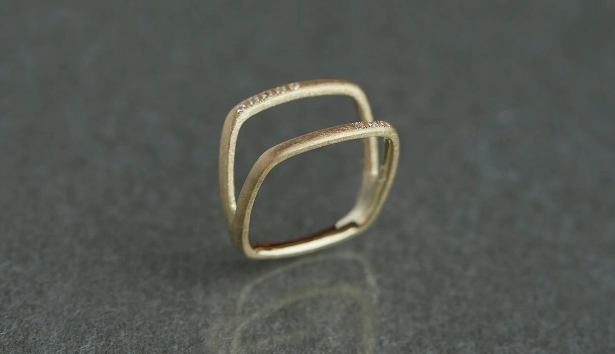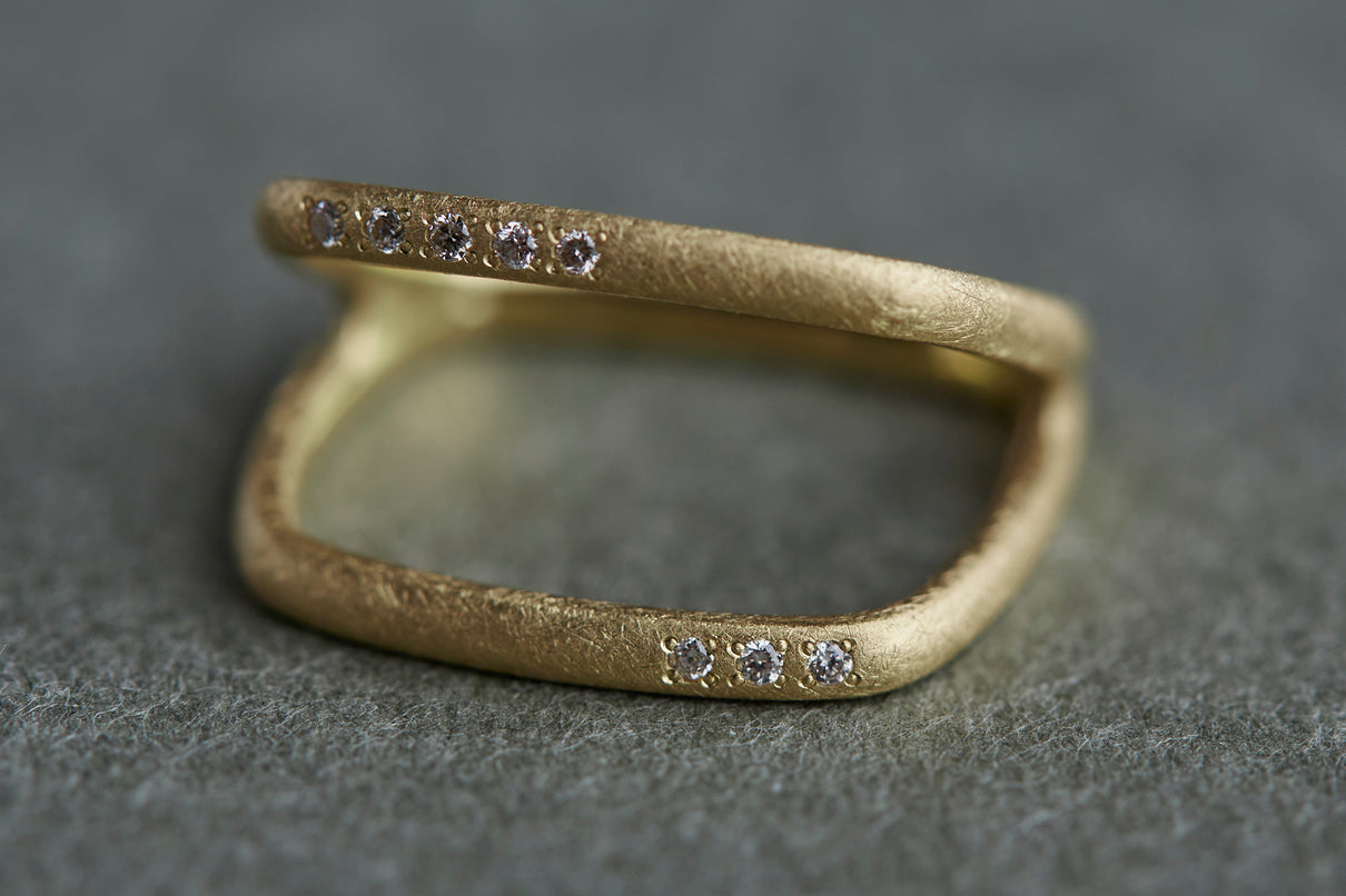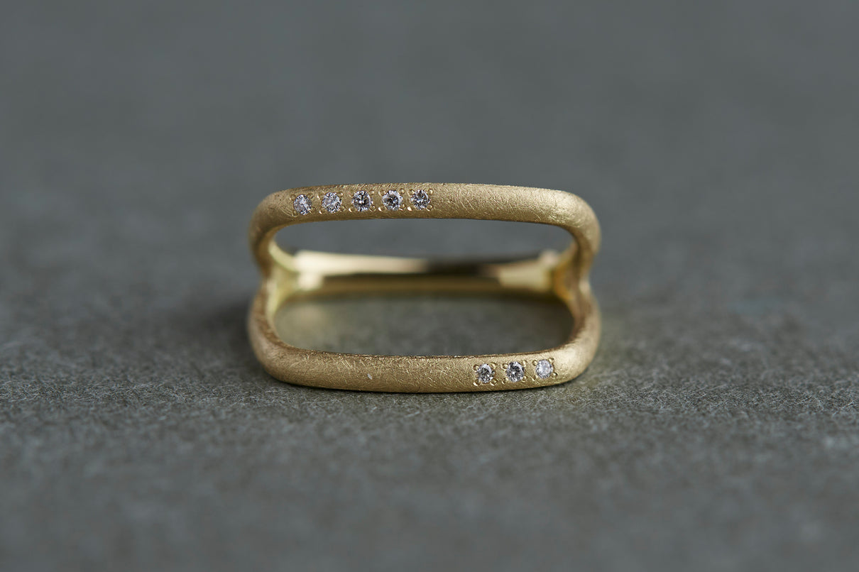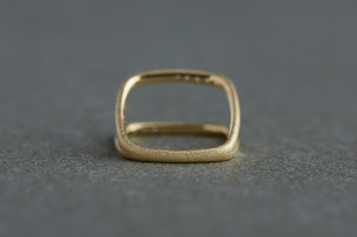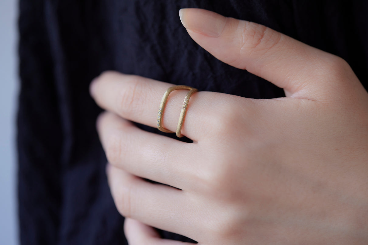 Syami ringのフォルムを生かし、軽やかなダブルアームに仕立てたリング。身につけると2本のリングを纏っているような空間が生まれる、建築的な構造が魅力です。表面はマットテクスチャーを施した柔らかな仕上げで、トップにはアシンメトリーに留めた8石のメレダイヤモンドが繊細に煌めき個性を放ちます。四角いフォルムのリングは回りにくく、また光沢仕上げをした内側は指に沿うよう緩やかなカーブを描いており、そのなめらかなフィット感は身に付けるのが楽しみになる程。気兼ねなくデイリーに楽しむリングとしてもお勧めです。本商品は約9号 , 12号 , 15号の3展開です。(四角いリングのためサイズ直し不可となります。)