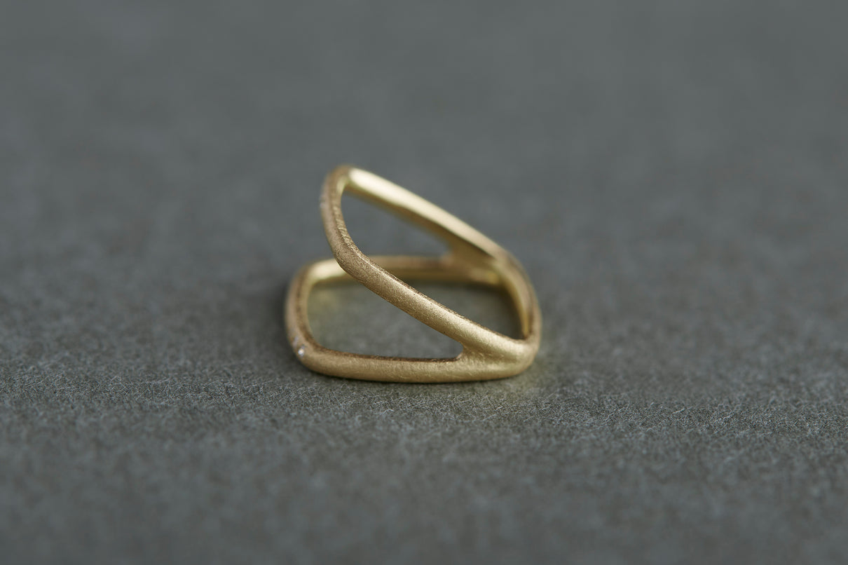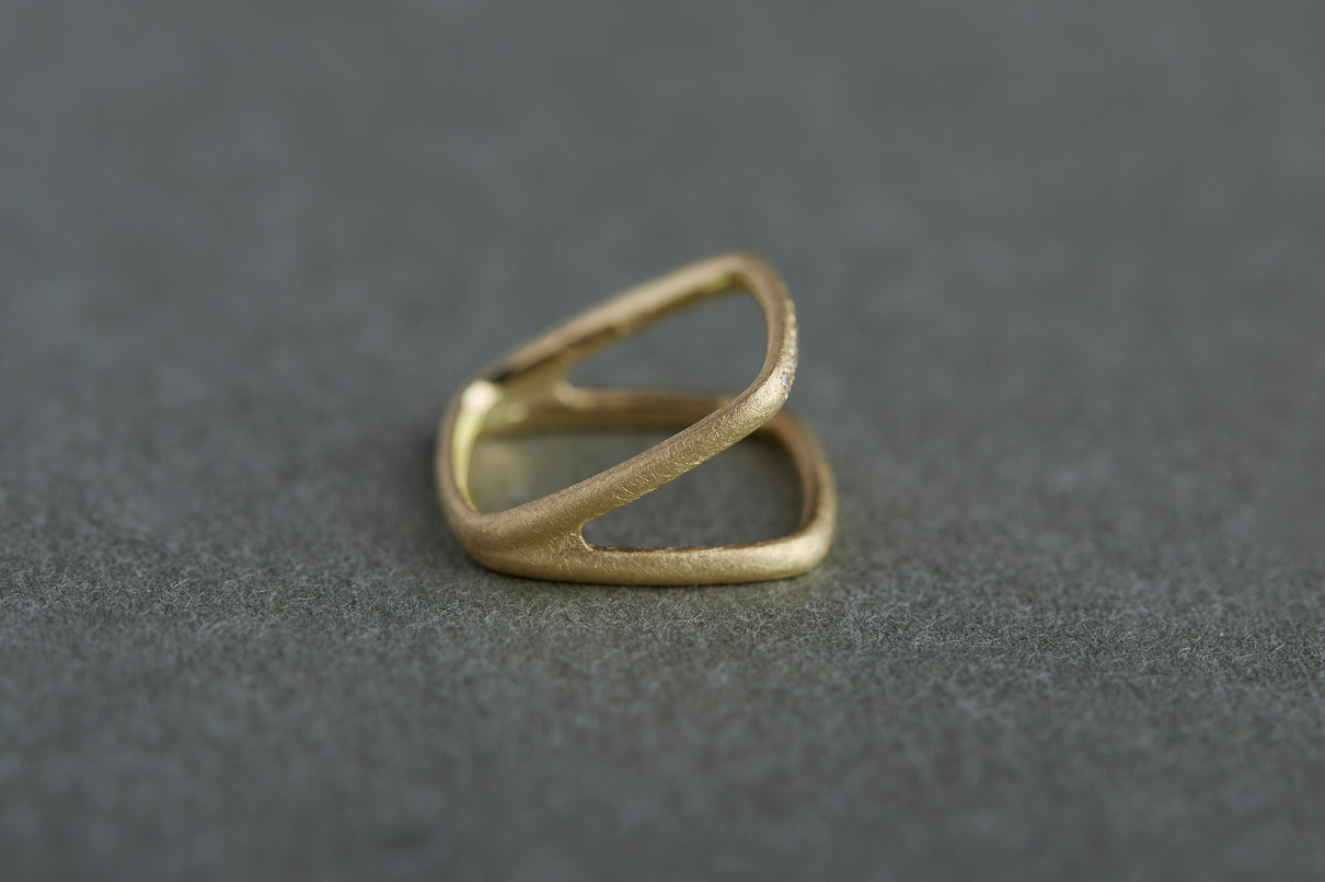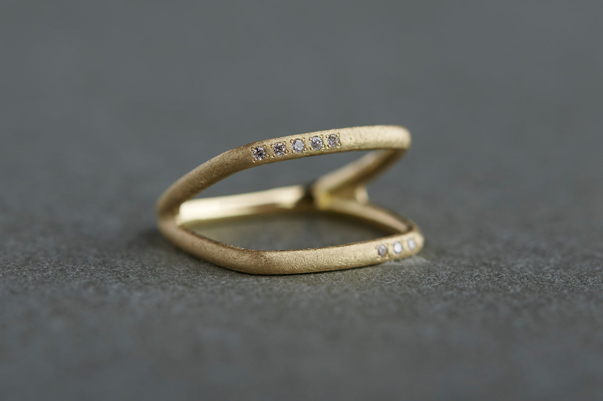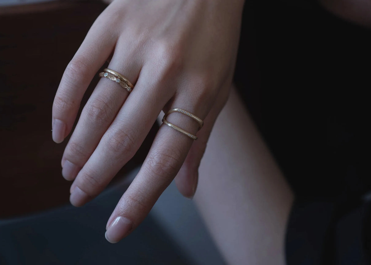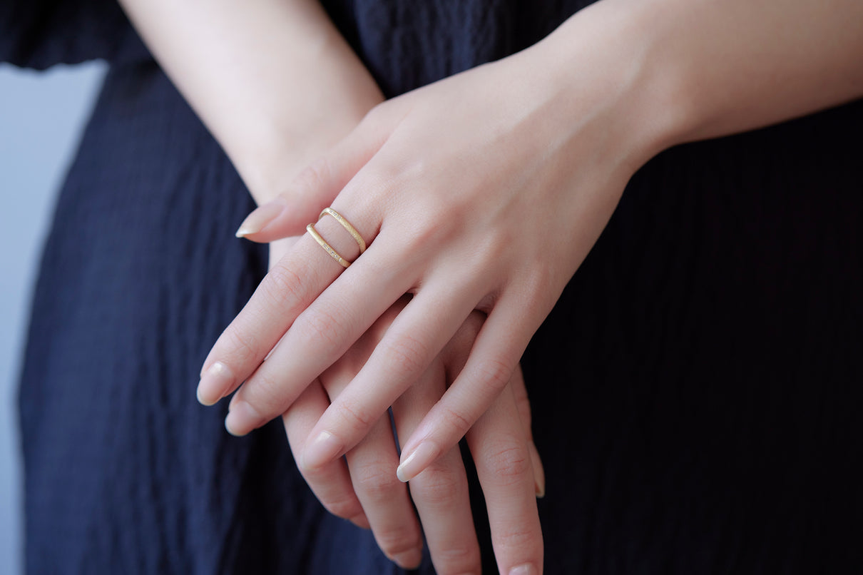 Syami ringのフォルムを生かし、軽やかなダブルアームに仕立てたリング。身につけると2本のリングを纏っているような空間が生まれる、建築的な構造が魅力です。表面はマットテクスチャーを施した柔らかな仕上げで、トップにはアシンメトリーに留めた8石のメレダイヤモンドが繊細に煌めき個性を放ちます。四角いフォルムのリングは回りにくく、また光沢仕上げをした内側は指に沿うよう緩やかなカーブを描いており、そのなめらかなフィット感は身に付けるのが楽しみになる程。気兼ねなくデイリーに楽しむリングとしてもお勧めです。本商品は約9号 , 12号 , 15号の3展開です。(四角いリングのためサイズ直し不可となります。)