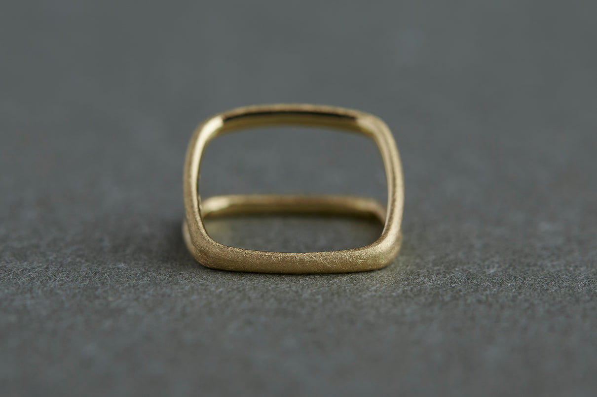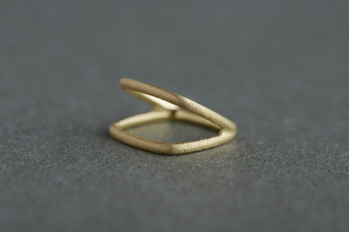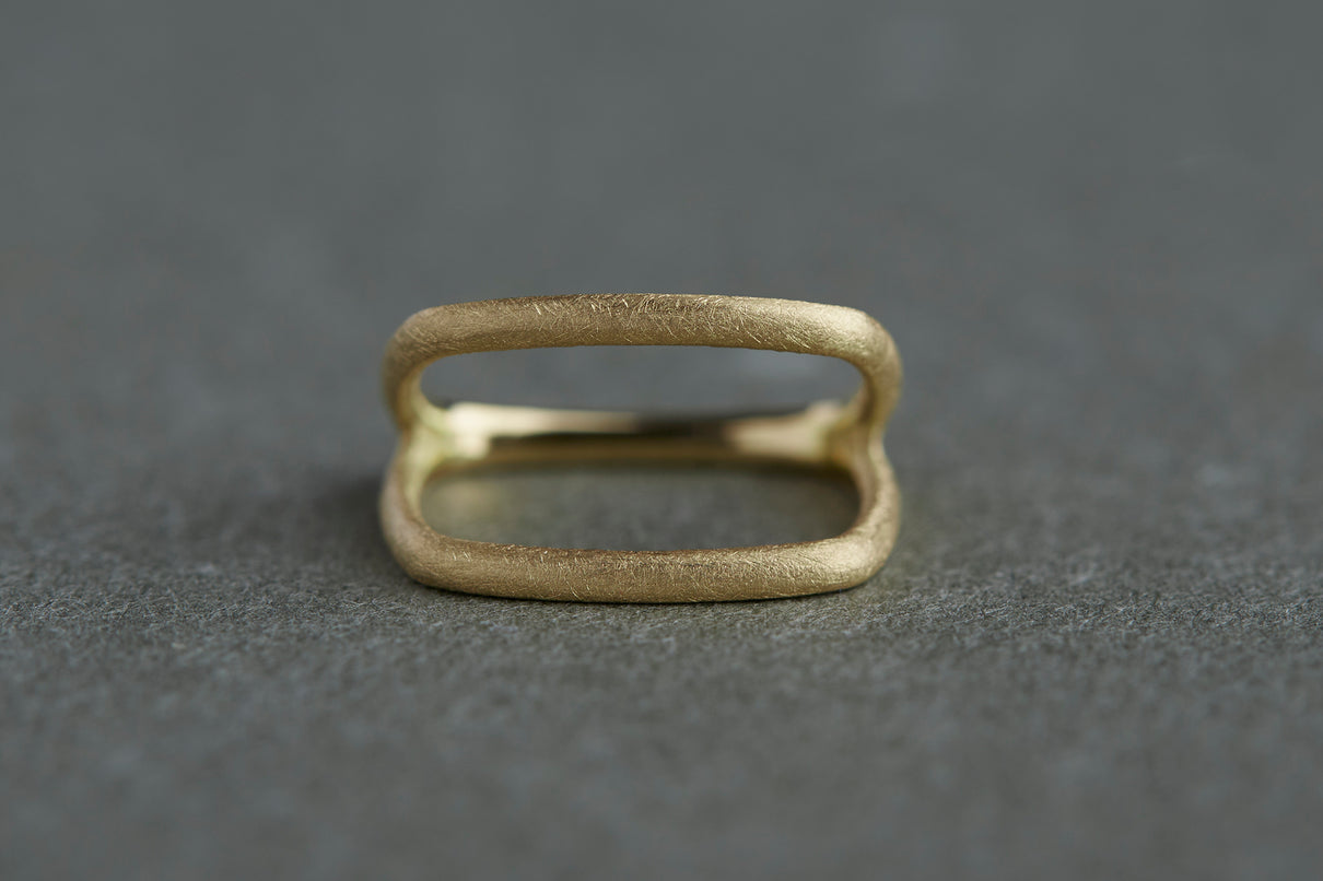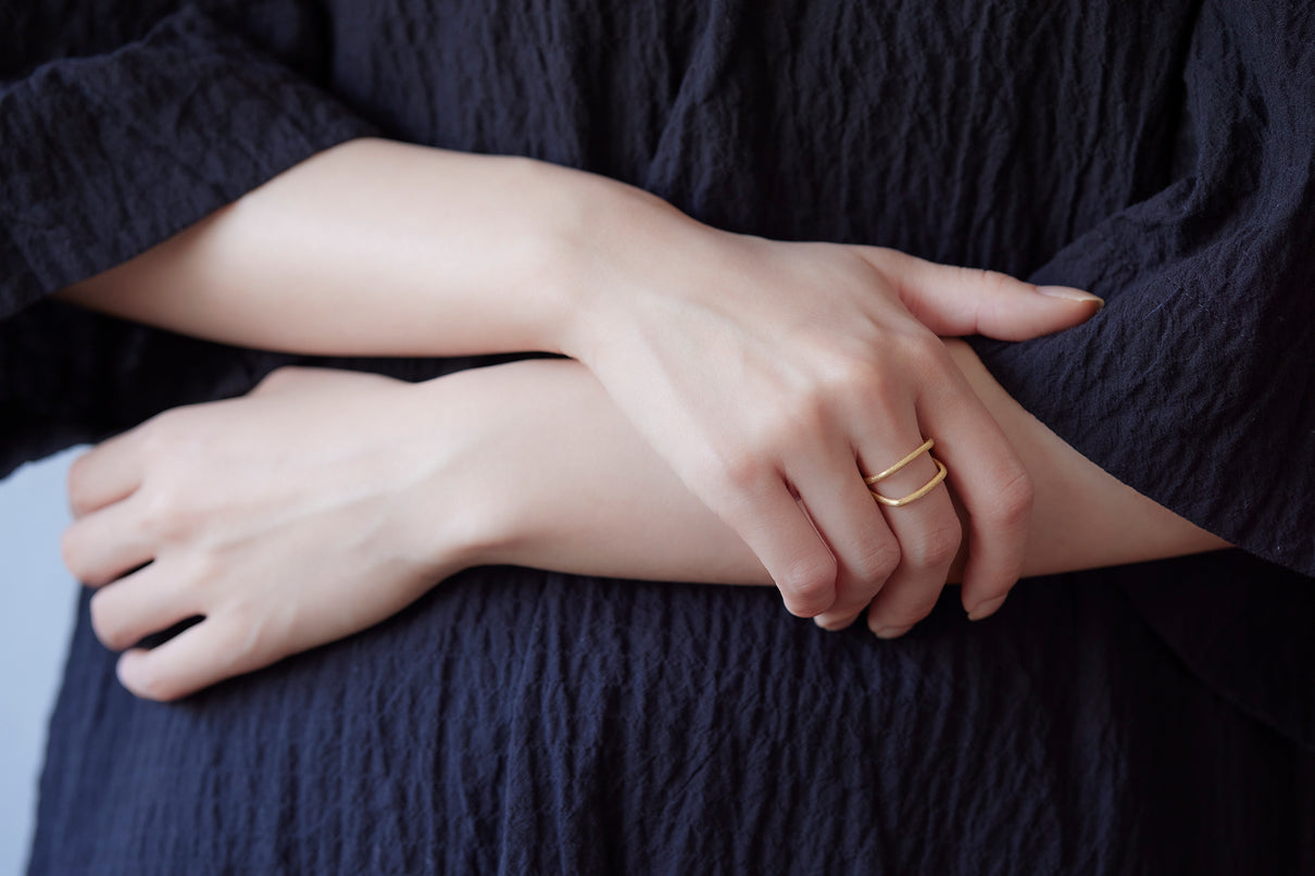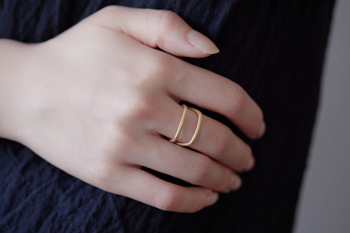 Syami ringのフォルムを生かし、軽やかなダブルアームに仕立てたリング。身につけると2本のリングを纏っているような空間が生まれる、建築的な構造が魅力です。表面はマットテクスチャーを施した柔らかな仕上げ。四角いフォルムのリングは回りにくく、また光沢仕上げをした内側は指に沿うよう緩やかなカーブを描いており、そのなめらかなフィット感は身に付けるのが楽しみになる程。気兼ねなくデイリーに楽しむリングとしてもお勧めです。本商品は約9号 , 12号 , 15号の3展開です。(四角いリングのためサイズ直し不可となります。)