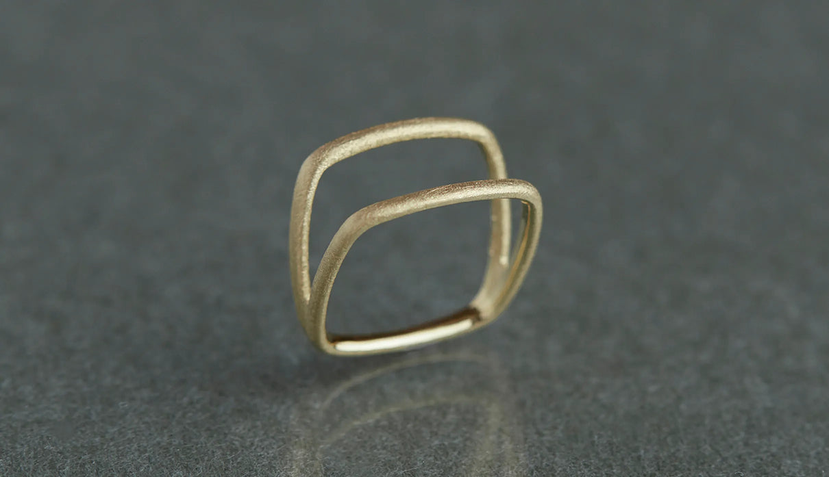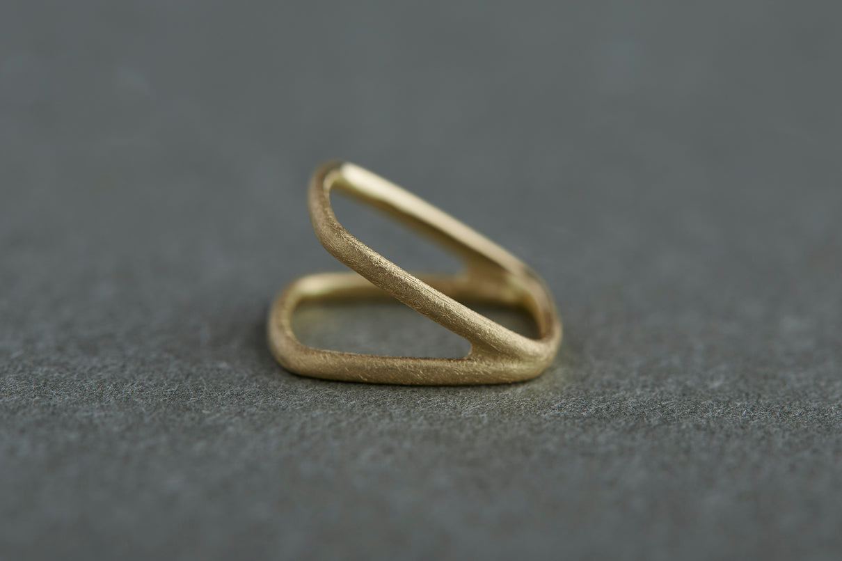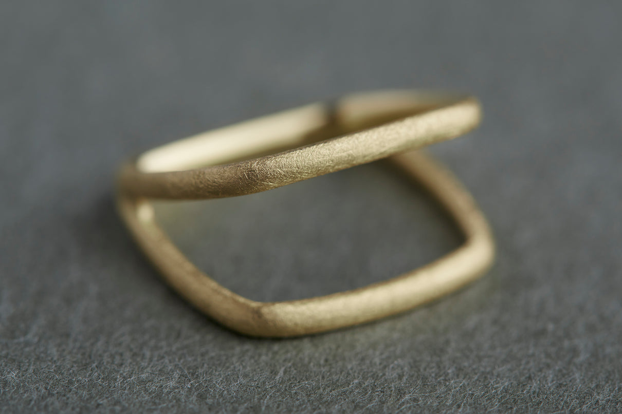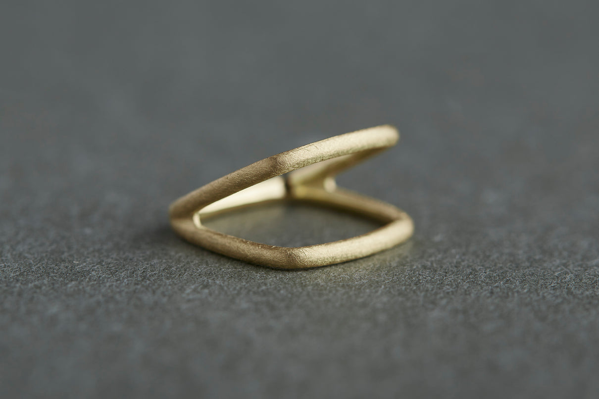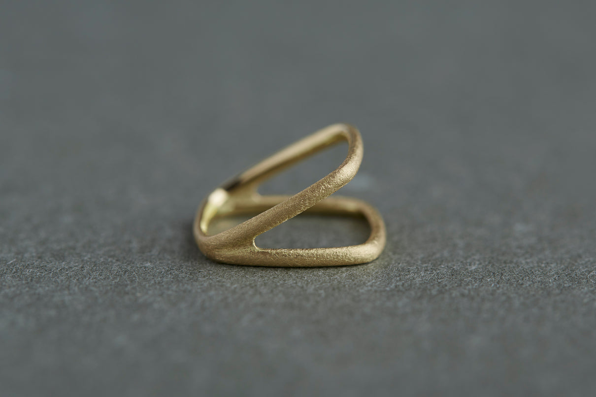 Syami ringのフォルムを生かし、軽やかなダブルアームに仕立てたリング。身につけると2本のリングを纏っているような空間が生まれる、建築的な構造が魅力です。表面はマットテクスチャーを施した柔らかな仕上げ。四角いフォルムのリングは回りにくく、また光沢仕上げをした内側は指に沿うよう緩やかなカーブを描いており、そのなめらかなフィット感は身に付けるのが楽しみになる程。気兼ねなくデイリーに楽しむリングとしてもお勧めです。本商品は約9号 , 12号 , 15号の3展開です。(四角いリングのためサイズ直し不可となります。)