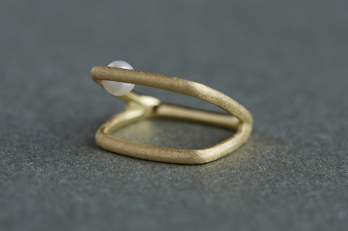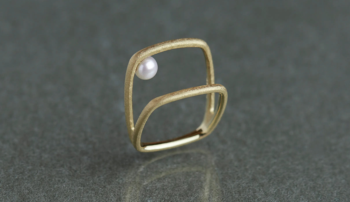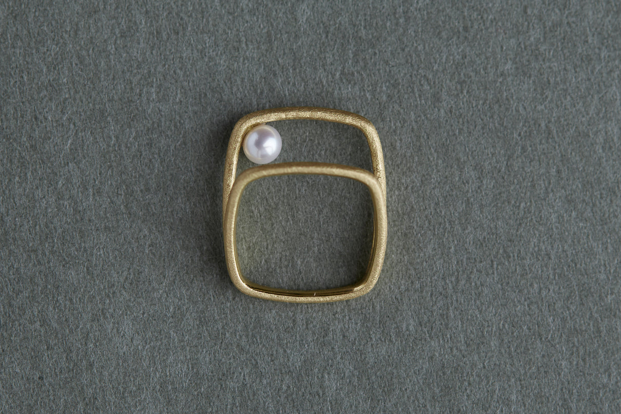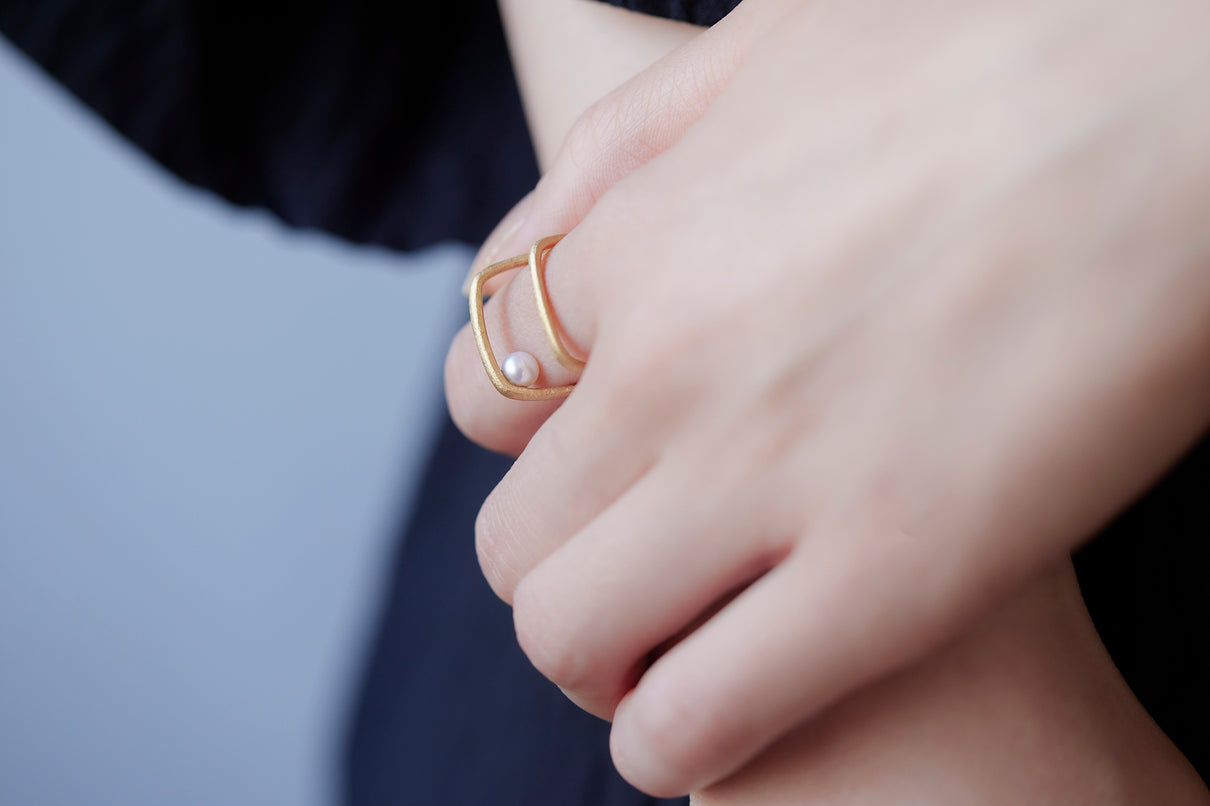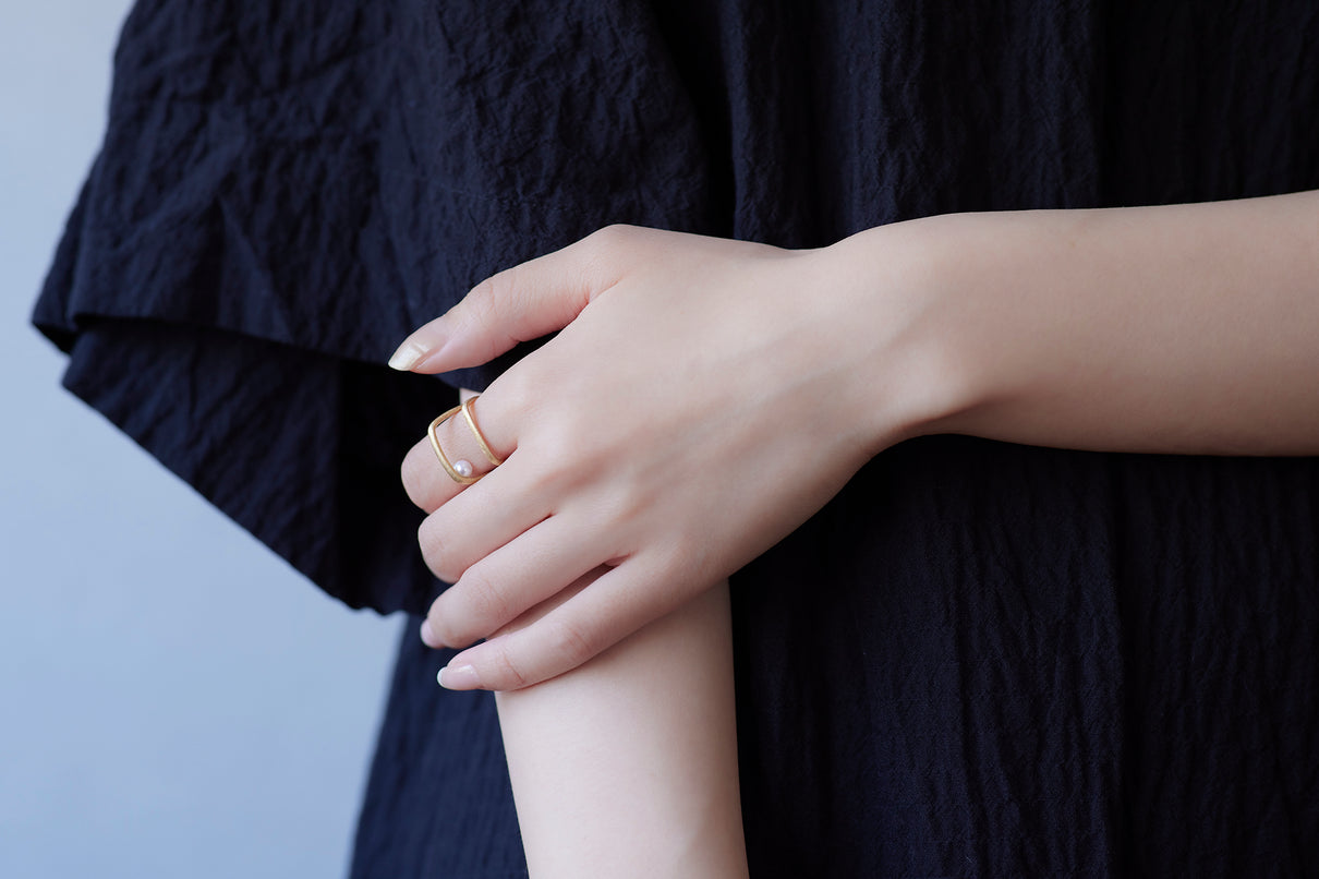 Syami ringのフォルムを生かし、軽やかなダブルアームに仕立てたリング。身につけると2本のリングを纏っているような空間が生まれる、建築的な構造が魅力です。片側のアームに高さを持たせ、内側に一粒の艶やかなパールをあしらうことで、シンプルながらユニークな存在感が生まれました。表面はマットテクスチャーを施した柔らかな仕上げ。四角いフォルムのリングは回りにくく、また光沢仕上げをした内側は指に沿うよう緩やかなカーブを描いており、そのなめらかなフィット感は身に付けるのが楽しみになる程。気兼ねなくデイリーに楽しむリングとしてもお勧めです。本商品は約9号 , 12号 , 15号の3展開です。(四角いリングのためサイズ直し不可となります。)