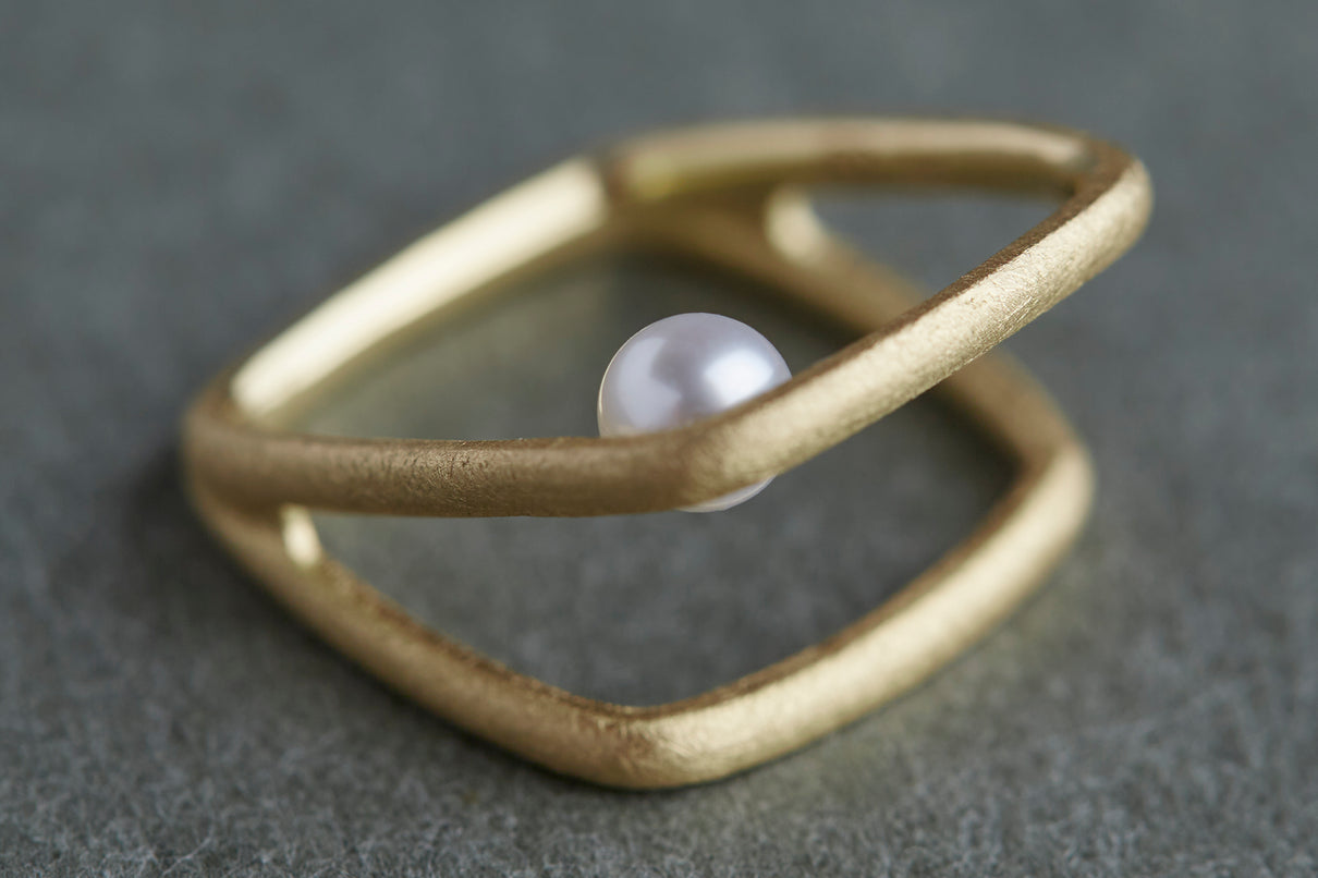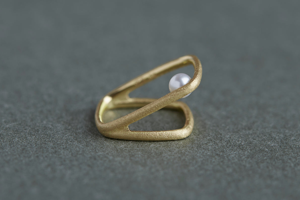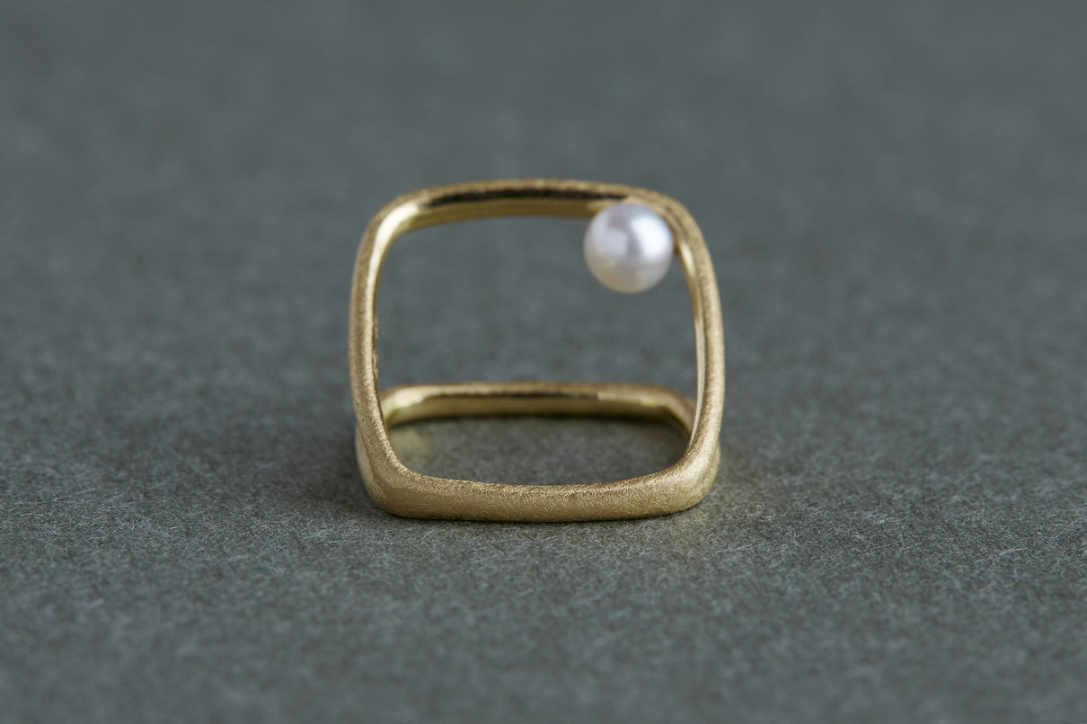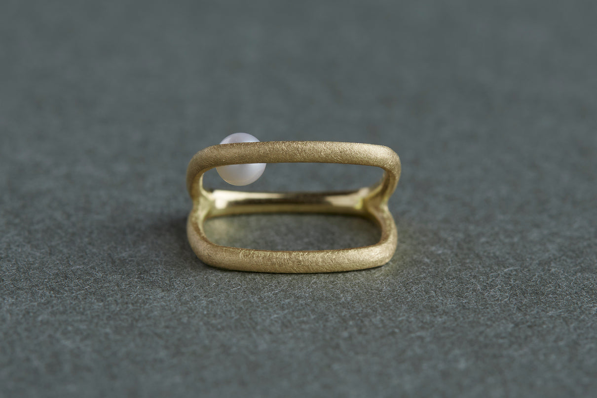 Syami ringのフォルムを生かし、軽やかなダブルアームに仕立てたリング。身につけると2本のリングを纏っているような空間が生まれる、建築的な構造が魅力です。片側のアームに高さを持たせ、内側に一粒の艶やかなパールをあしらうことで、シンプルながらユニークな存在感が生まれました。表面はマットテクスチャーを施した柔らかな仕上げ。四角いフォルムのリングは回りにくく、また光沢仕上げをした内側は指に沿うよう緩やかなカーブを描いており、そのなめらかなフィット感は身に付けるのが楽しみになる程。気兼ねなくデイリーに楽しむリングとしてもお勧めです。本商品は約9号 , 12号 , 15号の3展開です。(四角いリングのためサイズ直し不可となります。)
