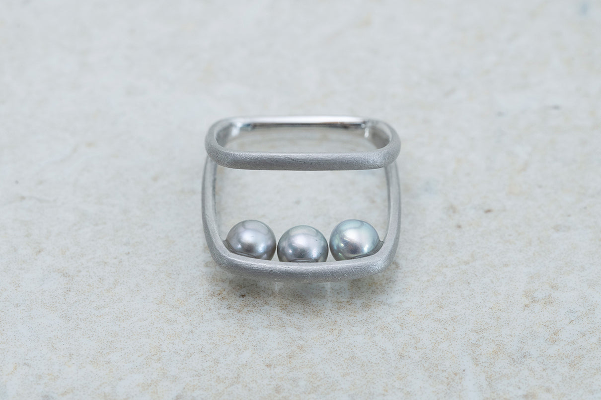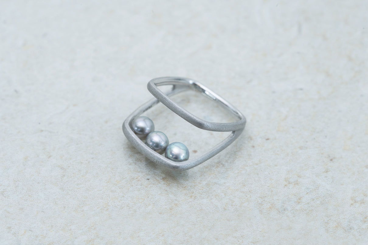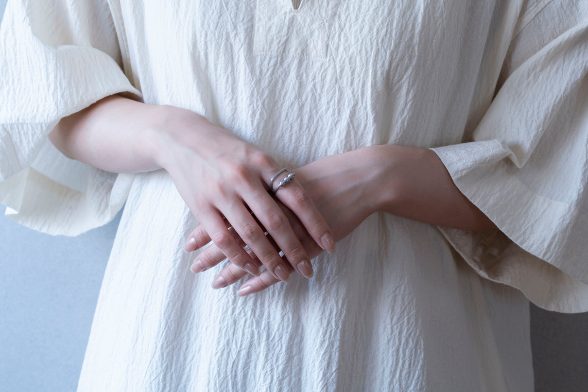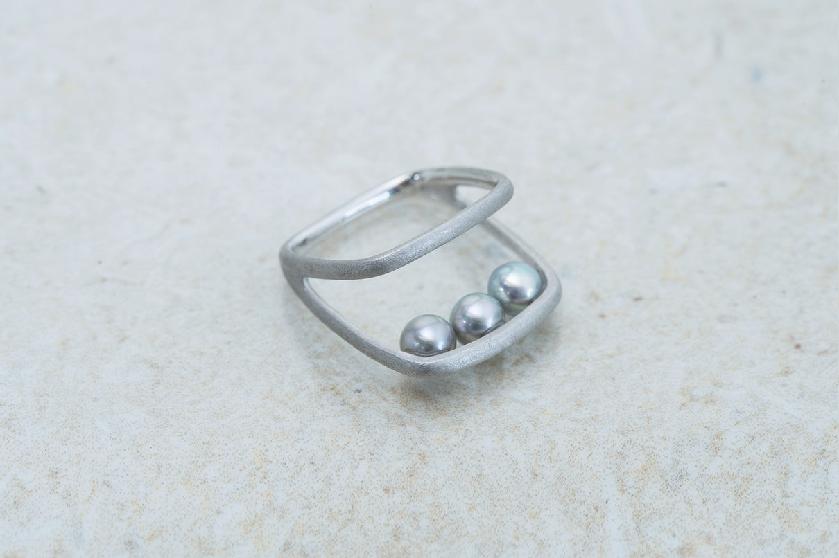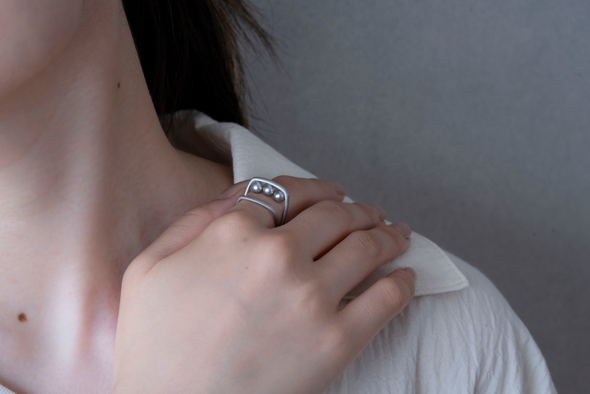 Syami ringのフォルムを生かし軽やかなダブルアームにデザインしたリング。身につけると2本のリングを纏っているような空間が生まれる、建築的な構造が魅力です。片側のアームに高さを持たせ、内側に三粒の艶やかなパールをあしらうことで、シンプルながらユニークな存在感が生まれました。生産量が減少傾向にあり、入手が困難なグレーパール。そのため、こちらのグレーパールのデザインは数量限定でのお仕立てとなります。表面はマットテクスチャーを施した柔らかな仕上げ。四角いフォルムのリングは回りにくく、また光沢仕上げをした内側は指に沿うよう緩やかなカーブを描いており、そのなめらかなフィット感は身に付けるのが楽しみになる程。気兼ねなくデイリーに楽しむリングとしてもお勧めです。本商品は約12号 , 約15号の2サイズ展開です。(四角いリングのためサイズ直し不可となります。)