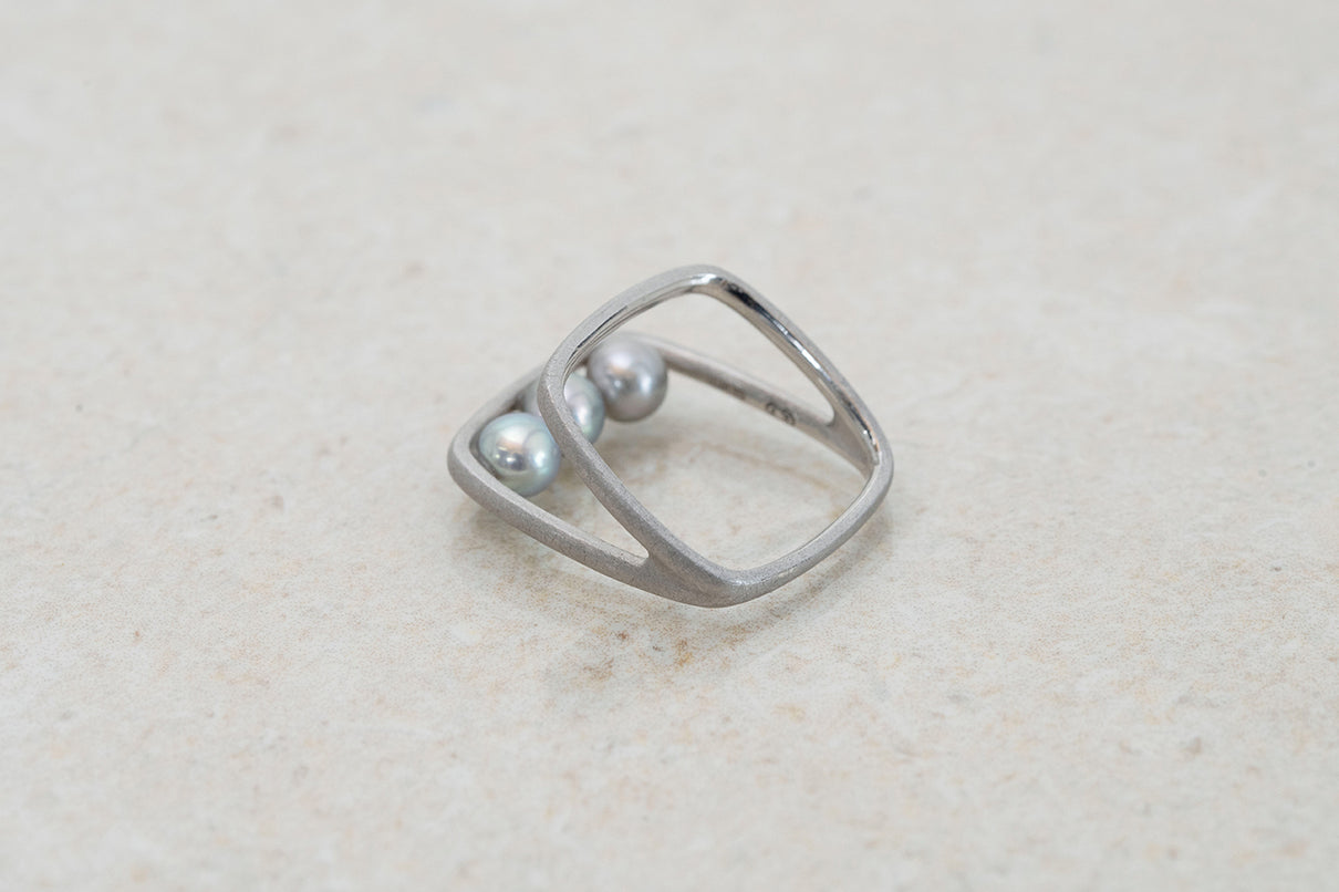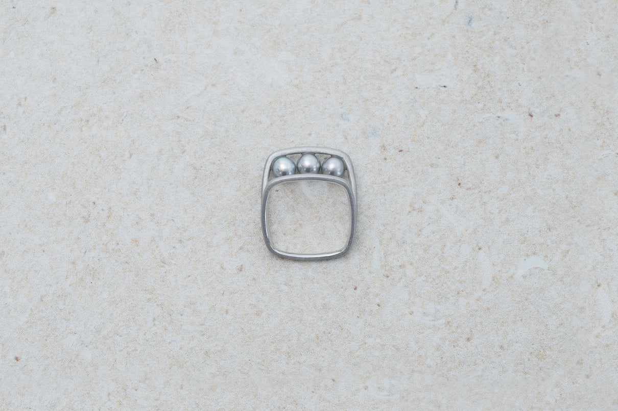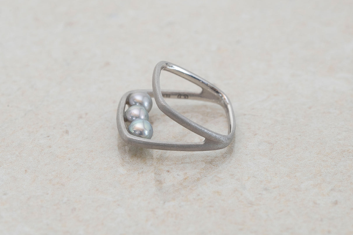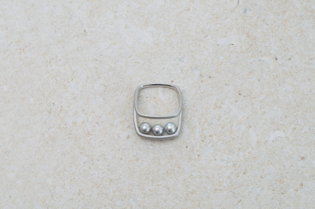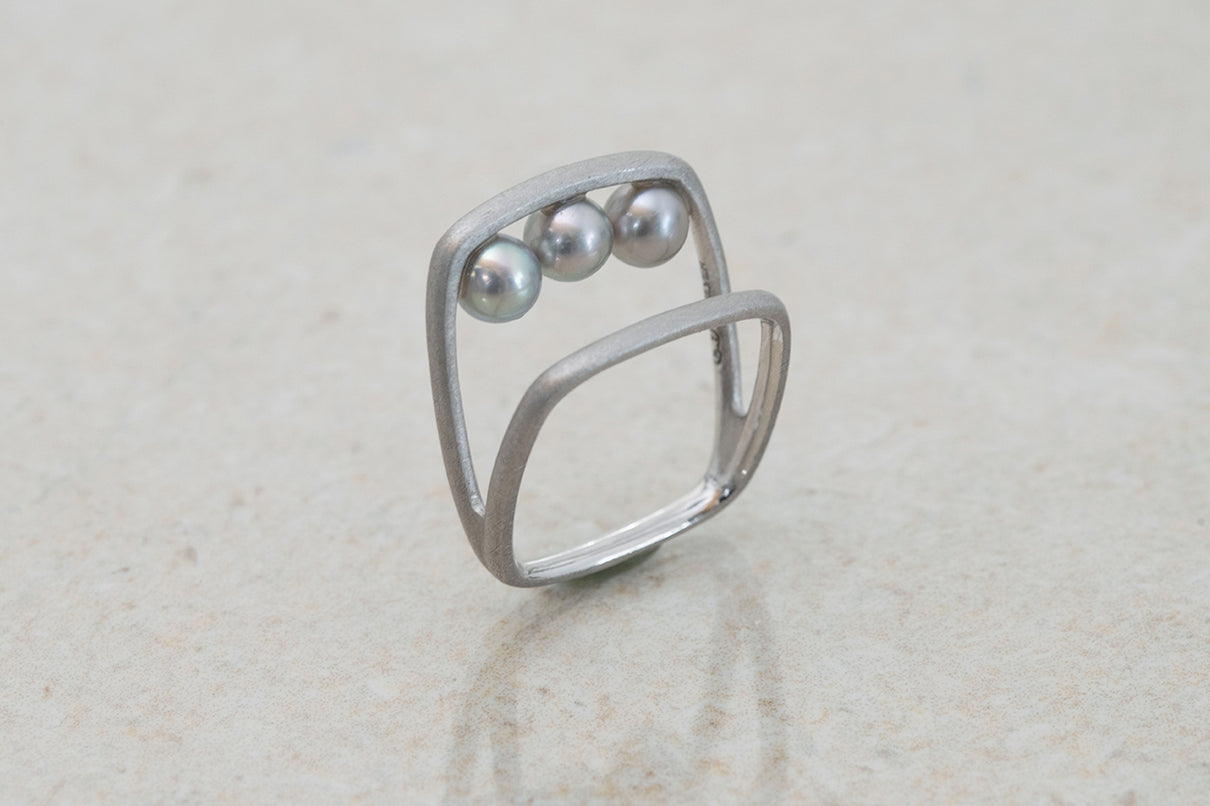 Syami ringのフォルムを生かし軽やかなダブルアームにデザインしたリング。身につけると2本のリングを纏っているような空間が生まれる、建築的な構造が魅力です。片側のアームに高さを持たせ、内側に三粒の艶やかなパールをあしらうことで、シンプルながらユニークな存在感が生まれました。生産量が減少傾向にあり、入手が困難なグレーパール。そのため、こちらのグレーパールのデザインは数量限定でのお仕立てとなります。表面はマットテクスチャーを施した柔らかな仕上げ。四角いフォルムのリングは回りにくく、また光沢仕上げをした内側は指に沿うよう緩やかなカーブを描いており、そのなめらかなフィット感は身に付けるのが楽しみになる程。気兼ねなくデイリーに楽しむリングとしてもお勧めです。本商品は約12号 , 約15号の2サイズ展開です。(四角いリングのためサイズ直し不可となります。)