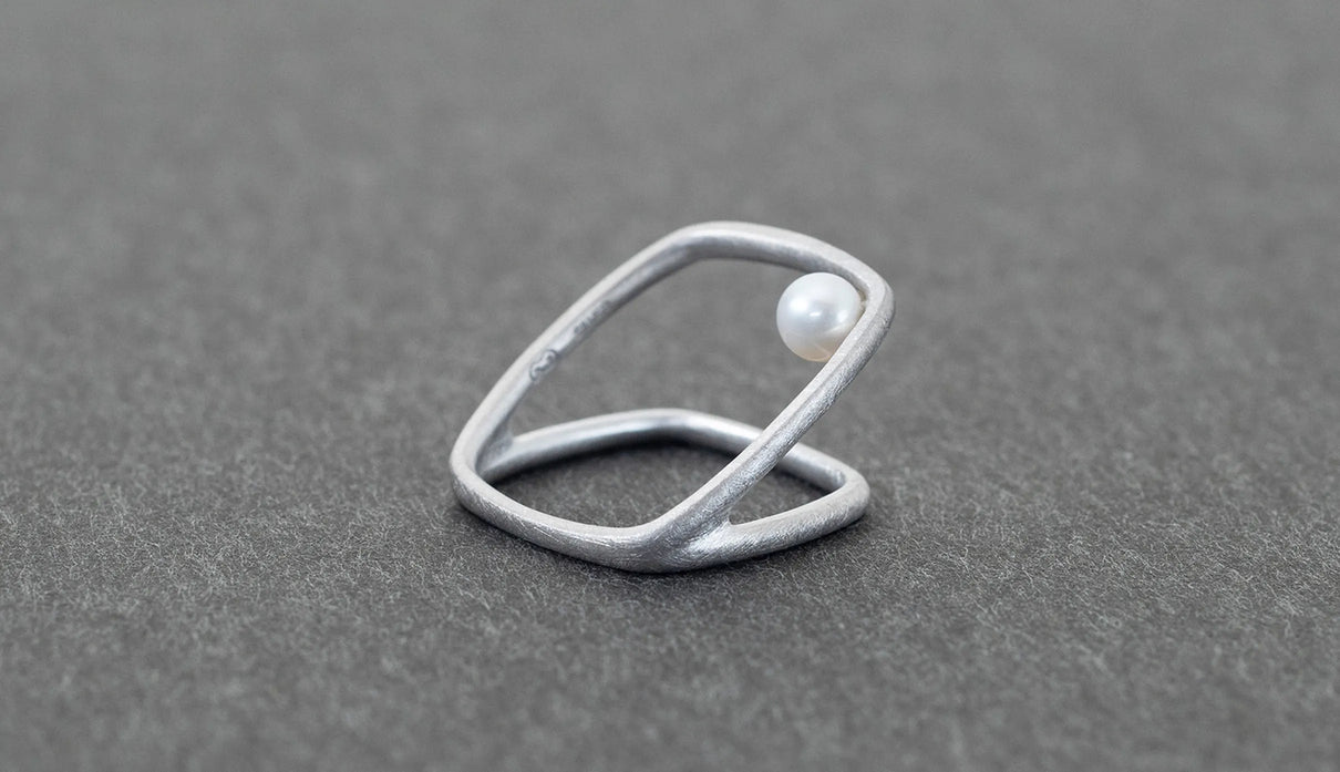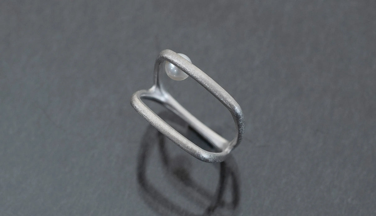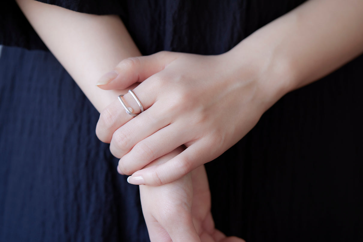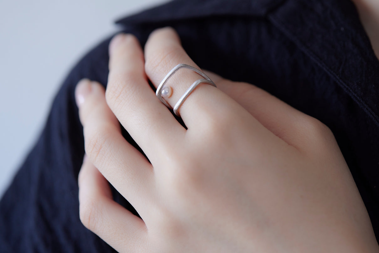 Syami ringのフォルムを生かし、軽やかなダブルアームに仕立てたリング。身につけると2本のリングを纏っているような空間が生まれる、建築的な構造が魅力です。片側のアームに高さを持たせ、内側に一粒の艶やかなパールをあしらうことで、シンプルながらユニークな存在感が生まれました。表面はマットテクスチャーを施した柔らかな仕上げ。四角いフォルムのリングは回りにくく、また光沢仕上げをした内側は指に沿うよう緩やかなカーブを描いており、そのなめらかなフィット感は身に付けるのが楽しみになる程。気兼ねなくデイリーに楽しむリングとしてもお勧めです。本商品は約9号 , 12号 , 15号の3展開です。(四角いリングのためサイズ直し不可となります。)