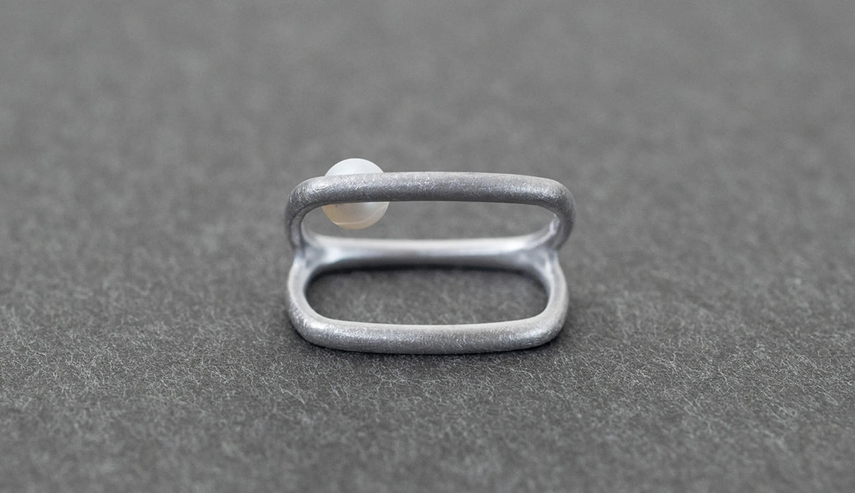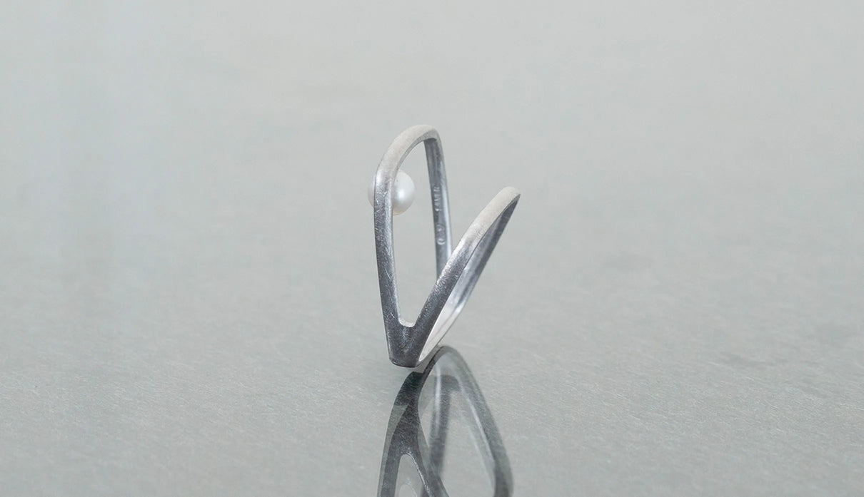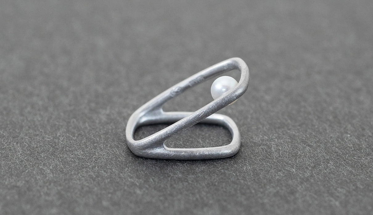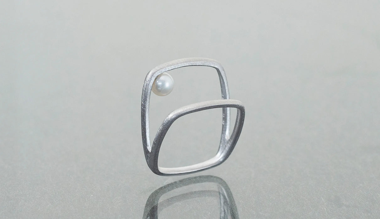 Syami ringのフォルムを生かし、軽やかなダブルアームに仕立てたリング。身につけると2本のリングを纏っているような空間が生まれる、建築的な構造が魅力です。片側のアームに高さを持たせ、内側に一粒の艶やかなパールをあしらうことで、シンプルながらユニークな存在感が生まれました。表面はマットテクスチャーを施した柔らかな仕上げ。四角いフォルムのリングは回りにくく、また光沢仕上げをした内側は指に沿うよう緩やかなカーブを描いており、そのなめらかなフィット感は身に付けるのが楽しみになる程。気兼ねなくデイリーに楽しむリングとしてもお勧めです。本商品は約9号 , 12号 , 15号の3展開です。(四角いリングのためサイズ直し不可となります。)