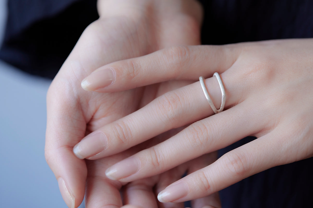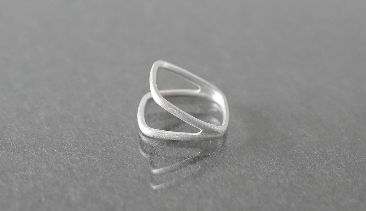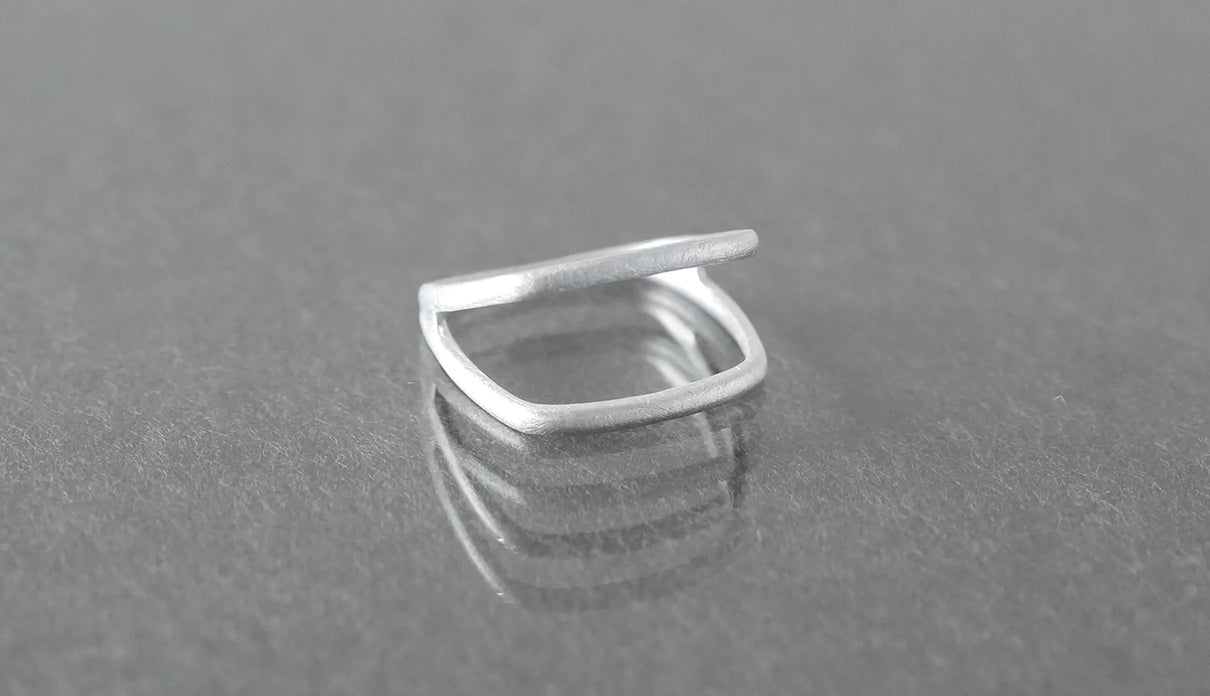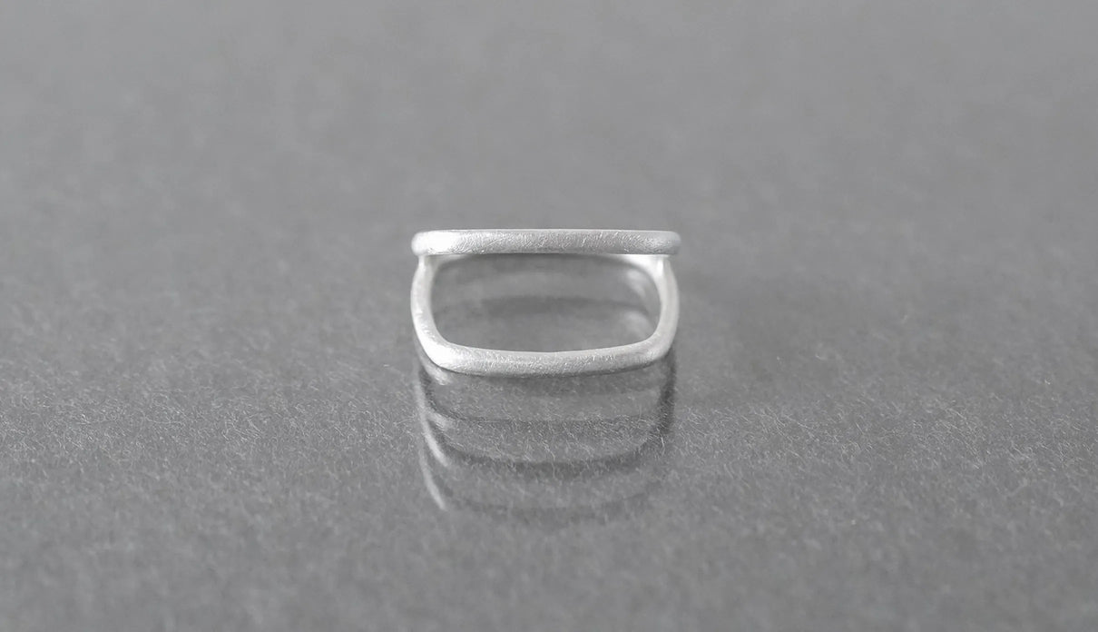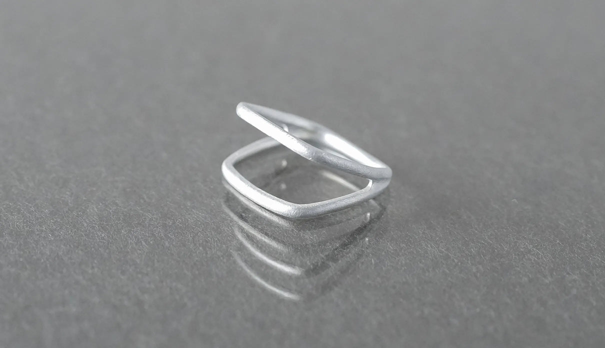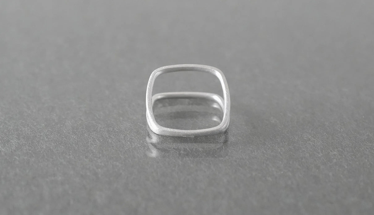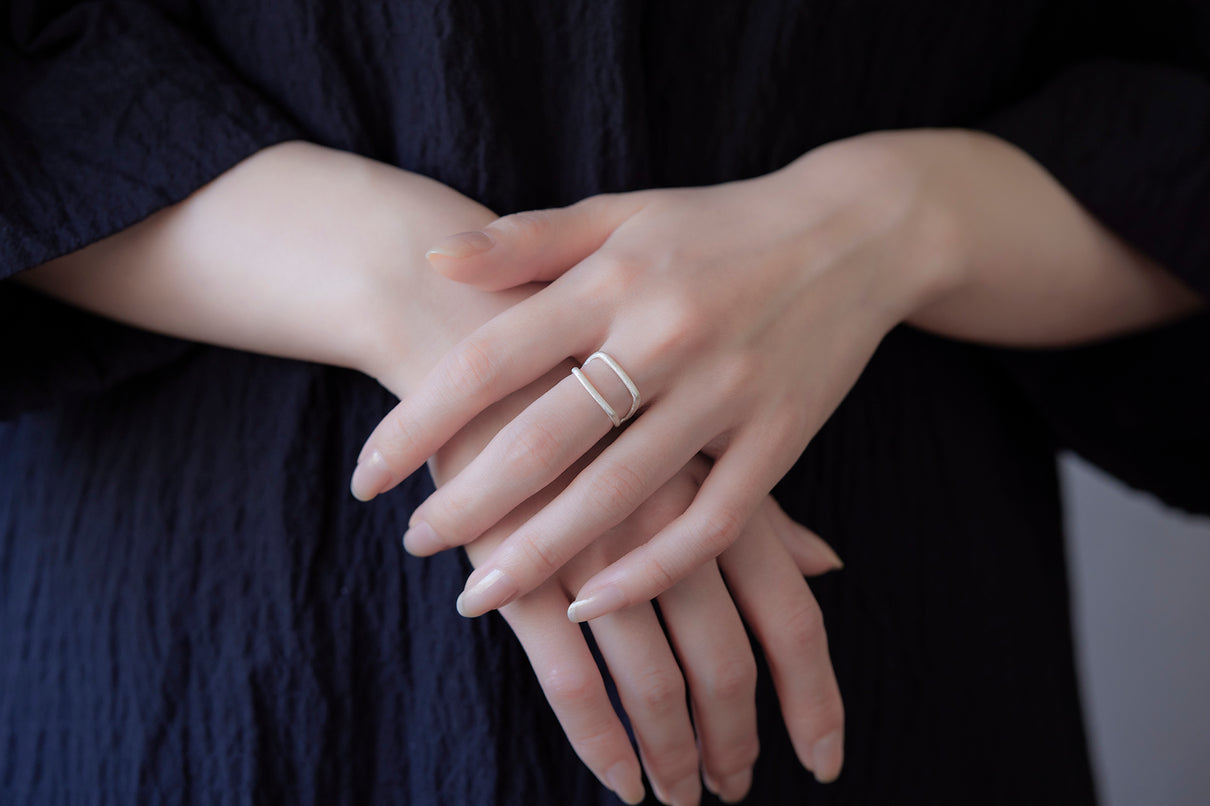 Syami ringのフォルムを生かし、軽やかなダブルアームに仕立てたリング。身につけると2本のリングを纏っているような空間が生まれる、建築的な構造が魅力です。表面はマットテクスチャーを施した柔らかな仕上げ。四角いフォルムのリングは回りにくく、また光沢仕上げをした内側は指に沿うよう緩やかなカーブを描いており、そのなめらかなフィット感は身に付けるのが楽しみになる程。気兼ねなくデイリーに楽しむリングとしてもお勧めです。本商品は約9号 , 12号 , 15号の3展開です。(四角いリングのためサイズ直し不可となります。)
