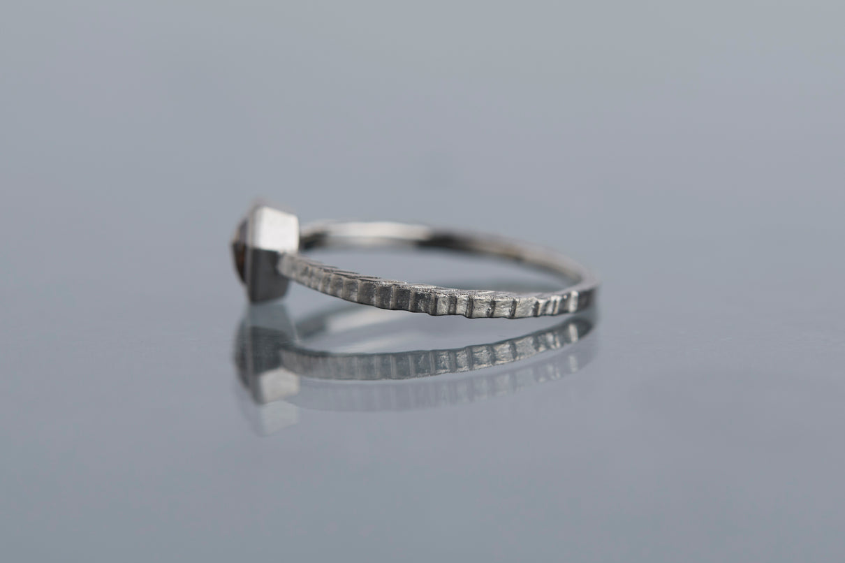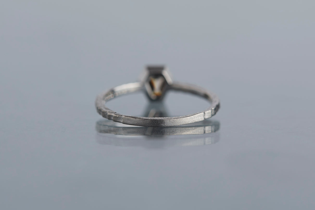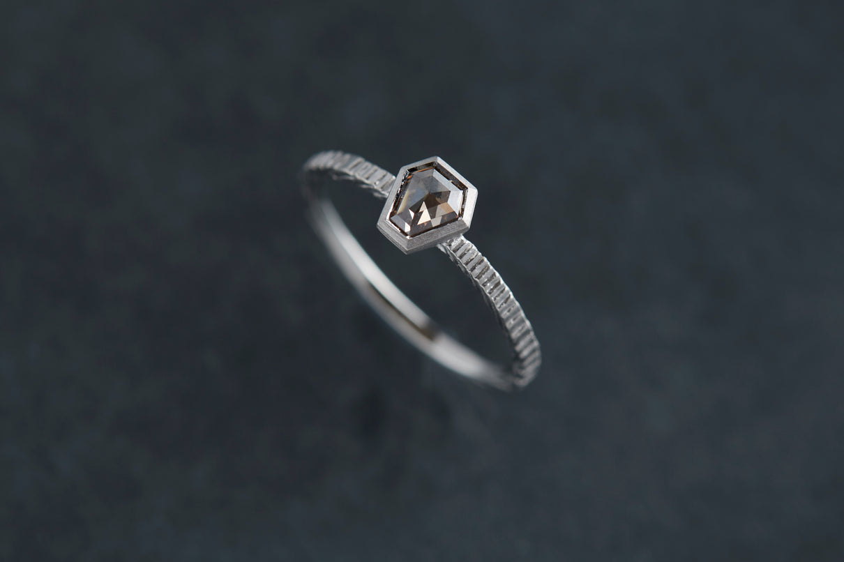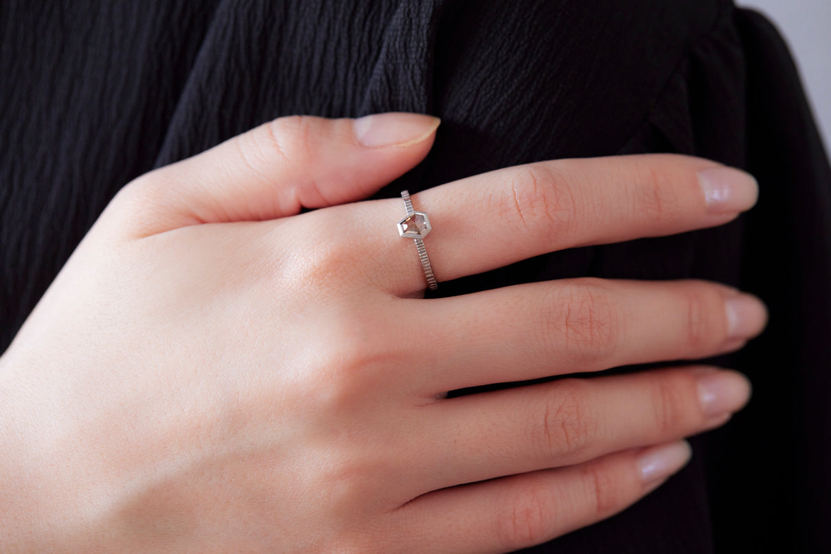 "立ち止まり、目を向ければ 大切なことは 変わらずいつもそこに在る ー" 2023 collection 「Unknown knowns」シリーズのリングをベースに、さりげなく個性を放ち、気品漂うシールドのようなフォルムのクラシカルなカットのダイヤモンドを留めた1点物のリングです。限りなくクリアに近く透明度の高い、ほのかにブラウンを感じさせるグレーカラーを纏ったダイヤモンド。細身のアームは軽やかな付け心地で、普段使いのリングとしてもおすすめです。