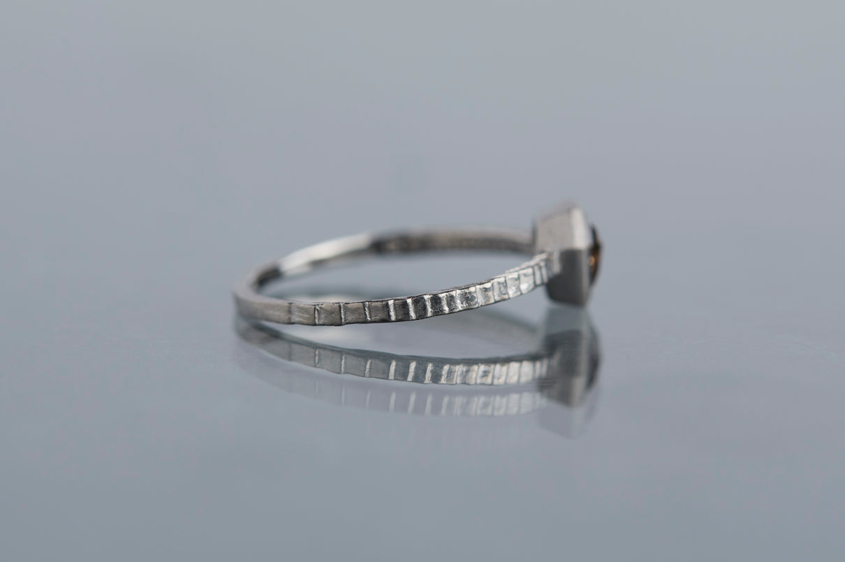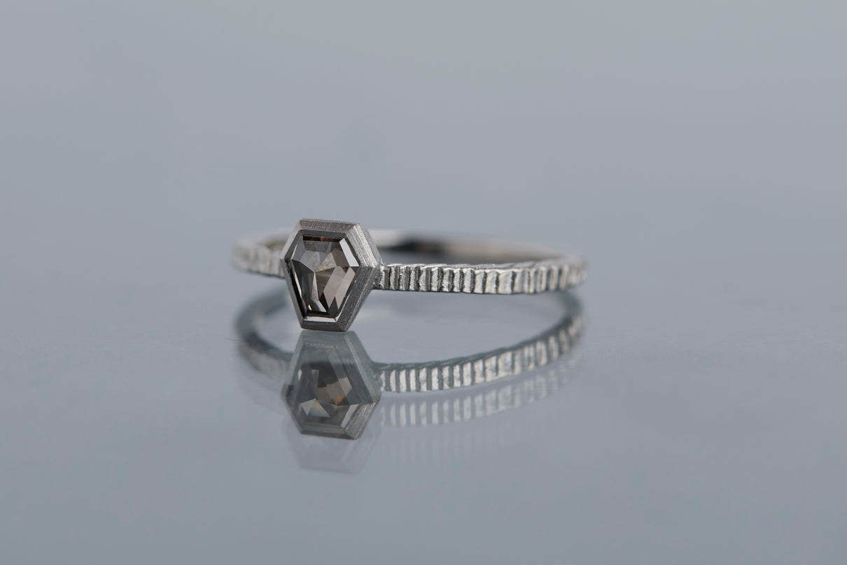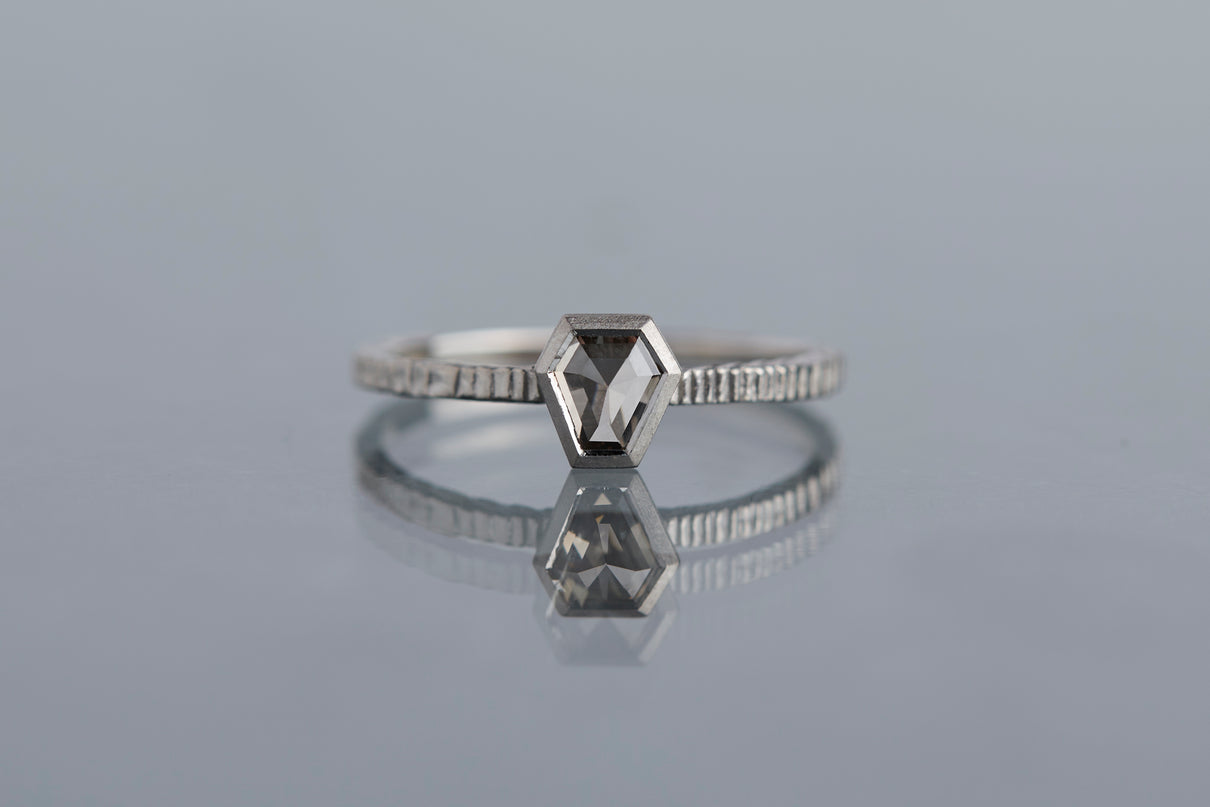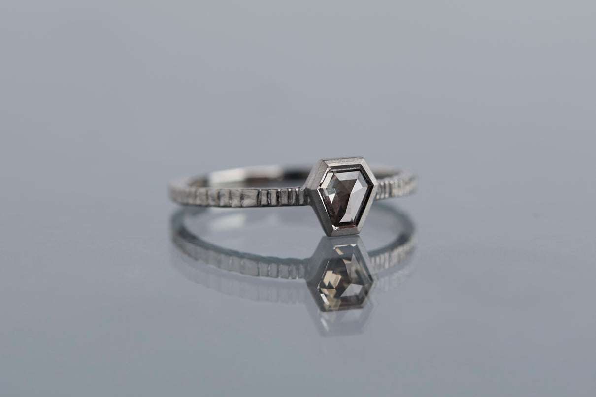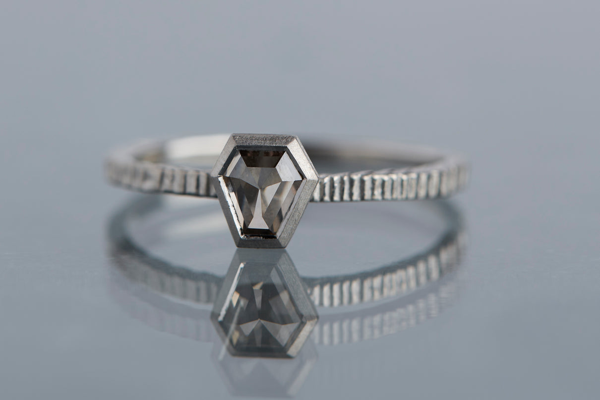 "立ち止まり、目を向ければ 大切なことは 変わらずいつもそこに在る ー" 2023 collection 「Unknown knowns」シリーズのリングをベースに、さりげなく個性を放ち、気品漂うシールドのようなフォルムのクラシカルなカットのダイヤモンドを留めた1点物のリングです。限りなくクリアに近く透明度の高い、ほのかにブラウンを感じさせるグレーカラーを纏ったダイヤモンド。細身のアームは軽やかな付け心地で、普段使いのリングとしてもおすすめです。