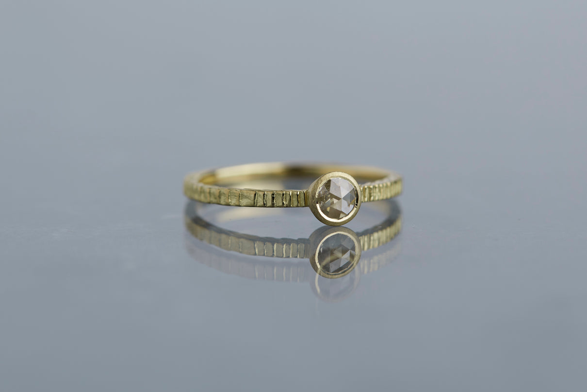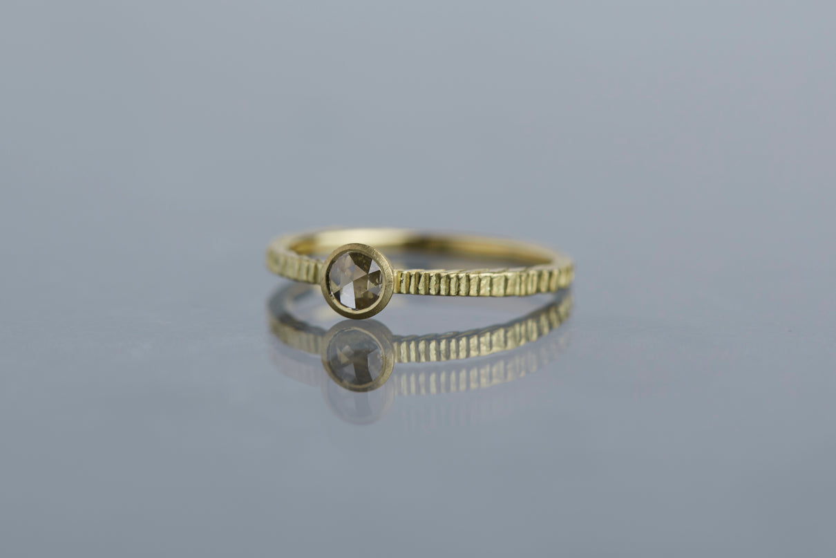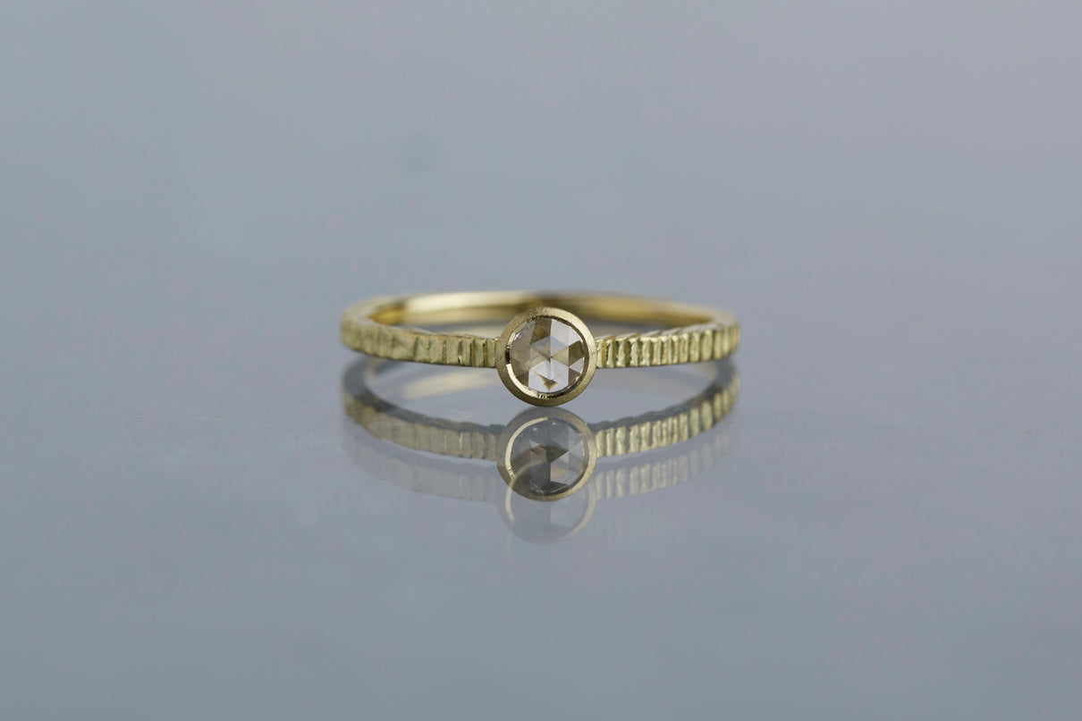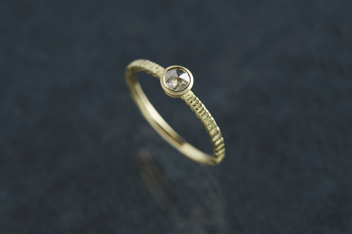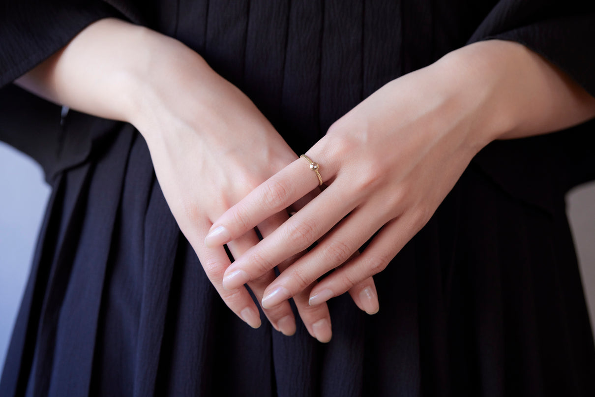 "立ち止まり、目を向ければ 大切なことは 変わらずいつもそこに在る ー" 2023 collection 「Unknown knowns」シリーズのリングをベースに、水滴のような瑞々しい煌めきを放つローズカットのダイヤモンドを留めた1点物のリングです。ごく僅かにグレー色を帯びた透明度の高いカラーのダイヤモンド。湖面に優しい陽の光がゆっくりと注いだような情景を思わせる、柔らかな輝きをお楽しみいただけます。細身のアームは軽やかな付け心地で、普段使いのリングとしてもおすすめです。