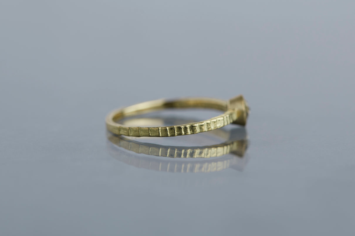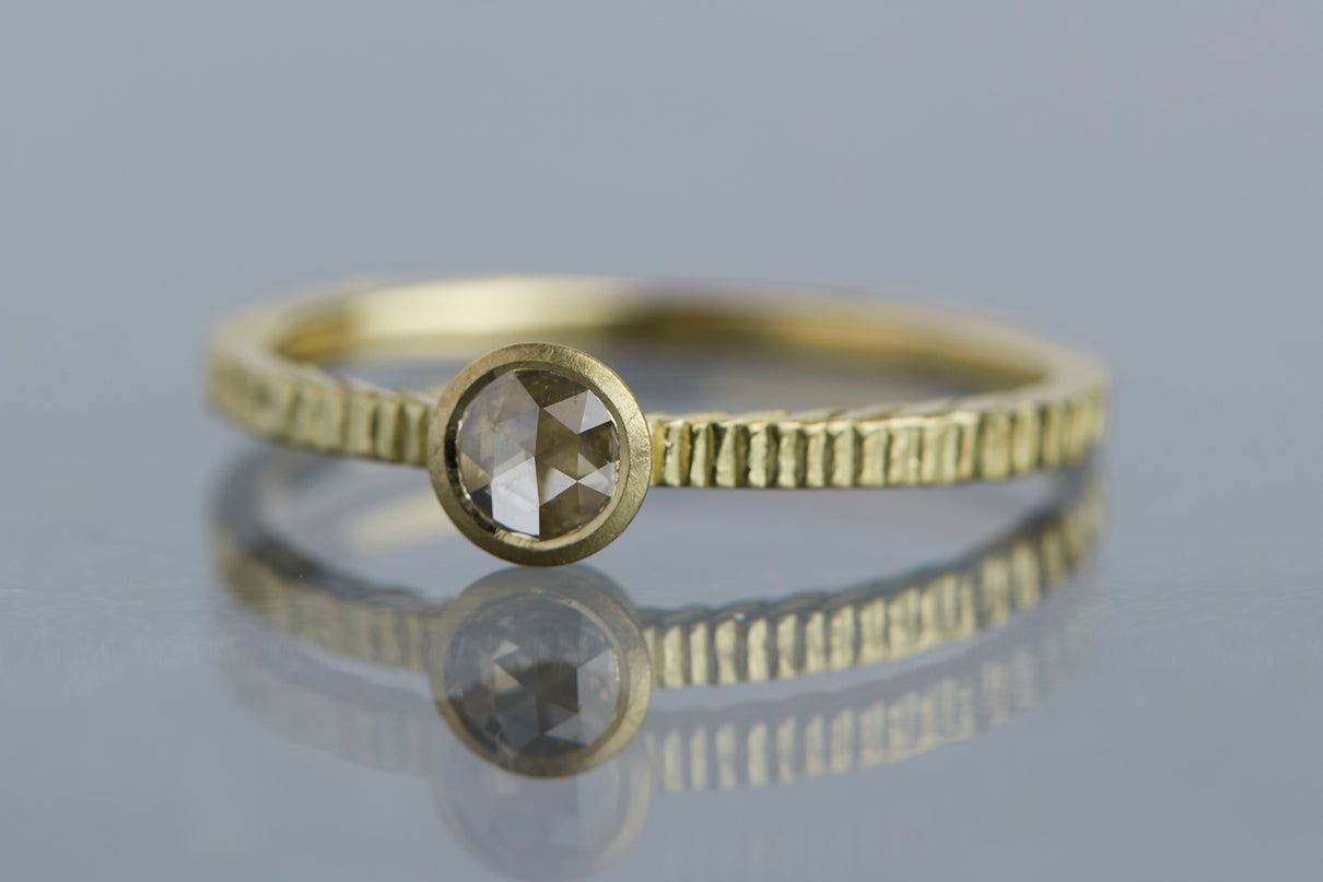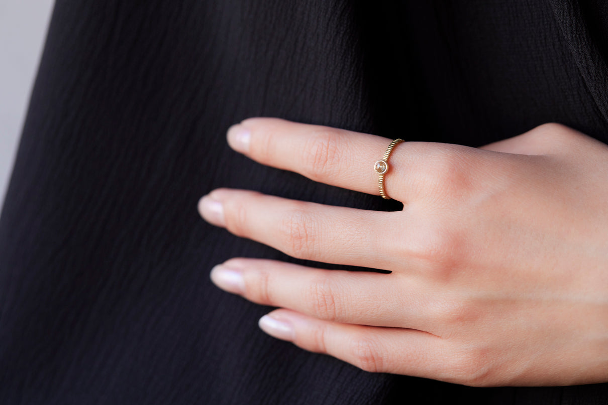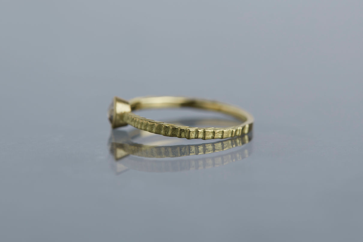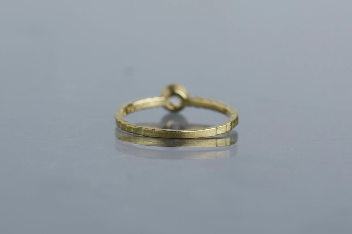 "立ち止まり、目を向ければ 大切なことは 変わらずいつもそこに在る ー" 2023 collection 「Unknown knowns」シリーズのリングをベースに、水滴のような瑞々しい煌めきを放つローズカットのダイヤモンドを留めた1点物のリングです。ごく僅かにグレー色を帯びた透明度の高いカラーのダイヤモンド。湖面に優しい陽の光がゆっくりと注いだような情景を思わせる、柔らかな輝きをお楽しみいただけます。細身のアームは軽やかな付け心地で、普段使いのリングとしてもおすすめです。