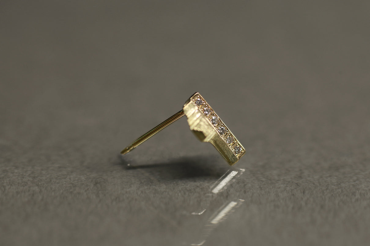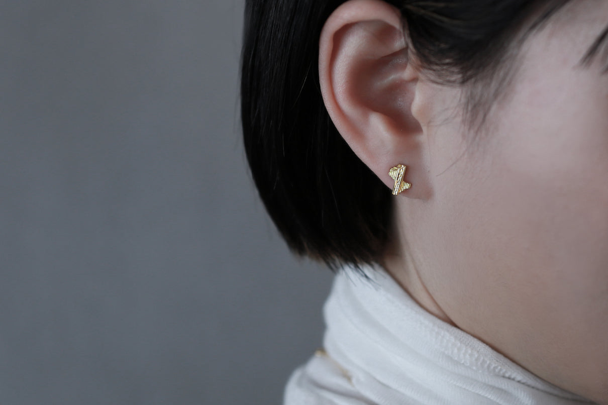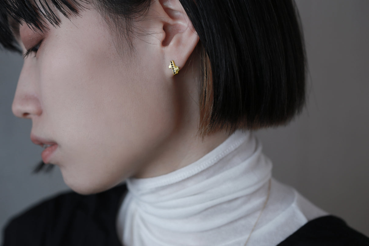 "立ち止まり、目を向ければ 大切なことは 変わらずいつもそこに在る ー" 2023 collection 「Unknown knowns」シリーズのスタッドピアス。時間と経験の蓄積を軌跡のように表す、幾重もの層になったアシンメトリーなデザインのK18ゴールドピアス中央には、クリアやカラーメレダイヤモンドを留め、その多角的な見え方をコンセプトに重ねました。6石に連なるメレダイヤモンドが繊細に煌めき、クリアダイヤモンドは清らかに華やぎ、ライトブラウンダイヤモンドは肌に馴染みの良いカラーで品良い印象に。ブラックダイヤモンドは個性が引き立ち、シックな印象を放ちます。装いを選ばない日々身につけやすいミニマムなサイズ感で、さりげない個性が耳元で華やぐアイテムです。(*ダイヤモンドはクリアダイヤモンド、ブラウンダイヤモンド、ブラックダイヤモンドの3種よりお選びください)