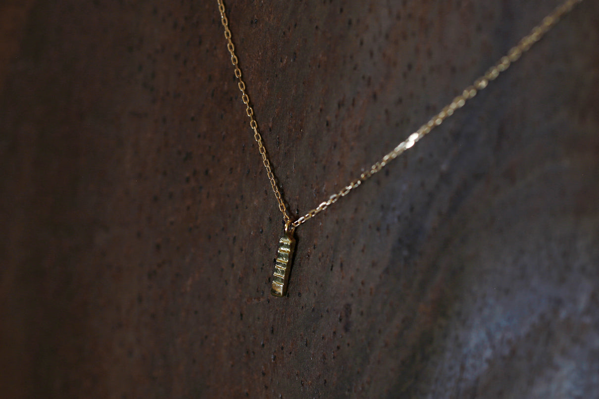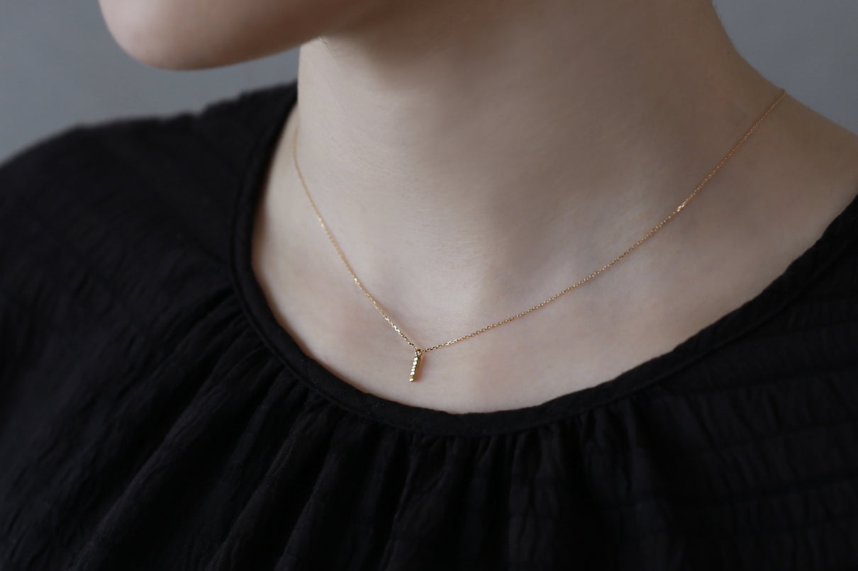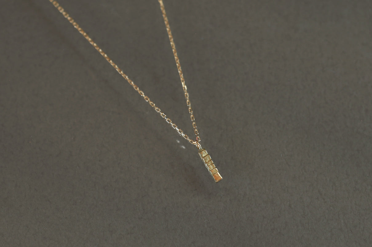 "立ち止まり、目を向ければ 大切なことは 変わらずいつもそこに在る ー" 2023 collection 「Unknown knowns」シリーズのネックレス。時間と経験の蓄積を軌跡のように表す、幾重もの層になったアシンメトリーなモチーフの先端にはきりりとした艶仕上げのアクセントを加え、その多角的な見え方をコンセプトに重ねました。シンプルながらもひと匙の個性を感じるデザインで、ひとつで身につけるのは勿論、ロングネックレスとの重ね付けにも活躍します。