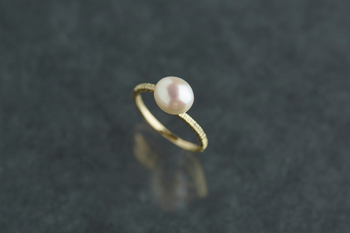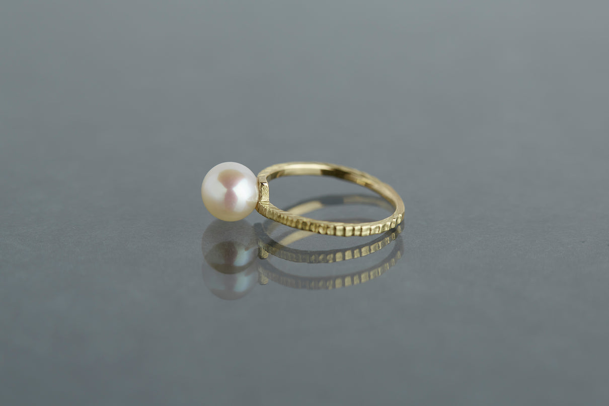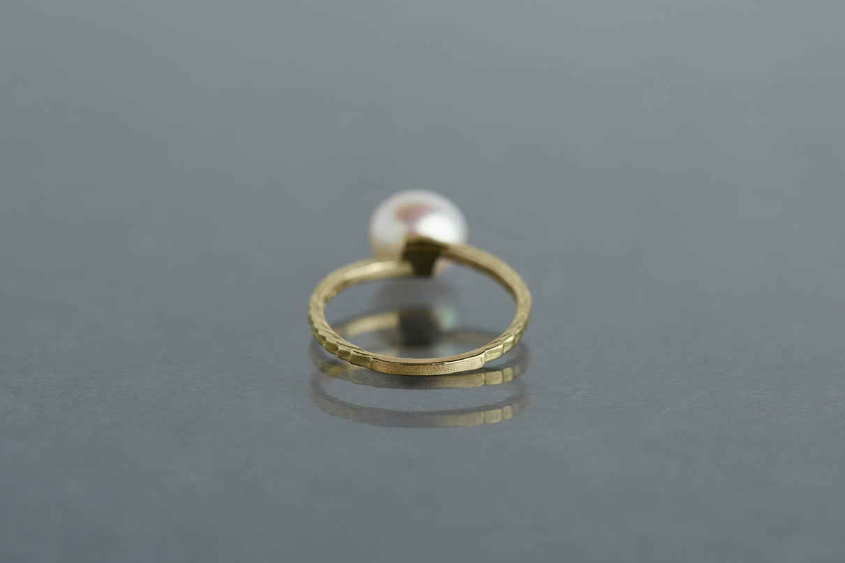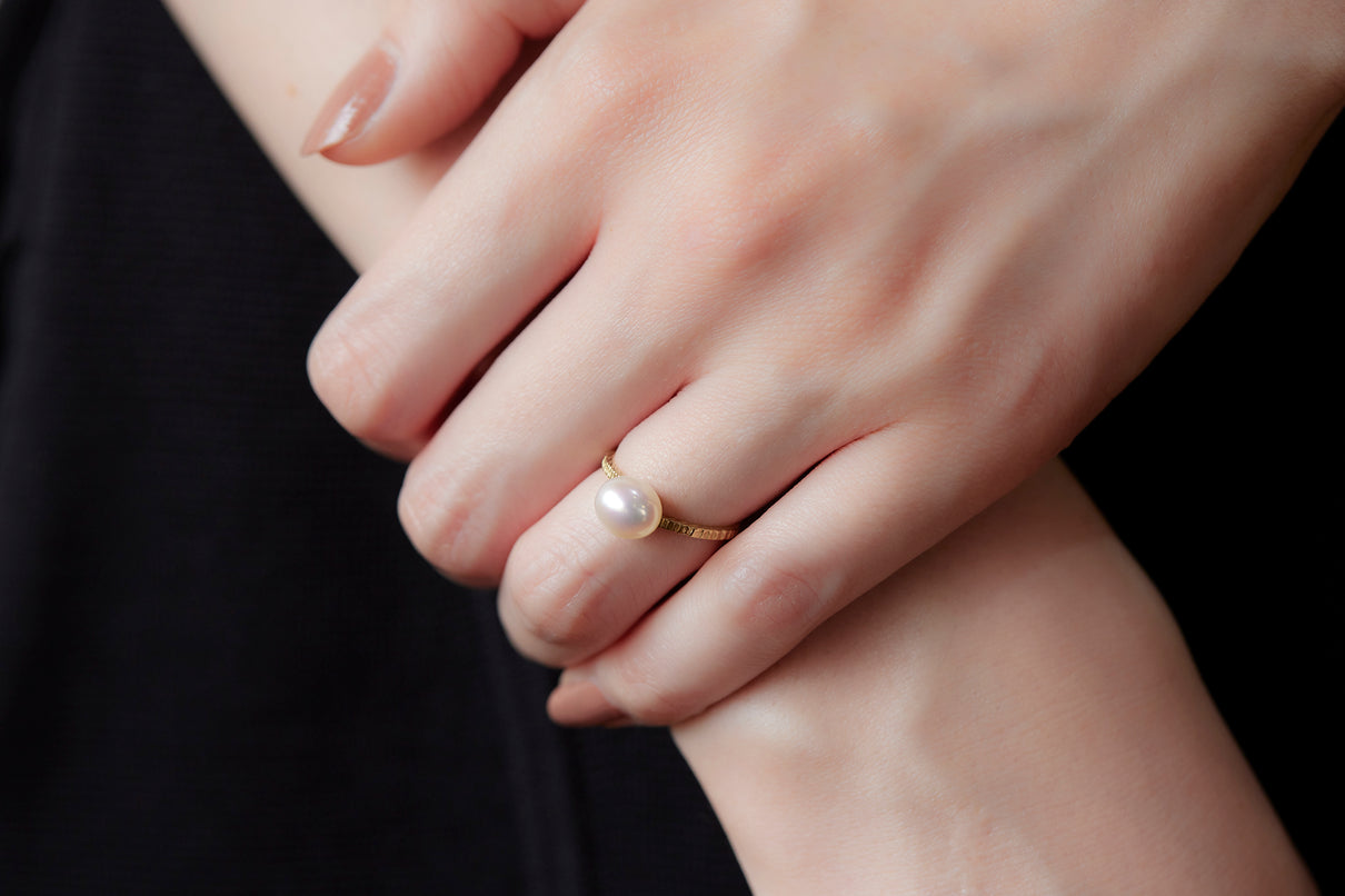 "立ち止まり、目を向ければ 大切なことは 変わらずいつもそこに在る ー" 2023 collection 「Unknown knowns」シリーズのリングベースに、美しいホワイトパールを留めたゴールドリング。揺らぎのある表情と、僅かに左右のアームがずれたデザインで、シンプルながらもひと匙の個性を感じます。手元で上品に艶めき、ひとつでも重ね付けにも活躍する軽やかな印象のパールリングです。