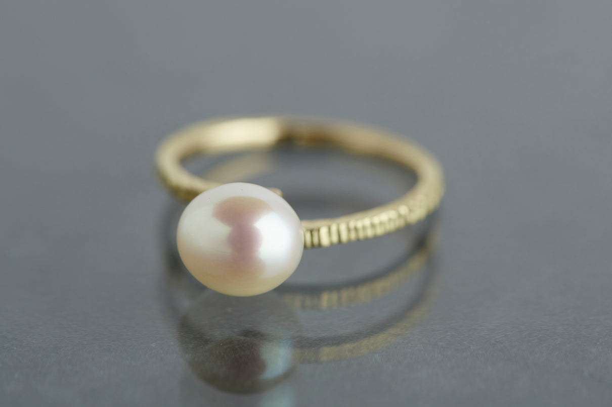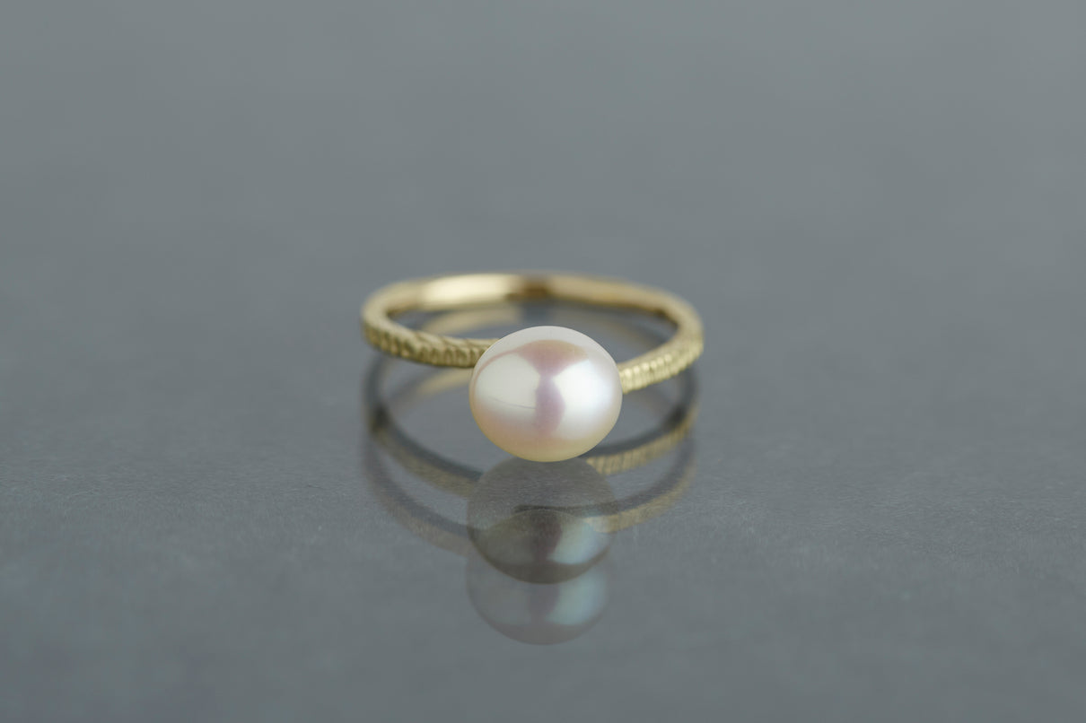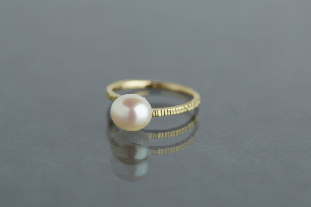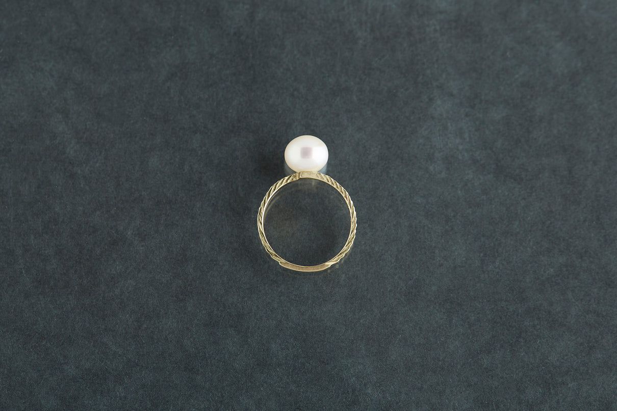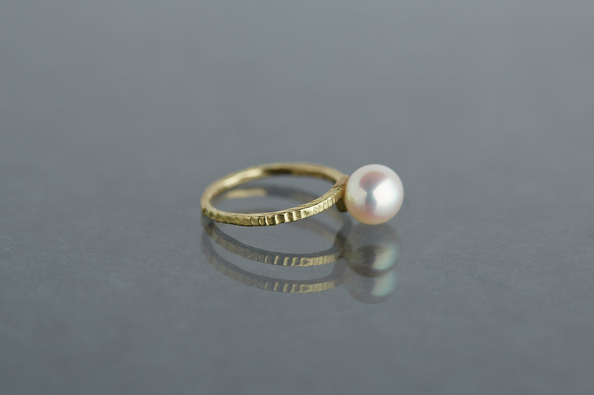"立ち止まり、目を向ければ 大切なことは 変わらずいつもそこに在る ー" 2023 collection 「Unknown knowns」シリーズのリングベースに、美しいホワイトパールを留めたゴールドリング。揺らぎのある表情と、僅かに左右のアームがずれたデザインで、シンプルながらもひと匙の個性を感じます。手元で上品に艶めき、ひとつでも重ね付けにも活躍する軽やかな印象のパールリングです。