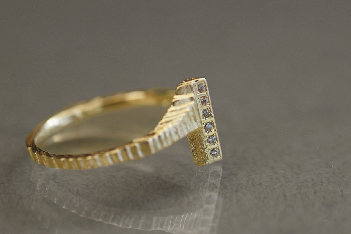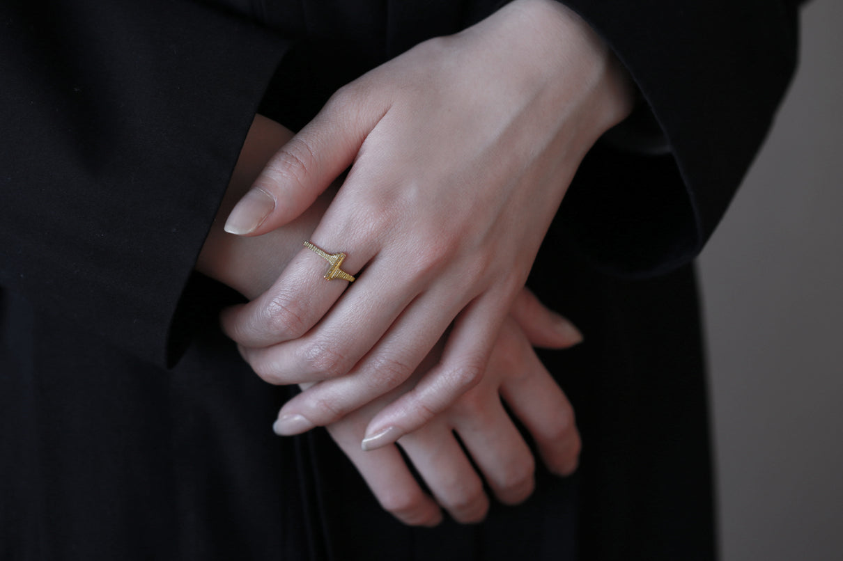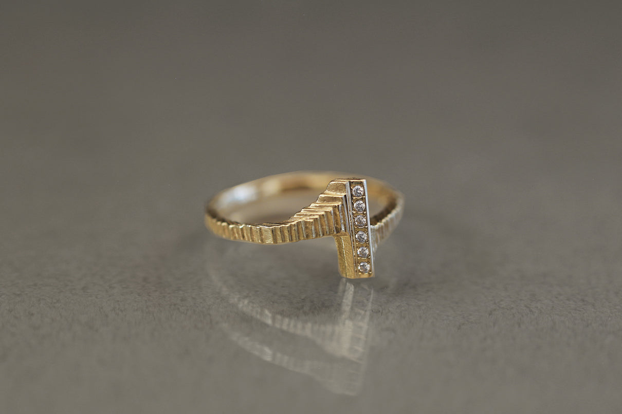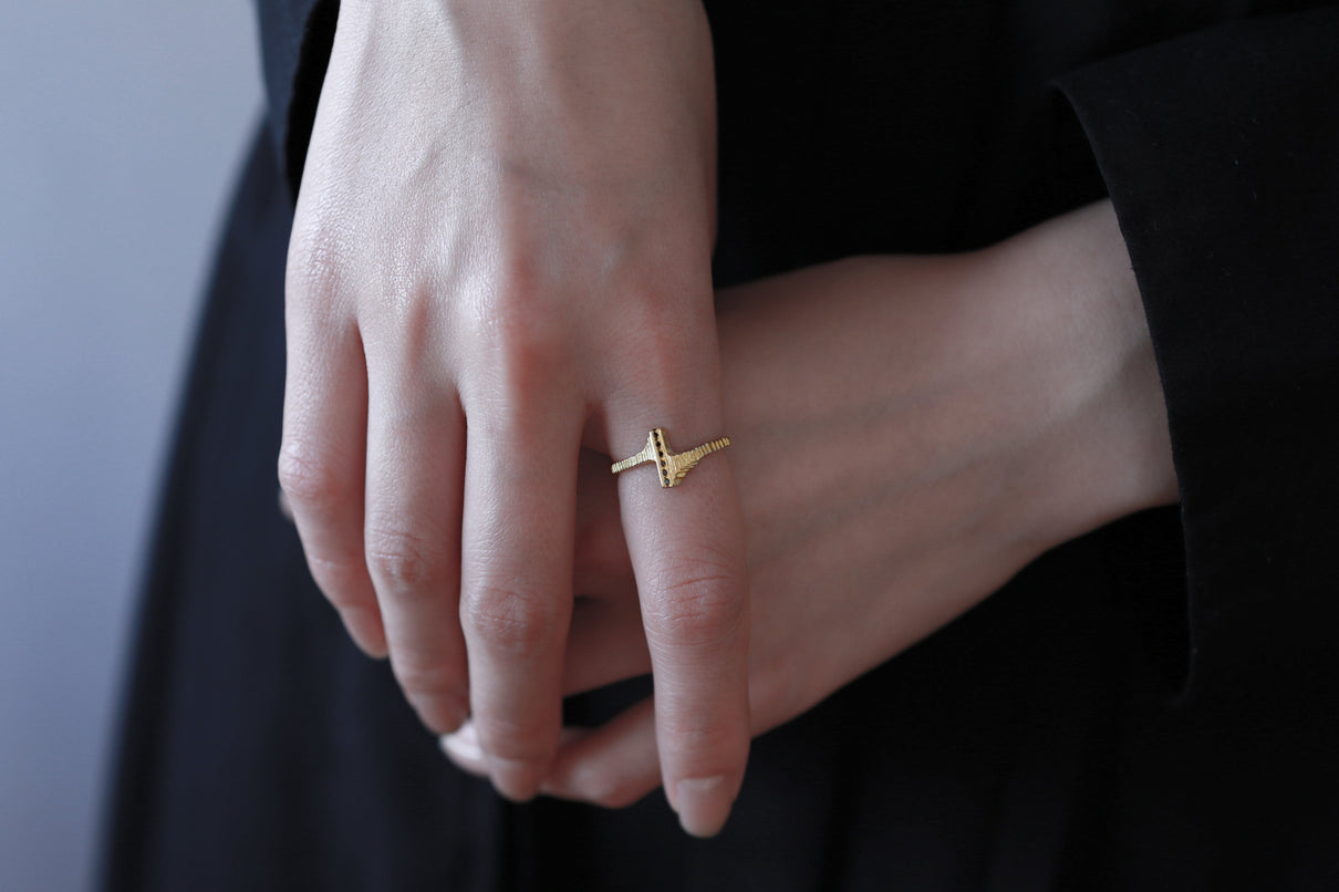 "立ち止まり、目を向ければ 大切なことは   変わらずいつもそこに在る ー" 2023 collection 「Unknown knowns」シリーズのリング。時間と経験の蓄積を軌跡のように表す、幾重もの層になったアシンメトリーなデザインのK18ゴールドのリング中央に、クリアダイヤモンドやカラーダイヤモンドを留め、その多角的な見え方をコンセプトに重ねました。6石に連なるメレダイヤモンドが繊細に煌めき、クリアダイヤモンドは清らかに華やぎ、ライトブラウンダイヤモンドは肌に馴染みの良いカラーで品良い印象に。ブラックダイヤモンドは個性が引き立ち、シックな印象を放つアイテムです。 (*ダイヤモンドはクリアダイヤモンド、ブラウンダイヤモンド、ブラックダイヤモンドの3種よりお選びください)