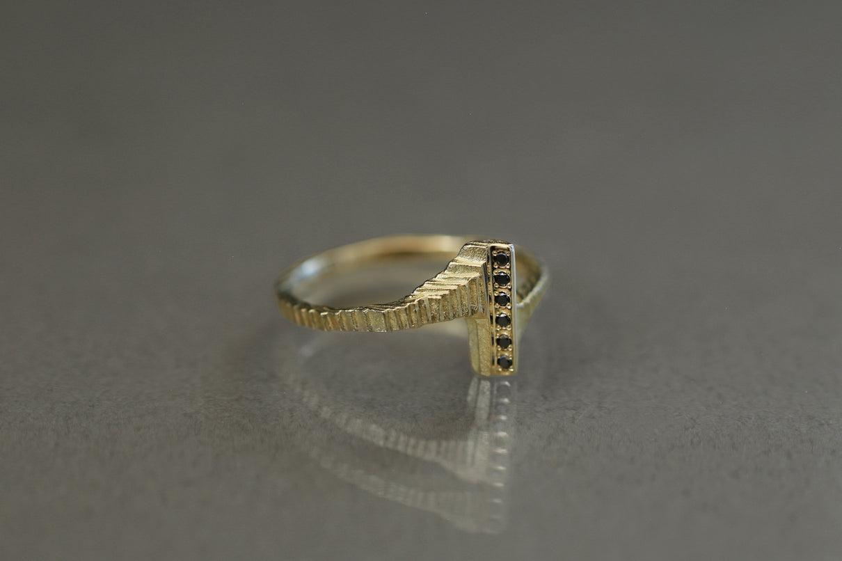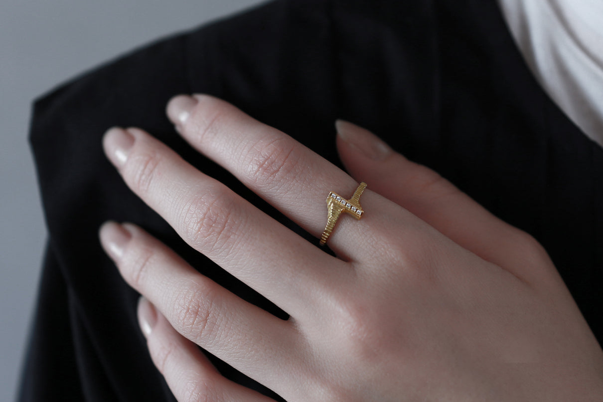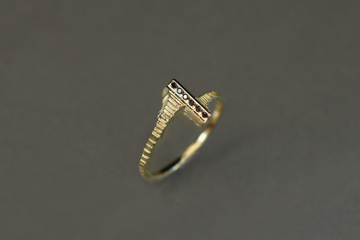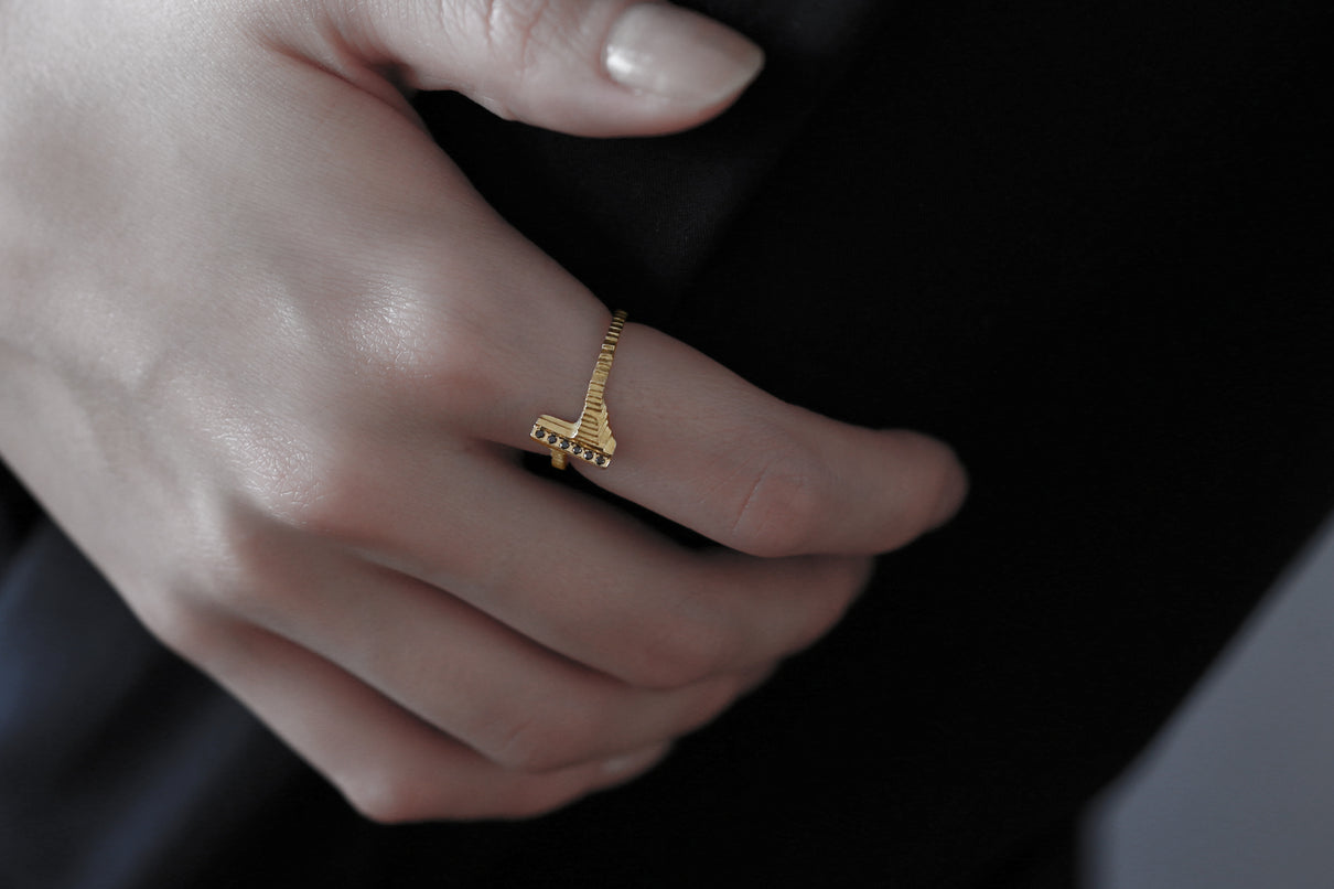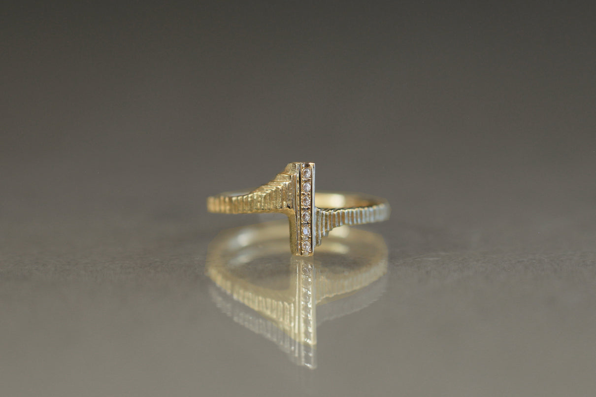 "立ち止まり、目を向ければ 大切なことは   変わらずいつもそこに在る ー" 2023 collection 「Unknown knowns」シリーズのリング。時間と経験の蓄積を軌跡のように表す、幾重もの層になったアシンメトリーなデザインのK18ゴールドのリング中央に、クリアダイヤモンドやカラーダイヤモンドを留め、その多角的な見え方をコンセプトに重ねました。6石に連なるメレダイヤモンドが繊細に煌めき、クリアダイヤモンドは清らかに華やぎ、ライトブラウンダイヤモンドは肌に馴染みの良いカラーで品良い印象に。ブラックダイヤモンドは個性が引き立ち、シックな印象を放つアイテムです。 (*ダイヤモンドはクリアダイヤモンド、ブラウンダイヤモンド、ブラックダイヤモンドの3種よりお選びください)